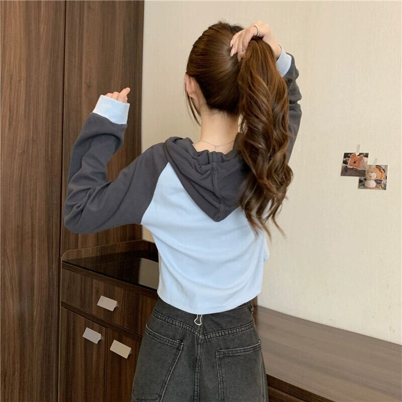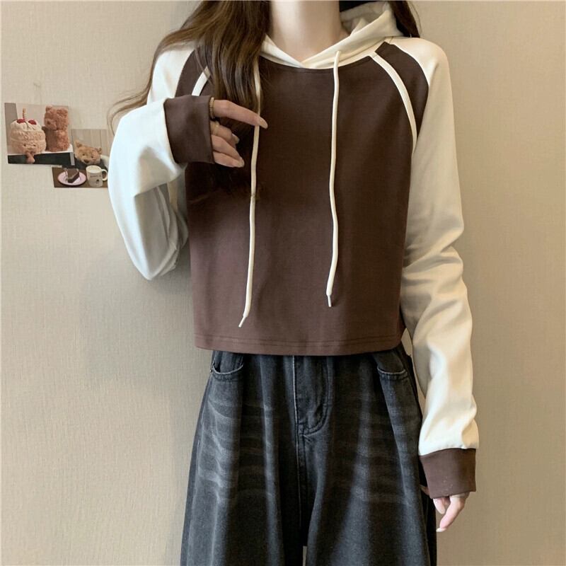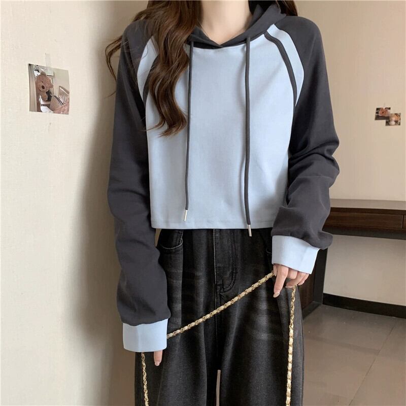 ラグランスリーブフード付きスウェットシャツの女性の2023秋冬新作人気デザインルーズで多用途なショートトップ小柄な人 オータム 秋物 ウィンター 冬物 7460069609800566 | framboise21