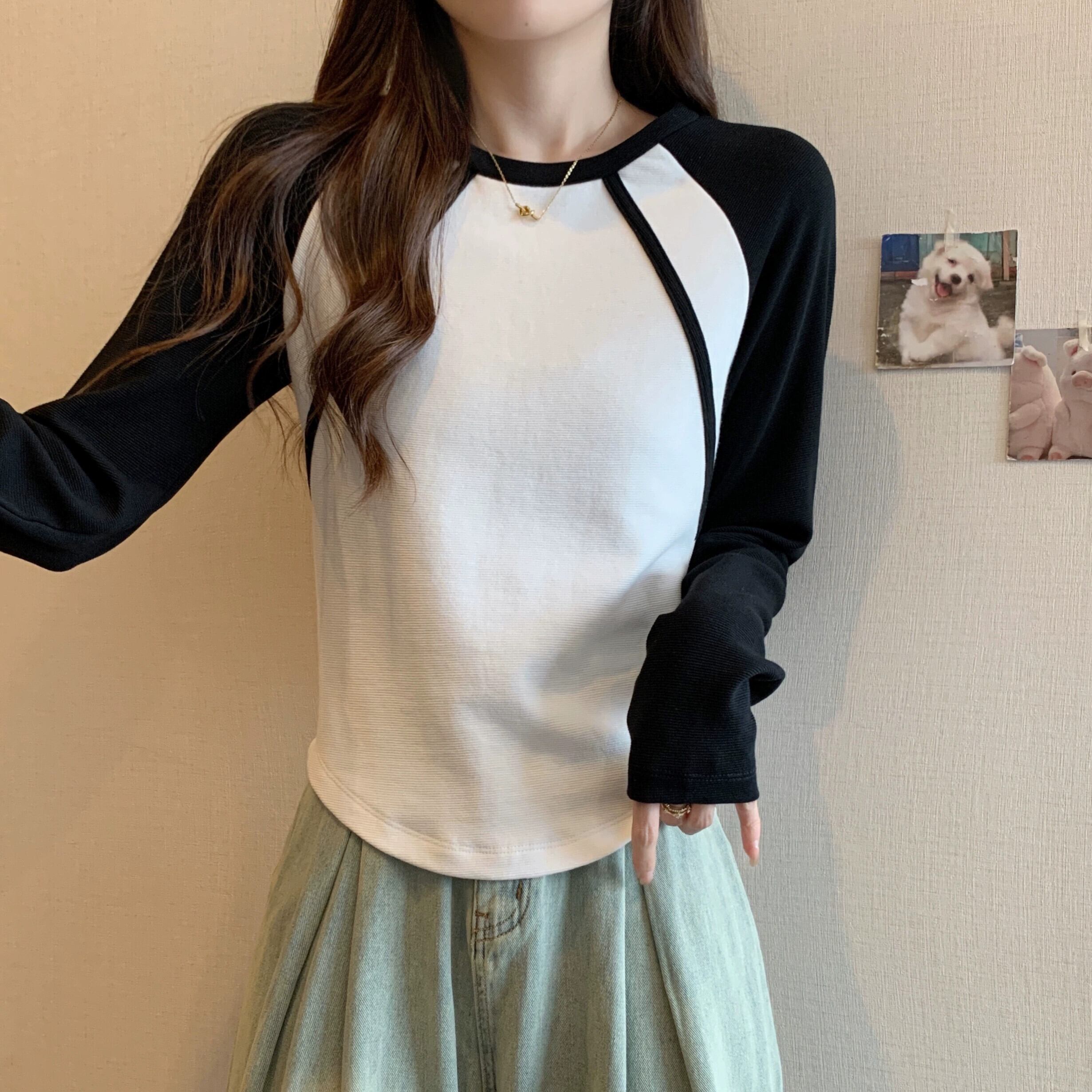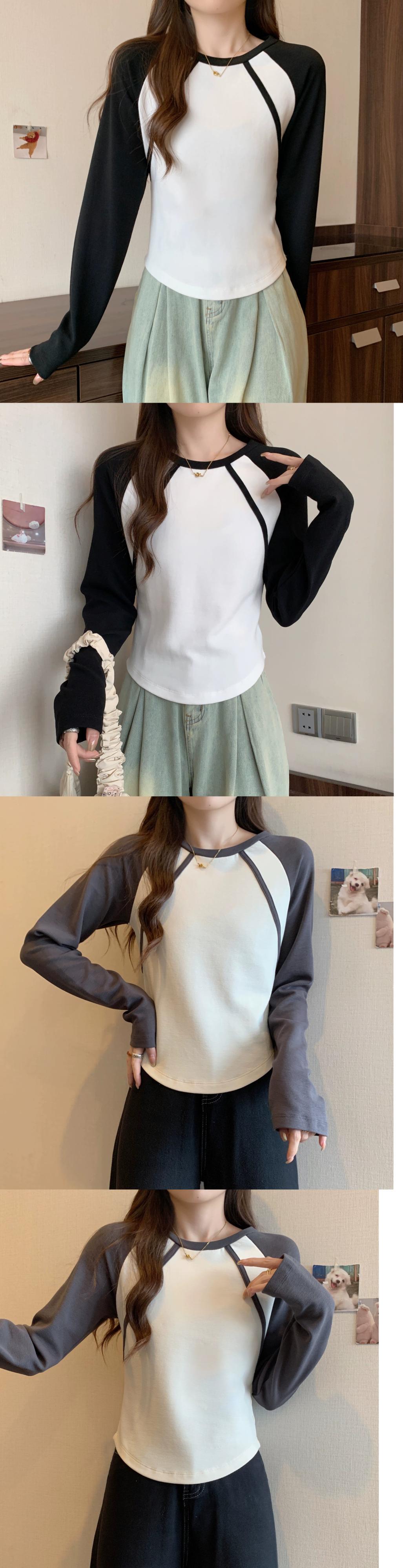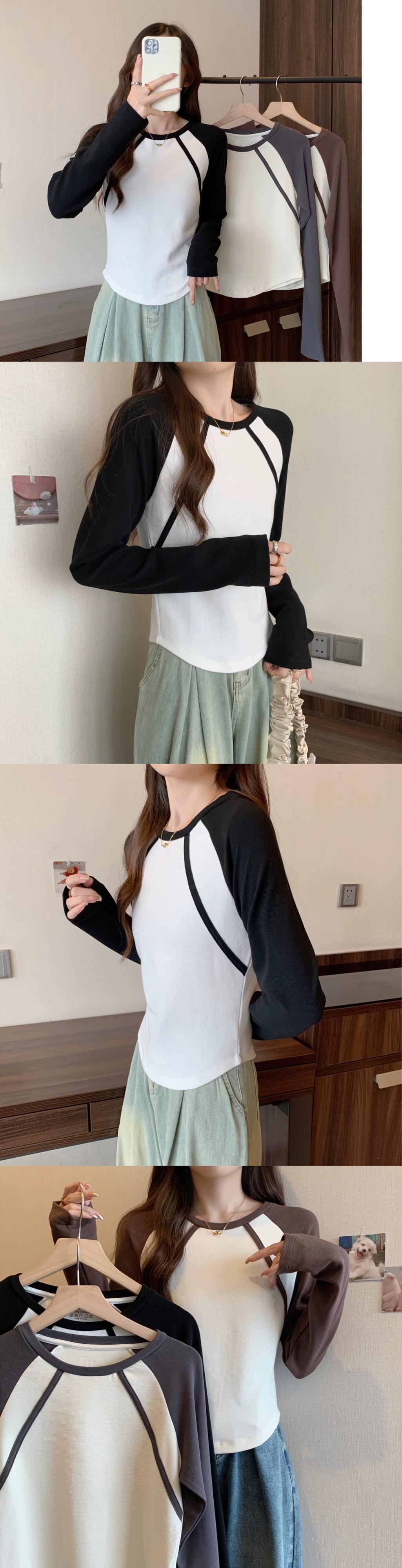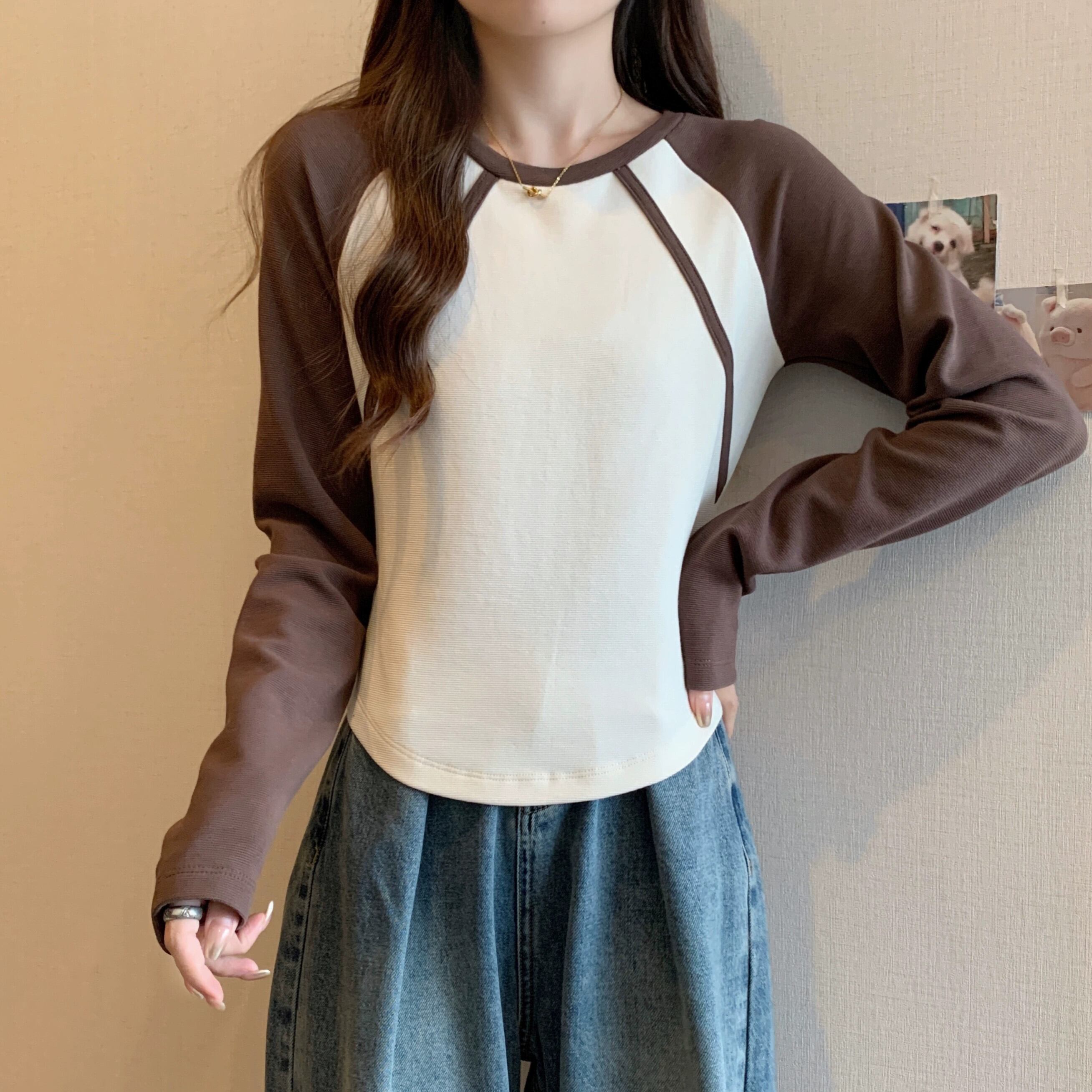不規則な曲線のショートボトムシャツの女性、春と秋のスタイル、アメリカンレトロスリムフィット、ラグラン長袖Tシャツ ロング スプリング 春物 オータム 秋物 74600879702276 | framboise21