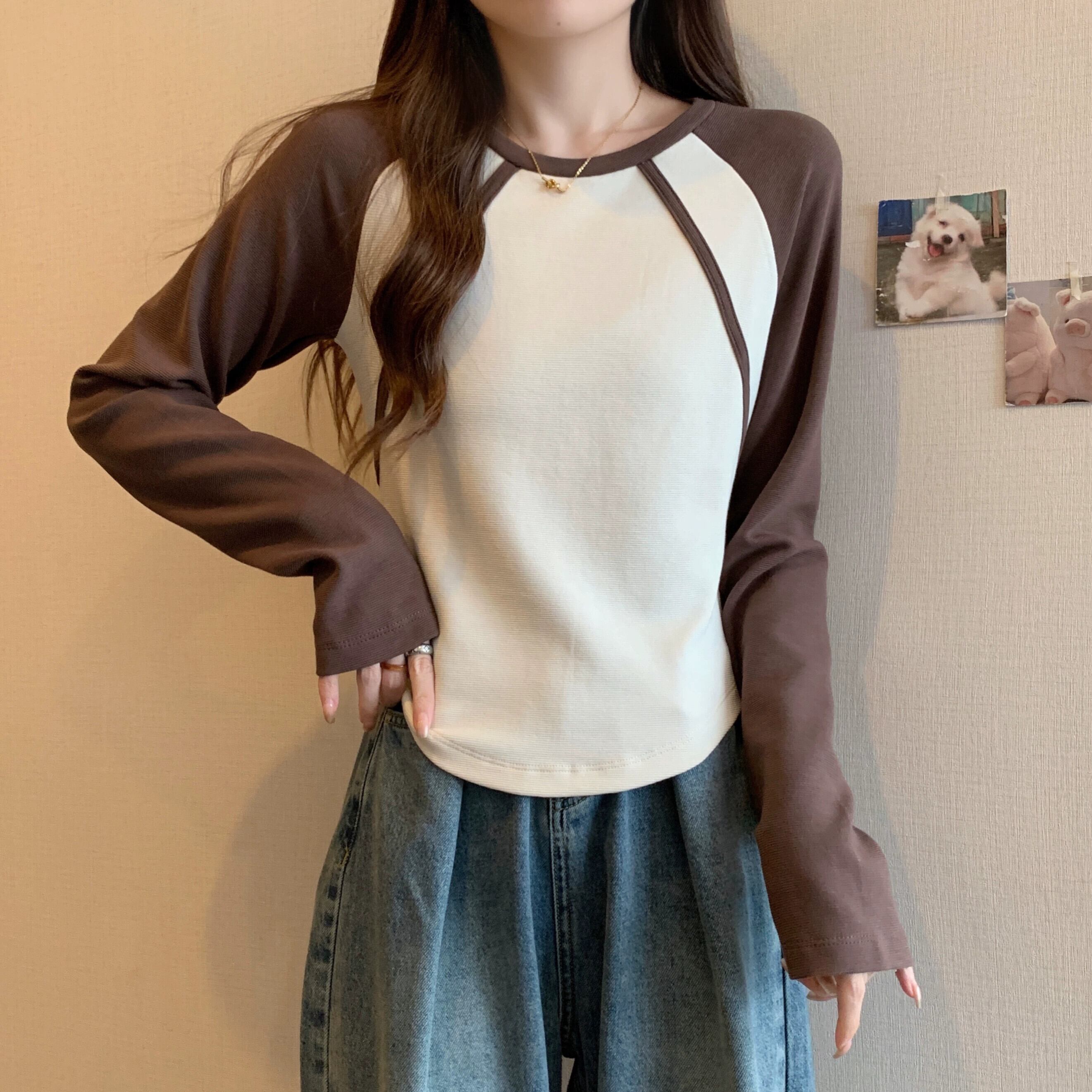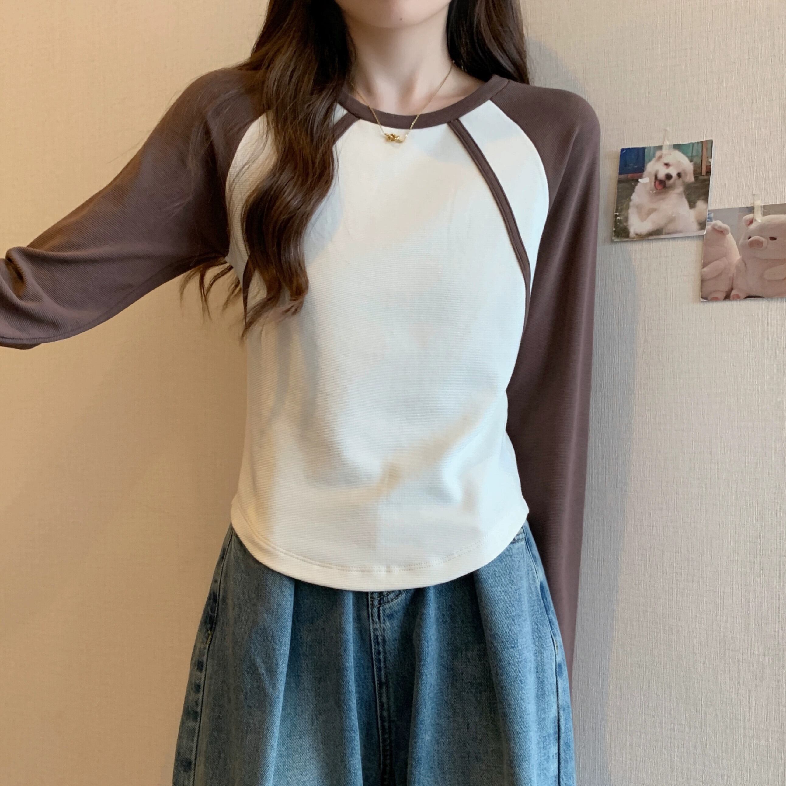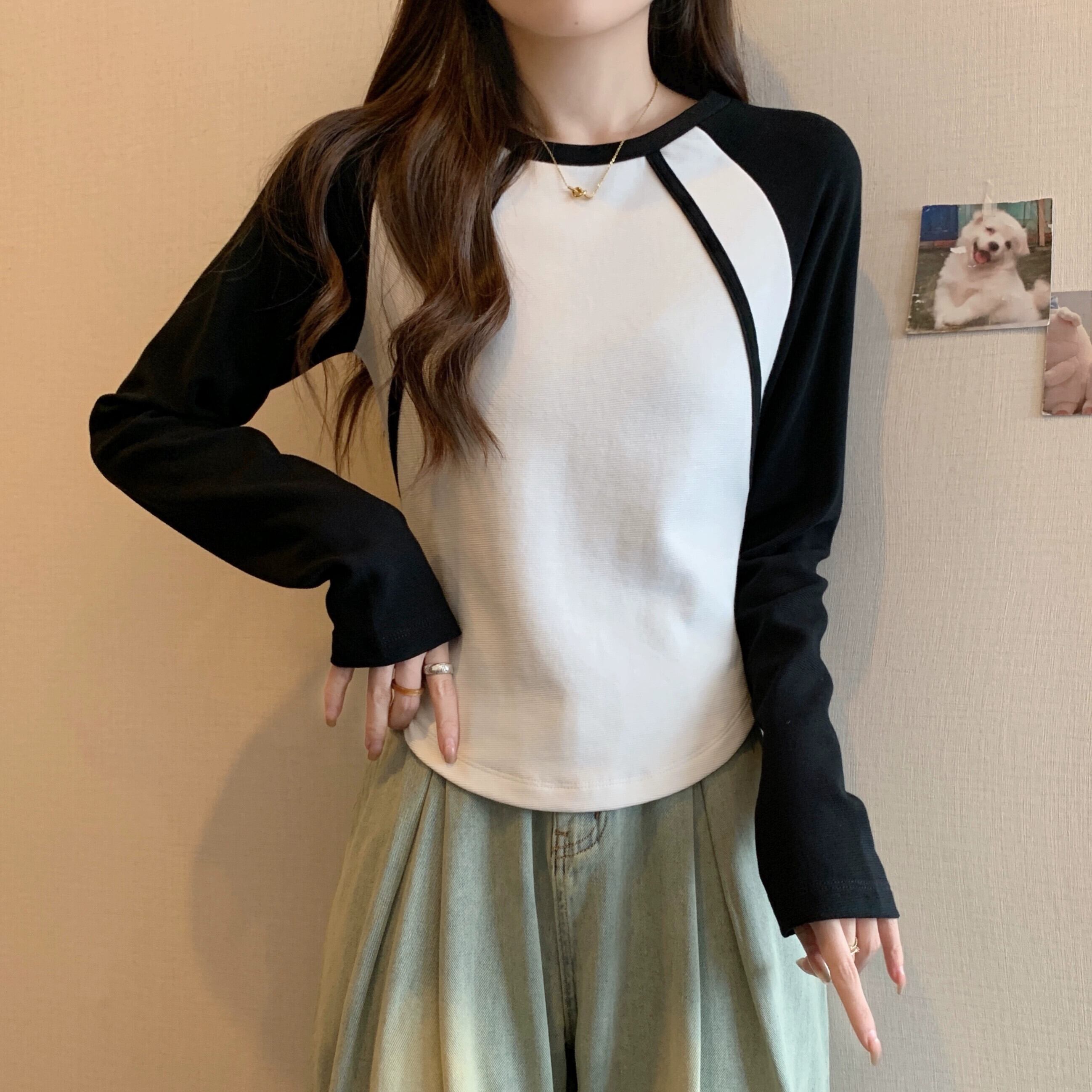 不規則な曲線のショートボトムシャツの女性、春と秋のスタイル、アメリカンレトロスリムフィット、ラグラン長袖Tシャツ ロング スプリング 春物 オータム 秋物 74600879702276 | framboise21