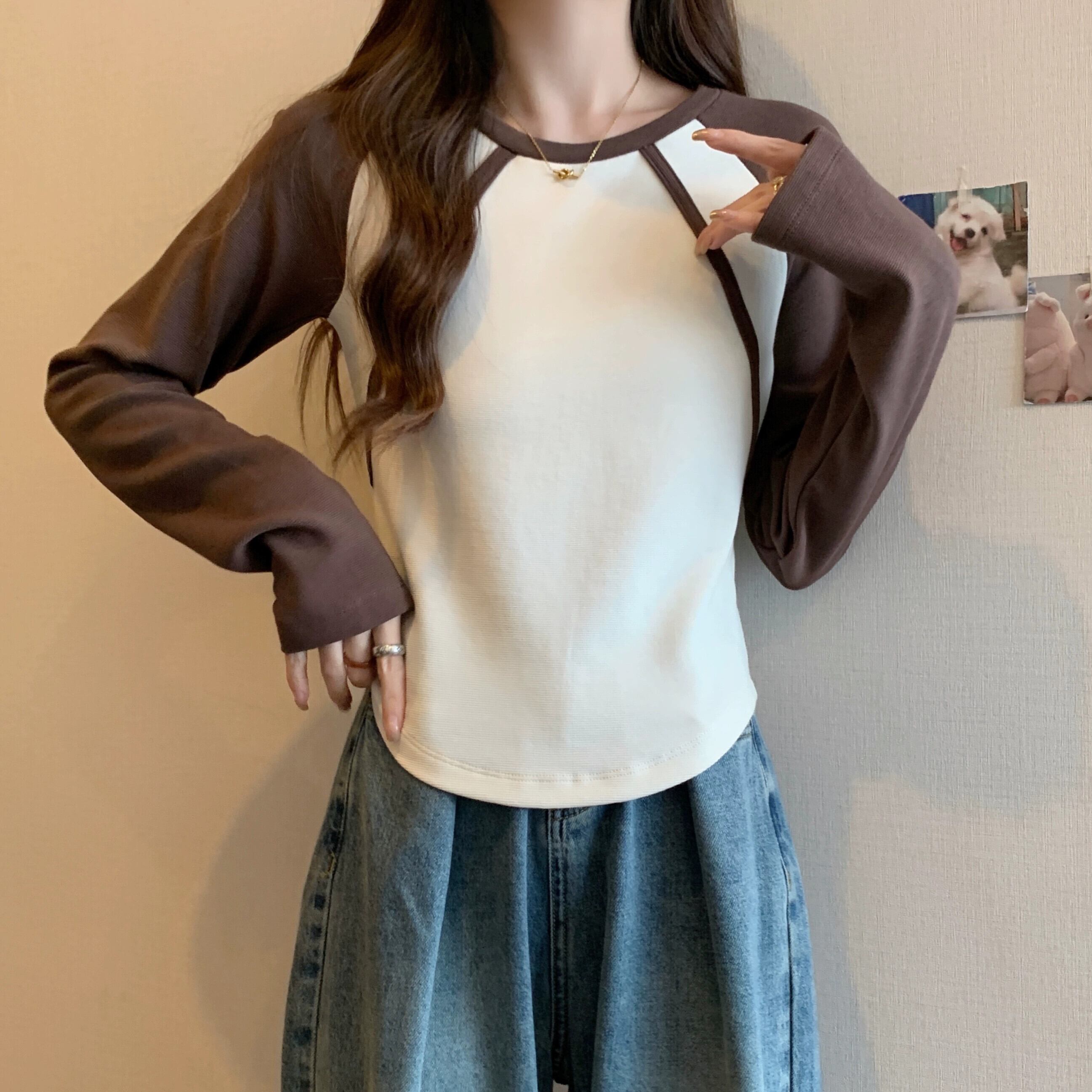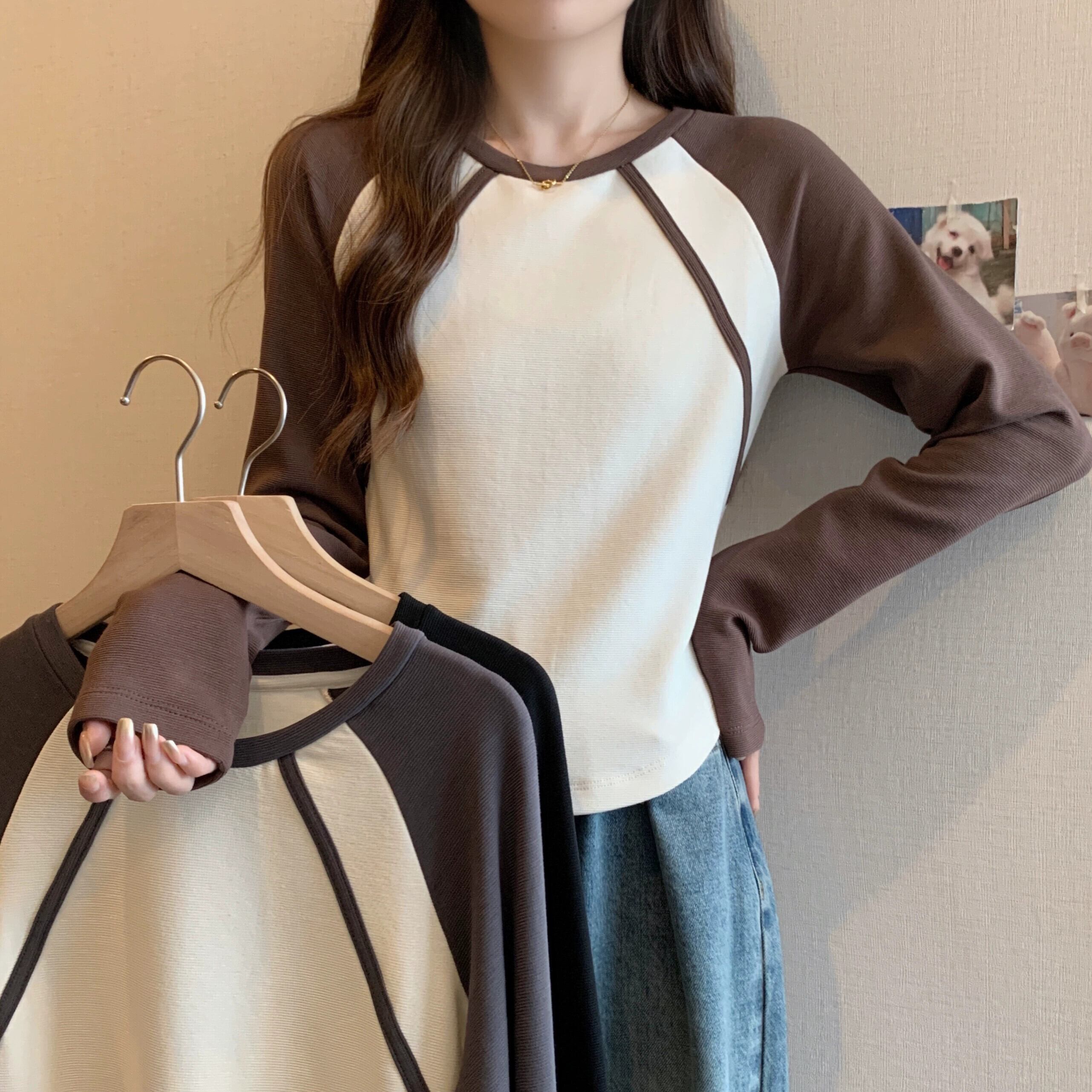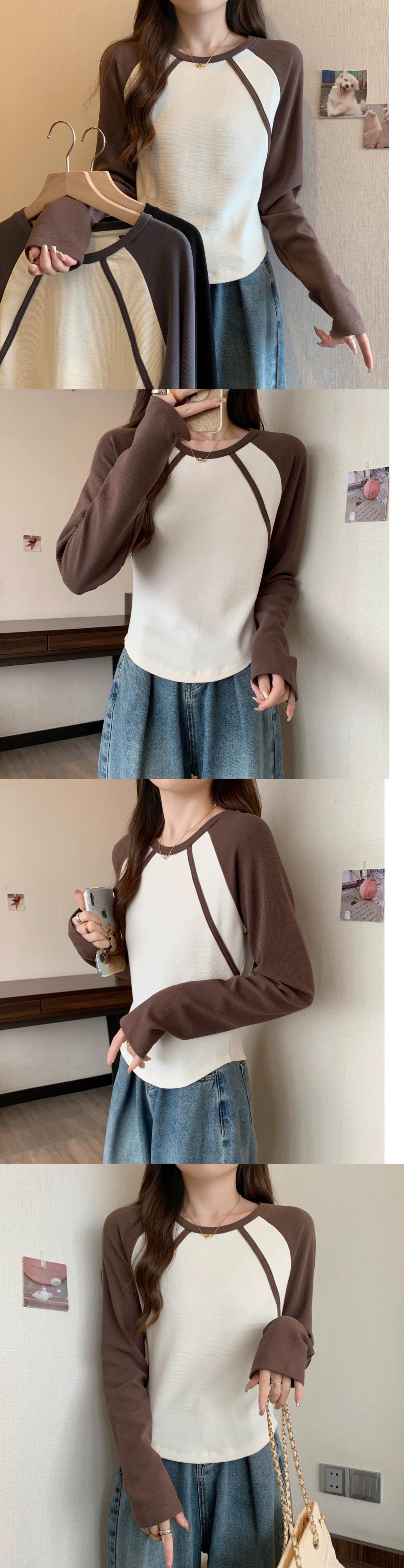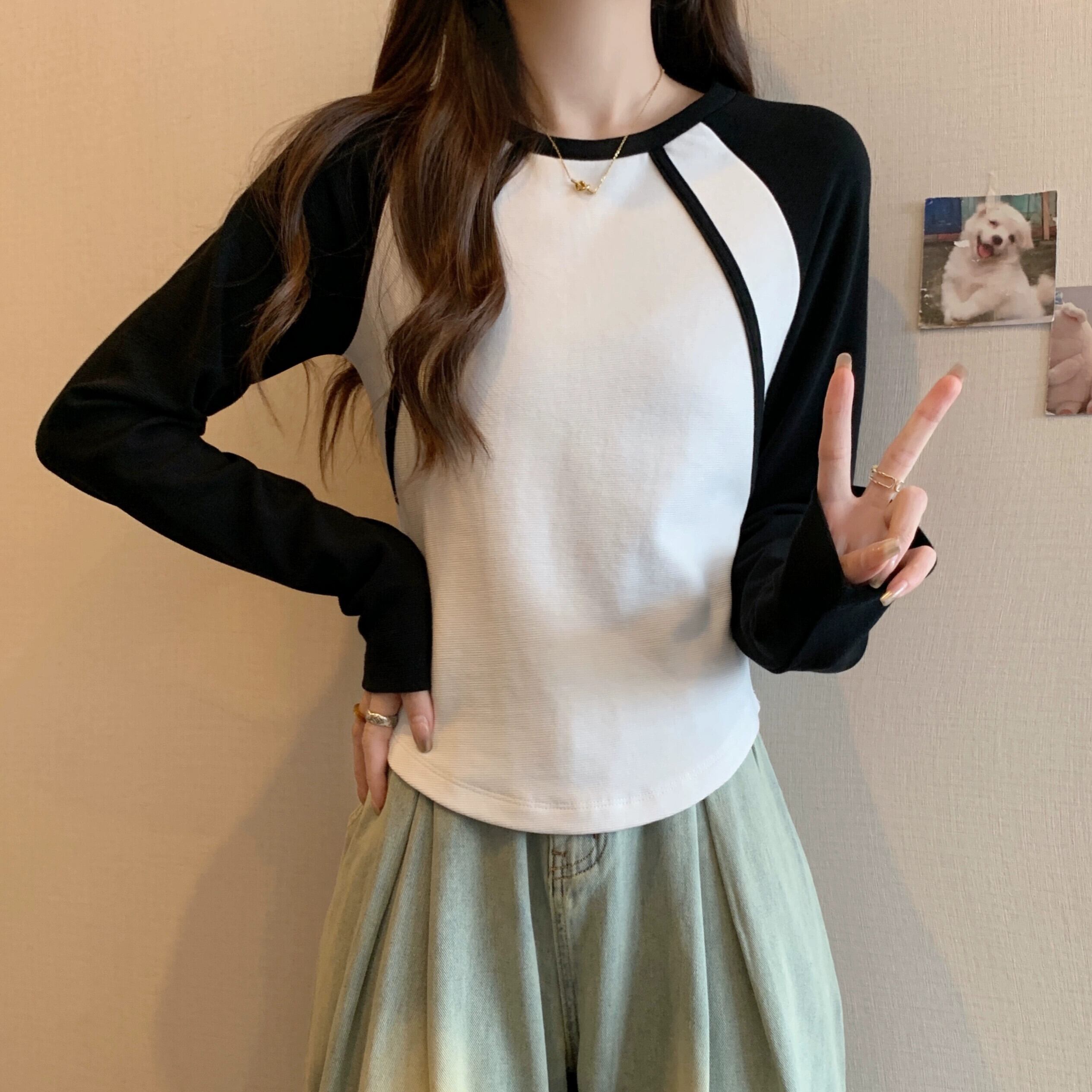 不規則な曲線のショートボトムシャツの女性、春と秋のスタイル、アメリカンレトロスリムフィット、ラグラン長袖Tシャツ ロング スプリング 春物 オータム 秋物 74600879702276 | framboise21