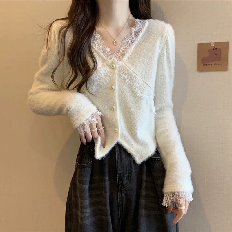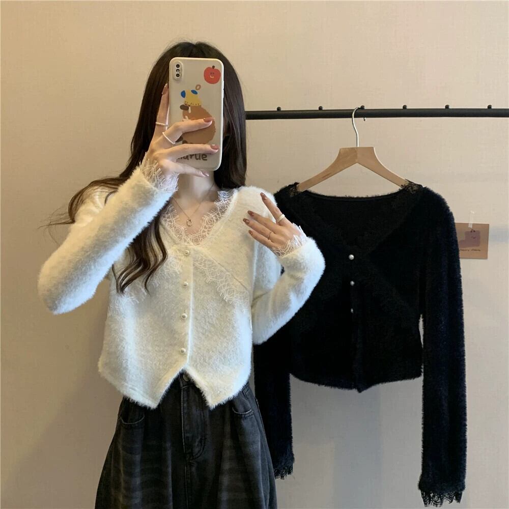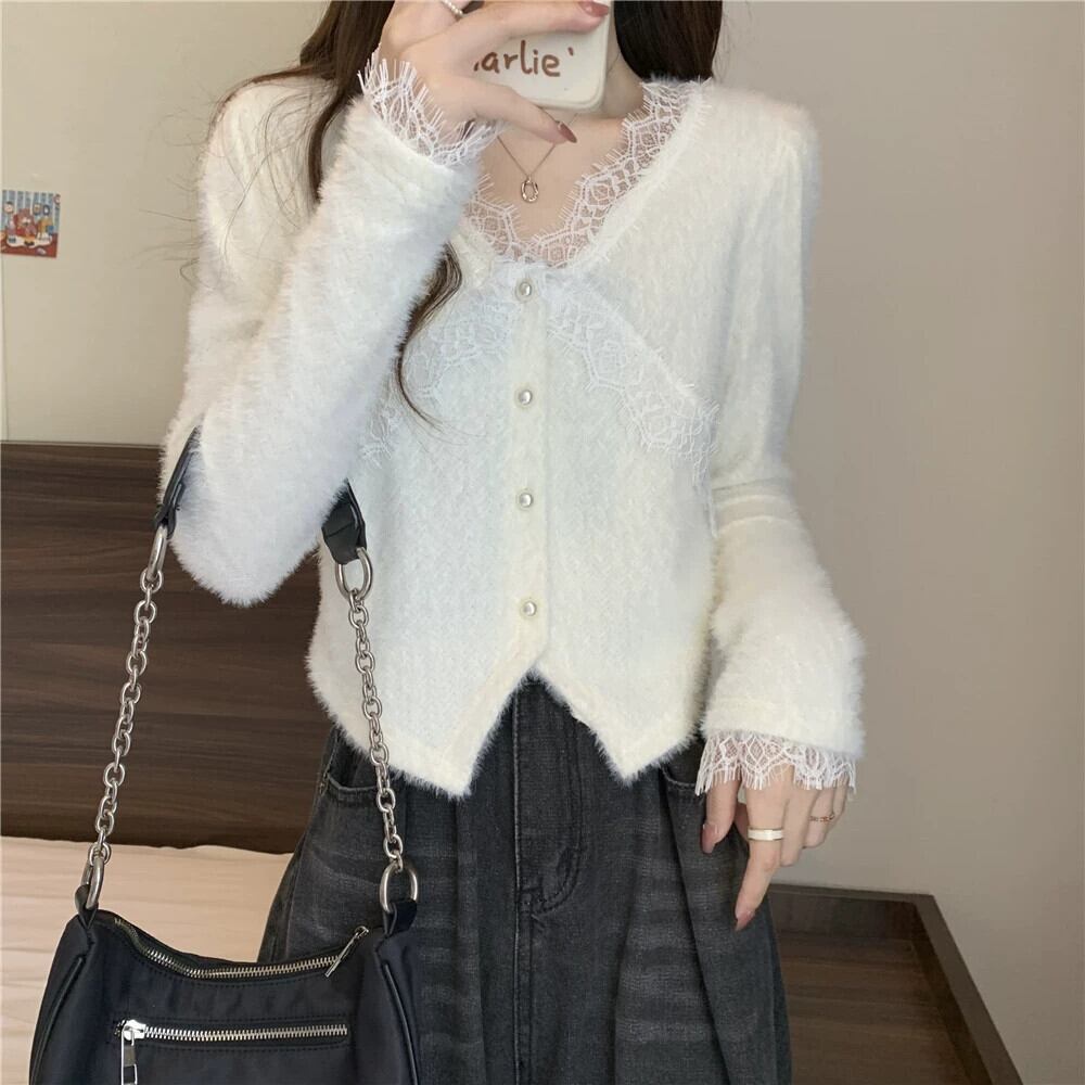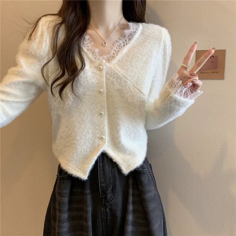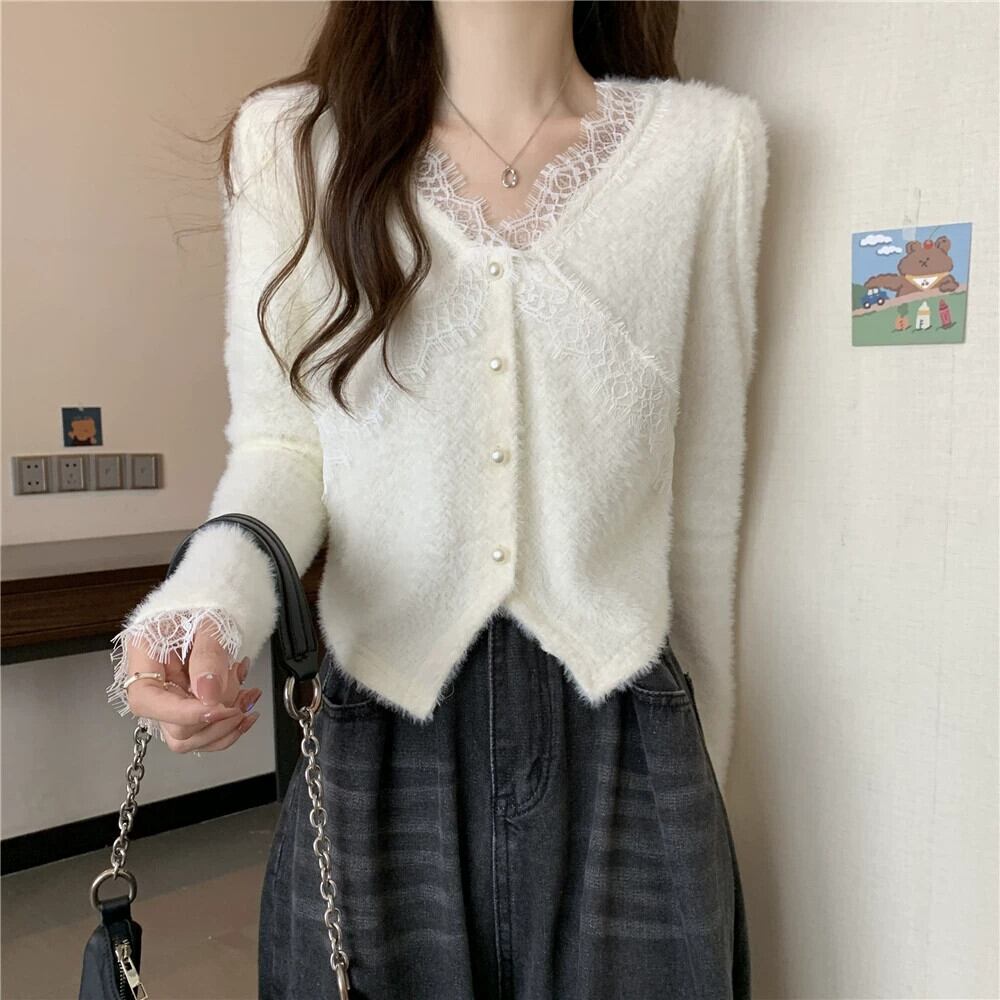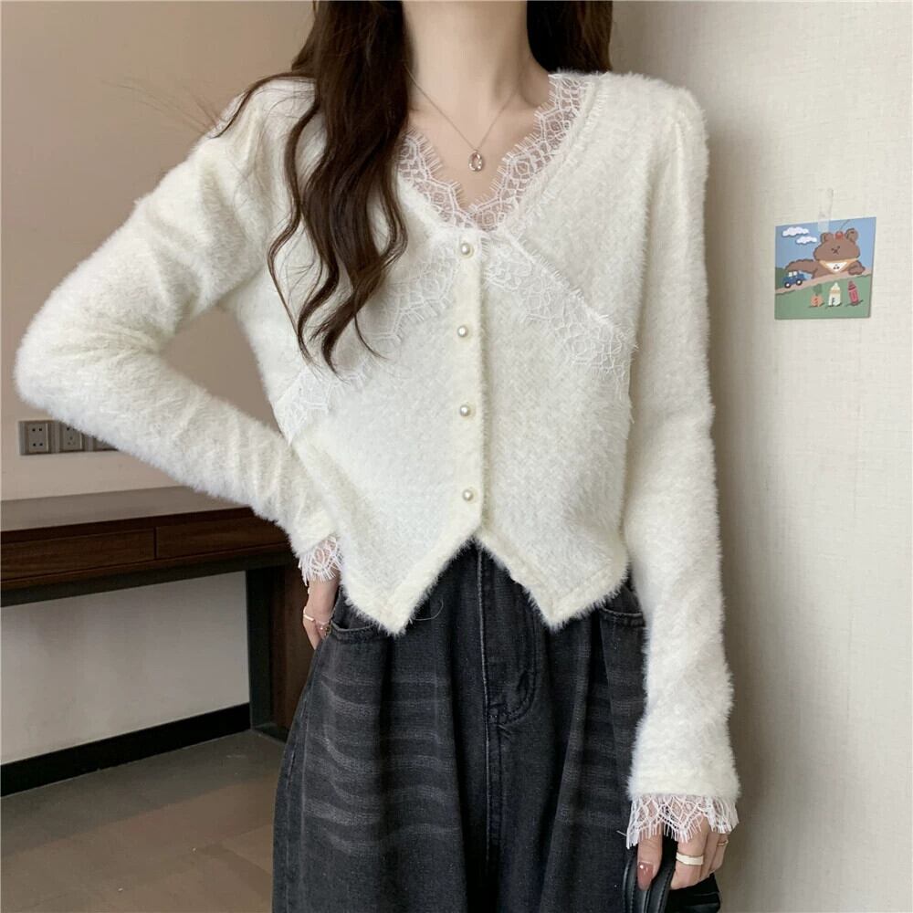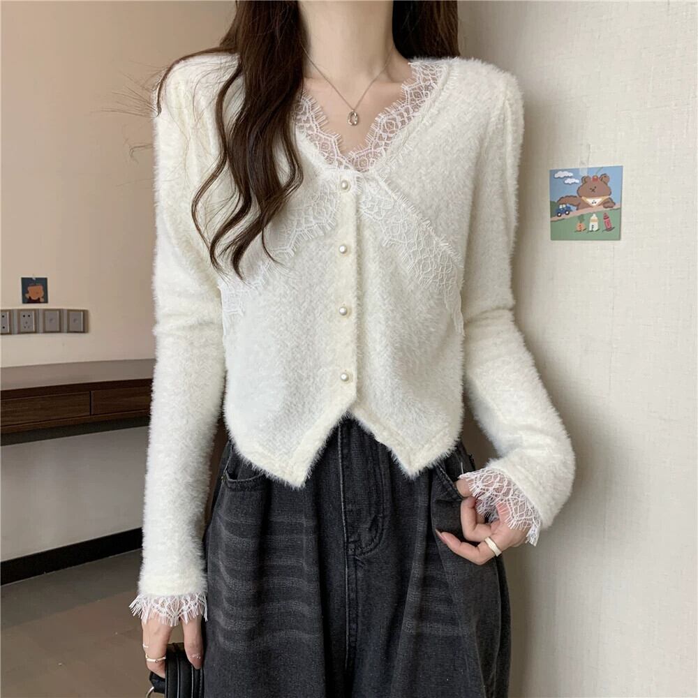 模造ミンクベルベットショート V ネックセータージャケット女性秋と冬小さな香りスタイルアウターウェア肥厚不規則なニットカーディガン白 ホワイト オータム 秋物 ウィンター 冬物 Vネック 7460063962822513 | framboise21