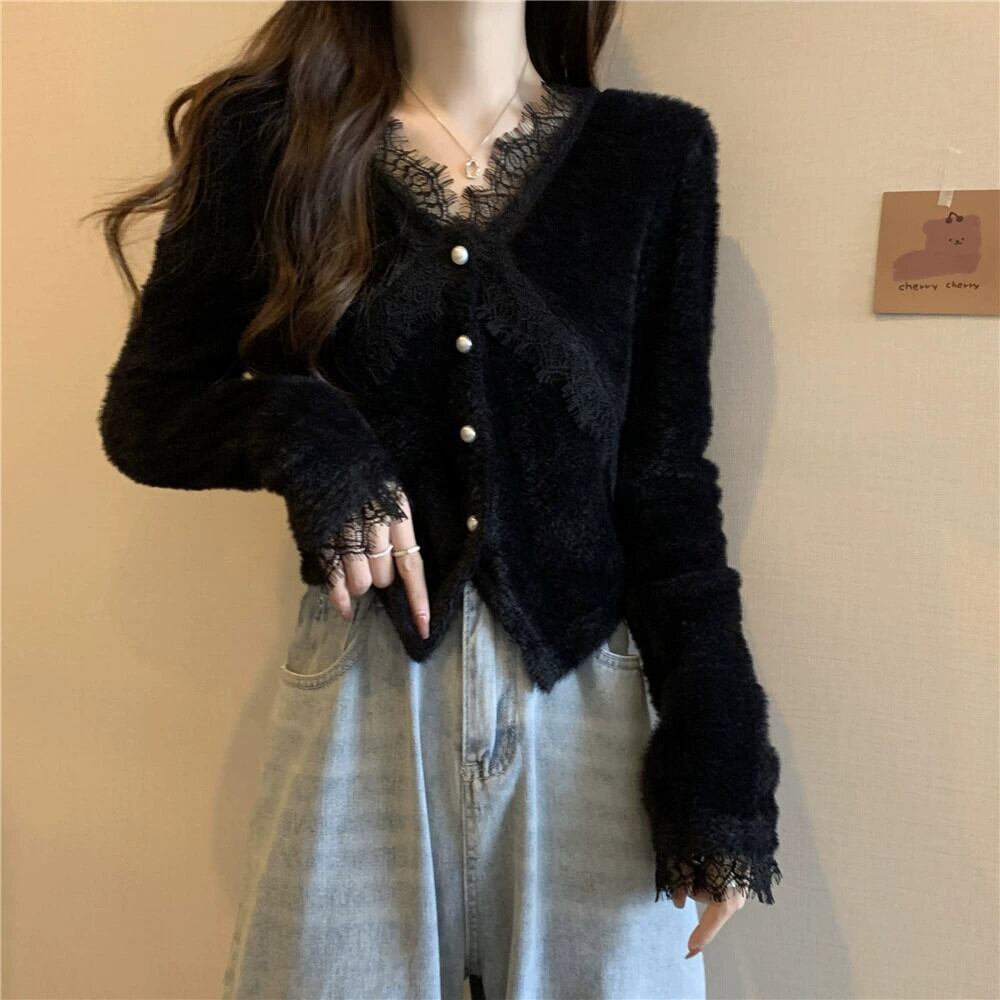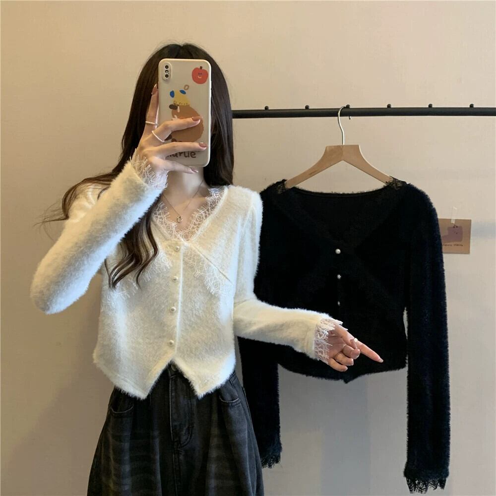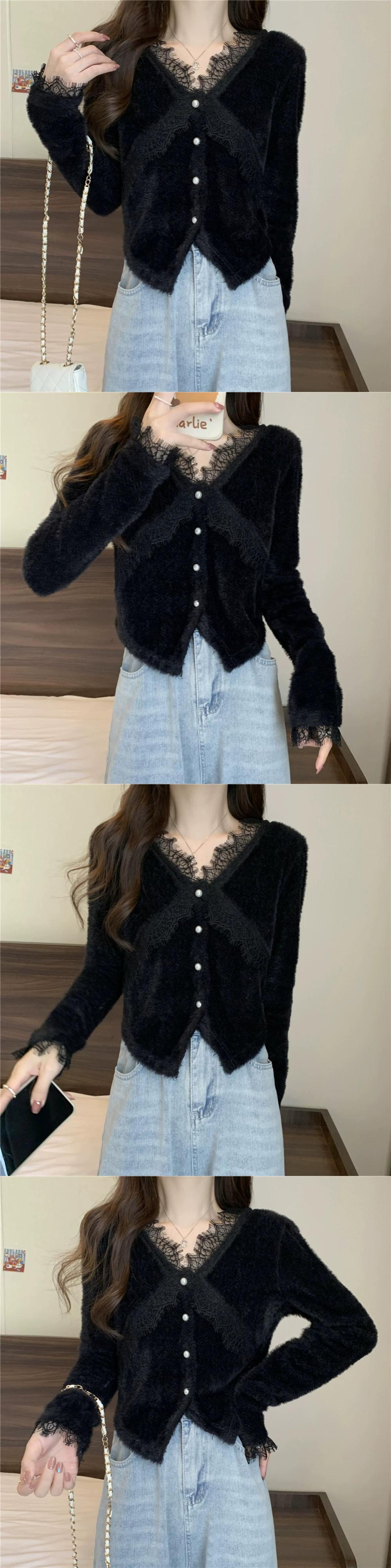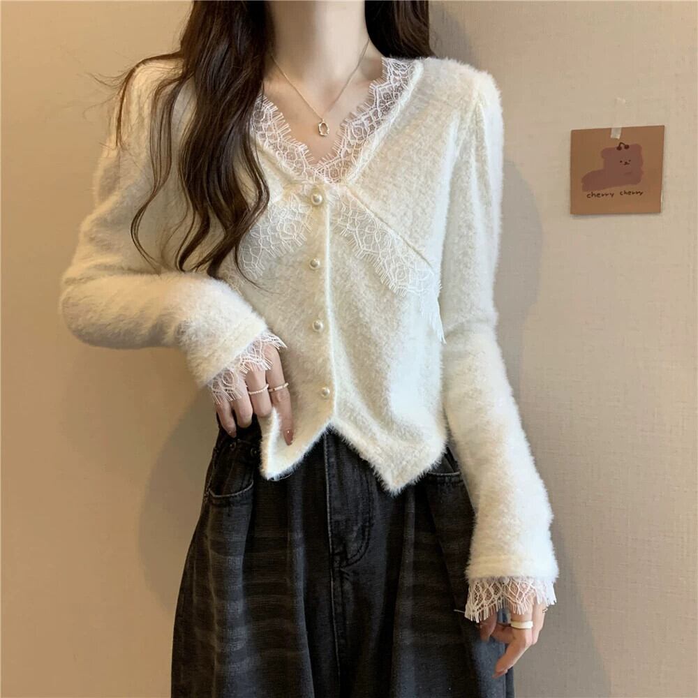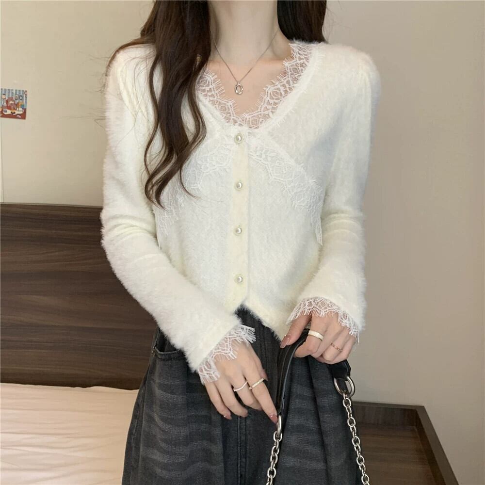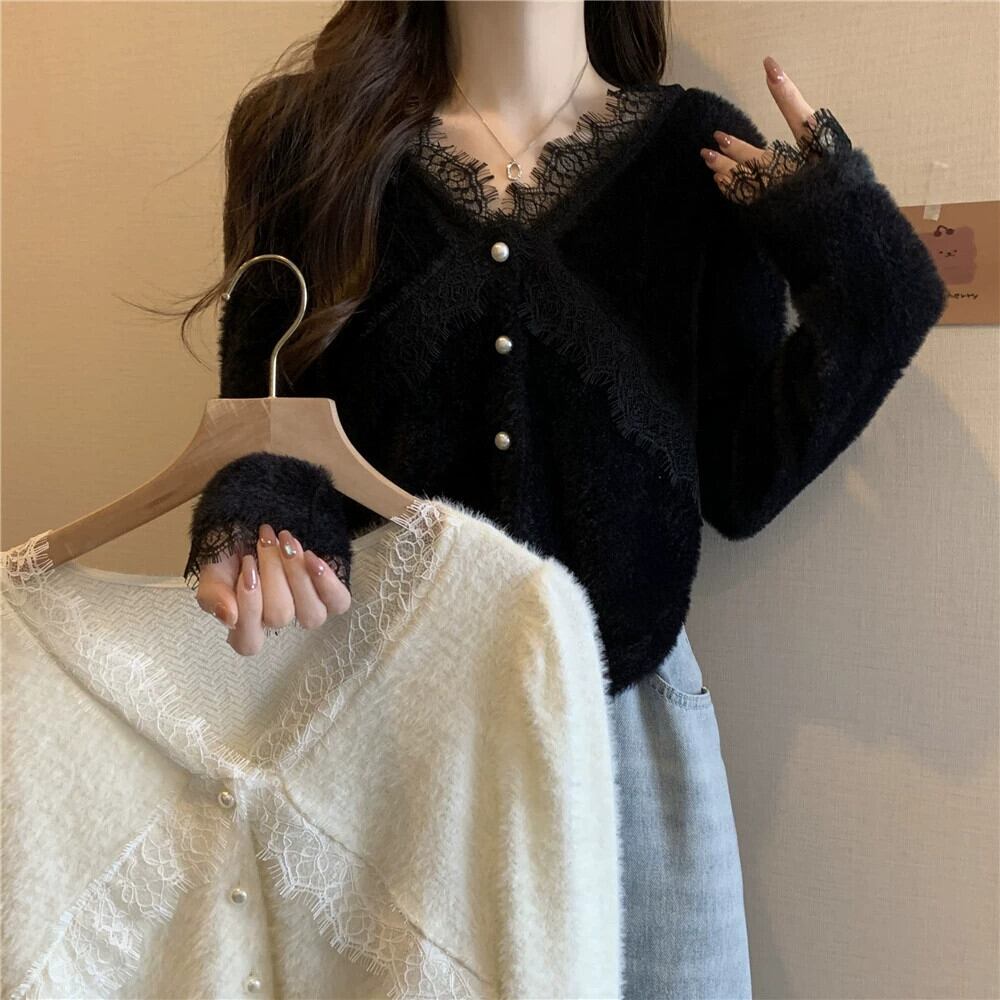 模造ミンクベルベットショート V ネックセータージャケット女性秋と冬小さな香りスタイルアウターウェア肥厚不規則なニットカーディガン白 ホワイト オータム 秋物 ウィンター 冬物 Vネック 7460063962822513 | framboise21