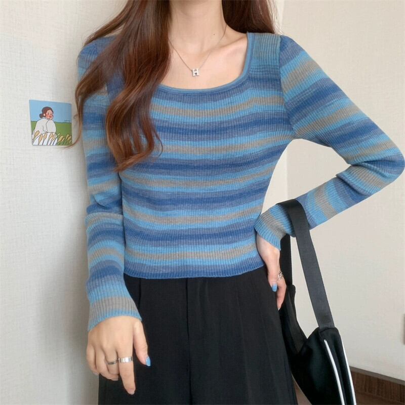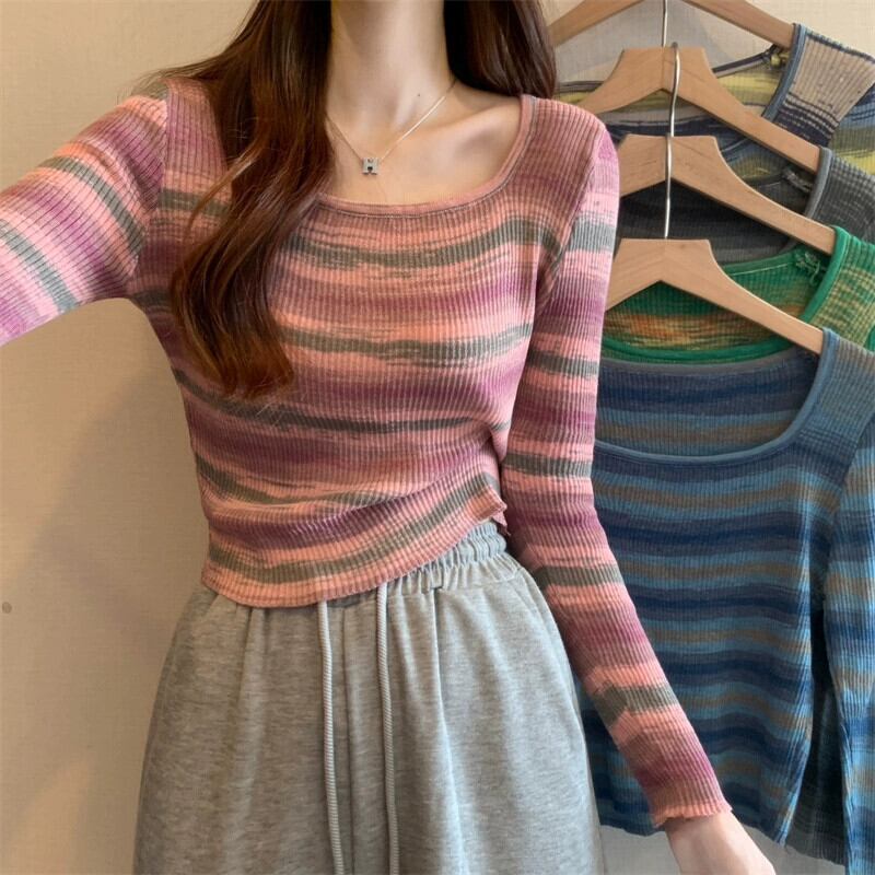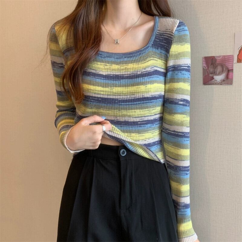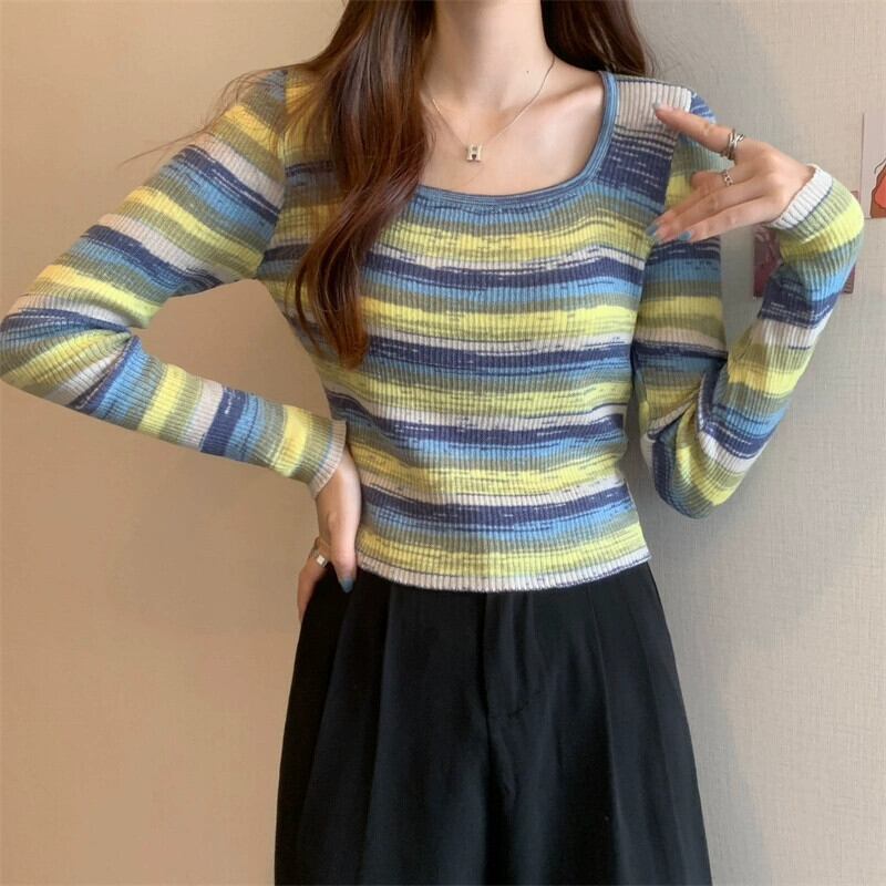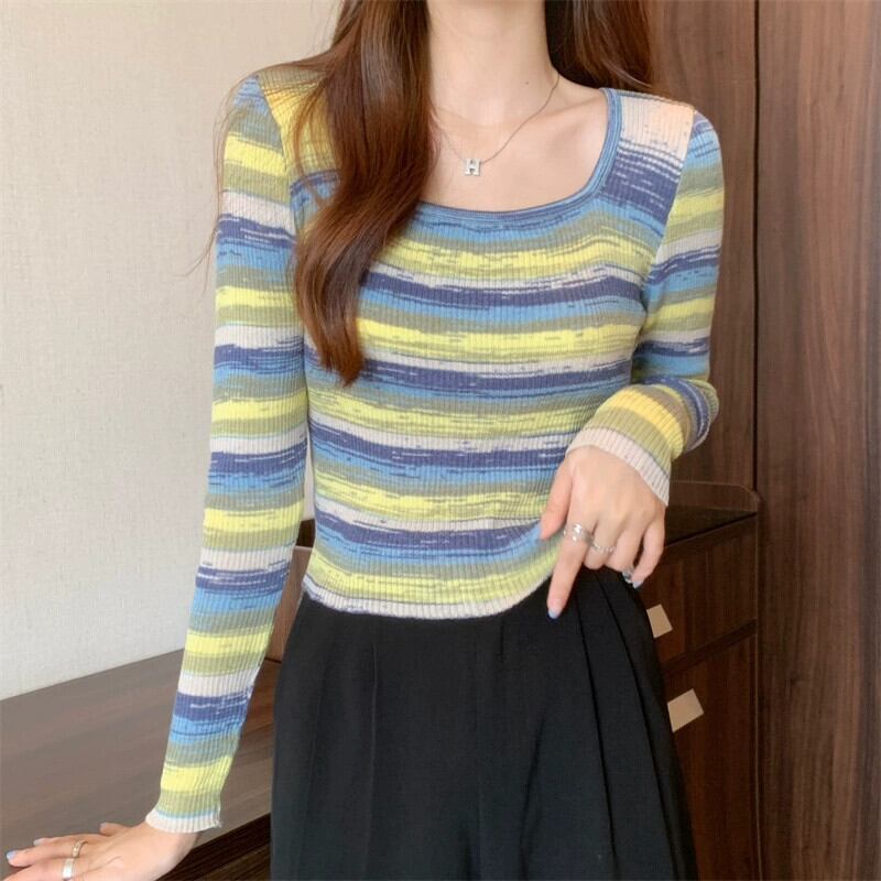 秋冬のレインボーストライプニットボトムシャツレディース、ファッショナブルなスリムフィットインナーセーター、ハイウエストショートスクエアネック長袖トップ ロング オータム 秋物 ウィンター 冬物 スクウェア 7460086097647654 | framboise21