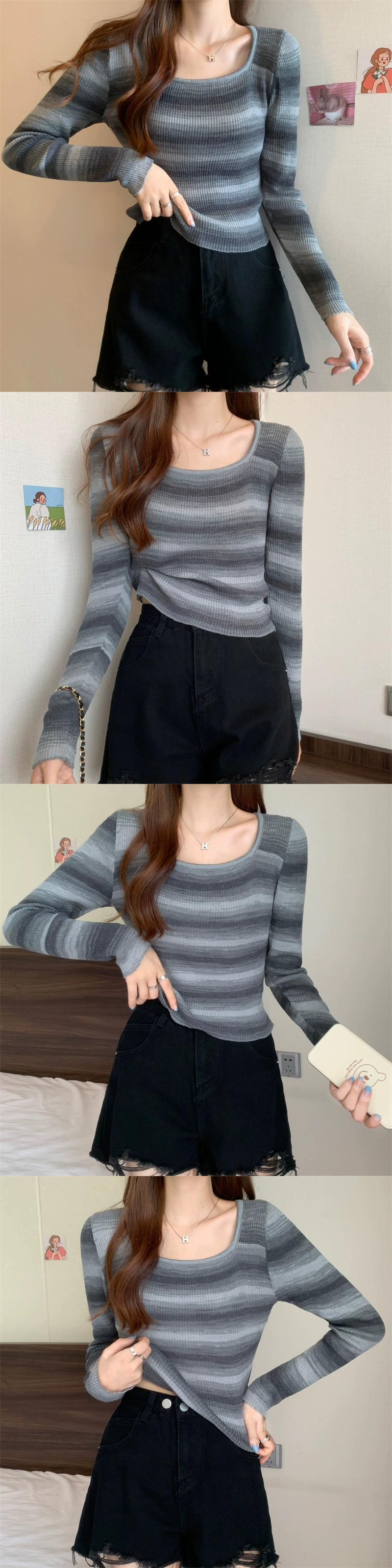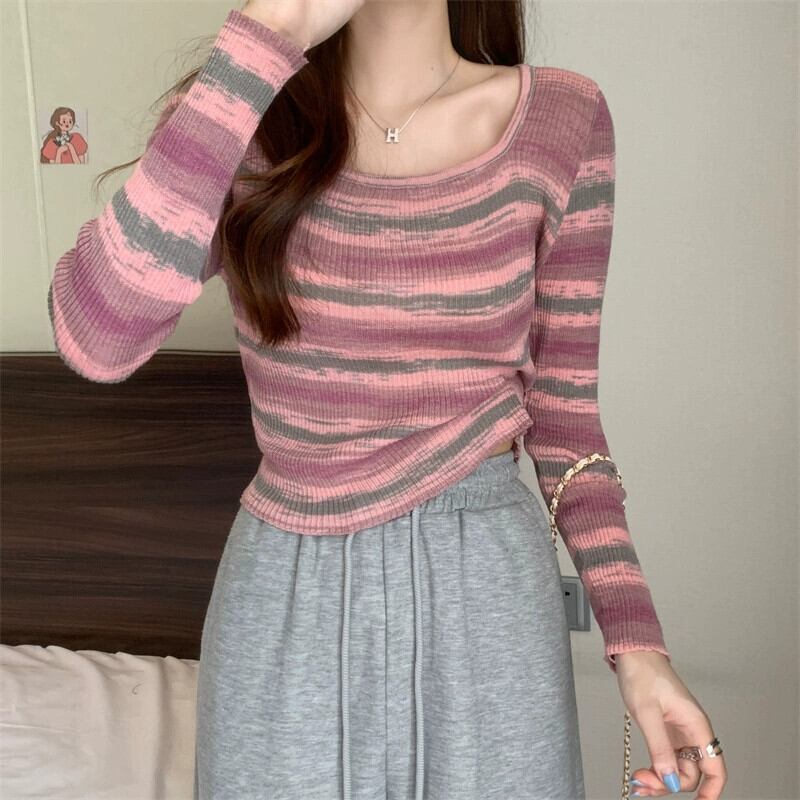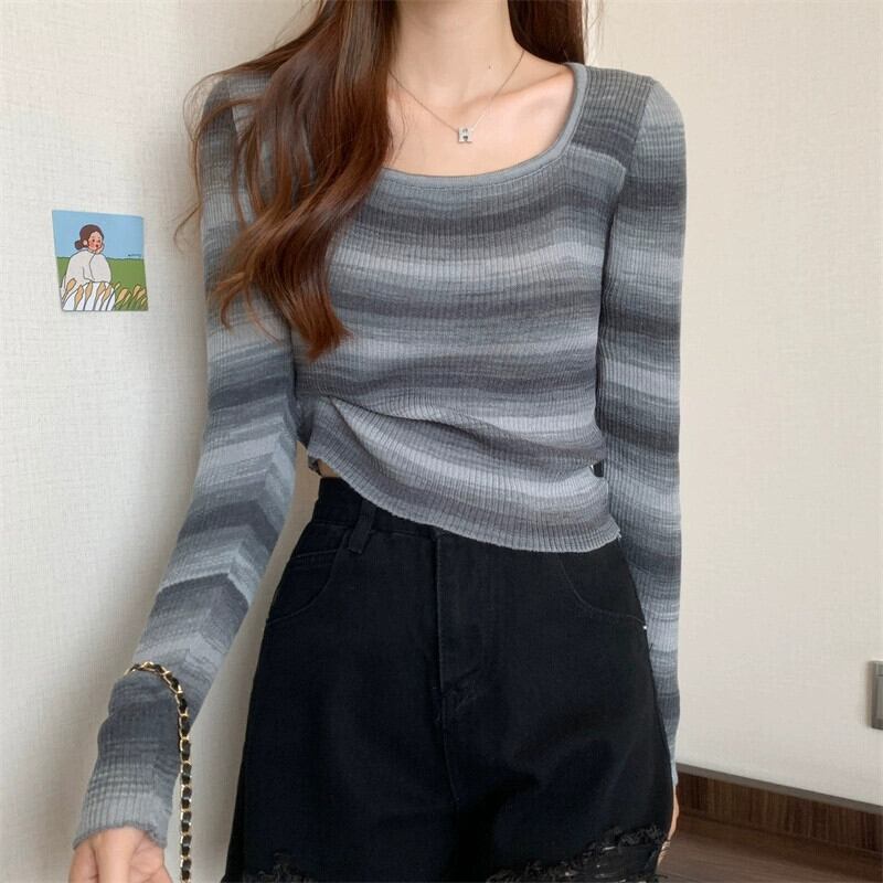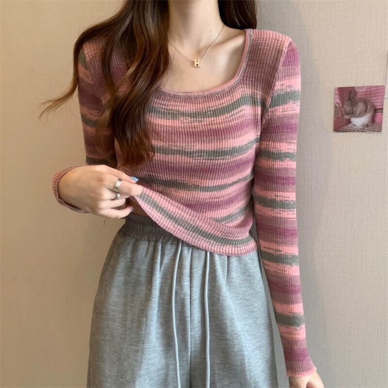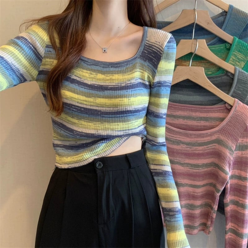 秋冬のレインボーストライプニットボトムシャツレディース、ファッショナブルなスリムフィットインナーセーター、ハイウエストショートスクエアネック長袖トップ ロング オータム 秋物 ウィンター 冬物 スクウェア 7460086097647654 | framboise21