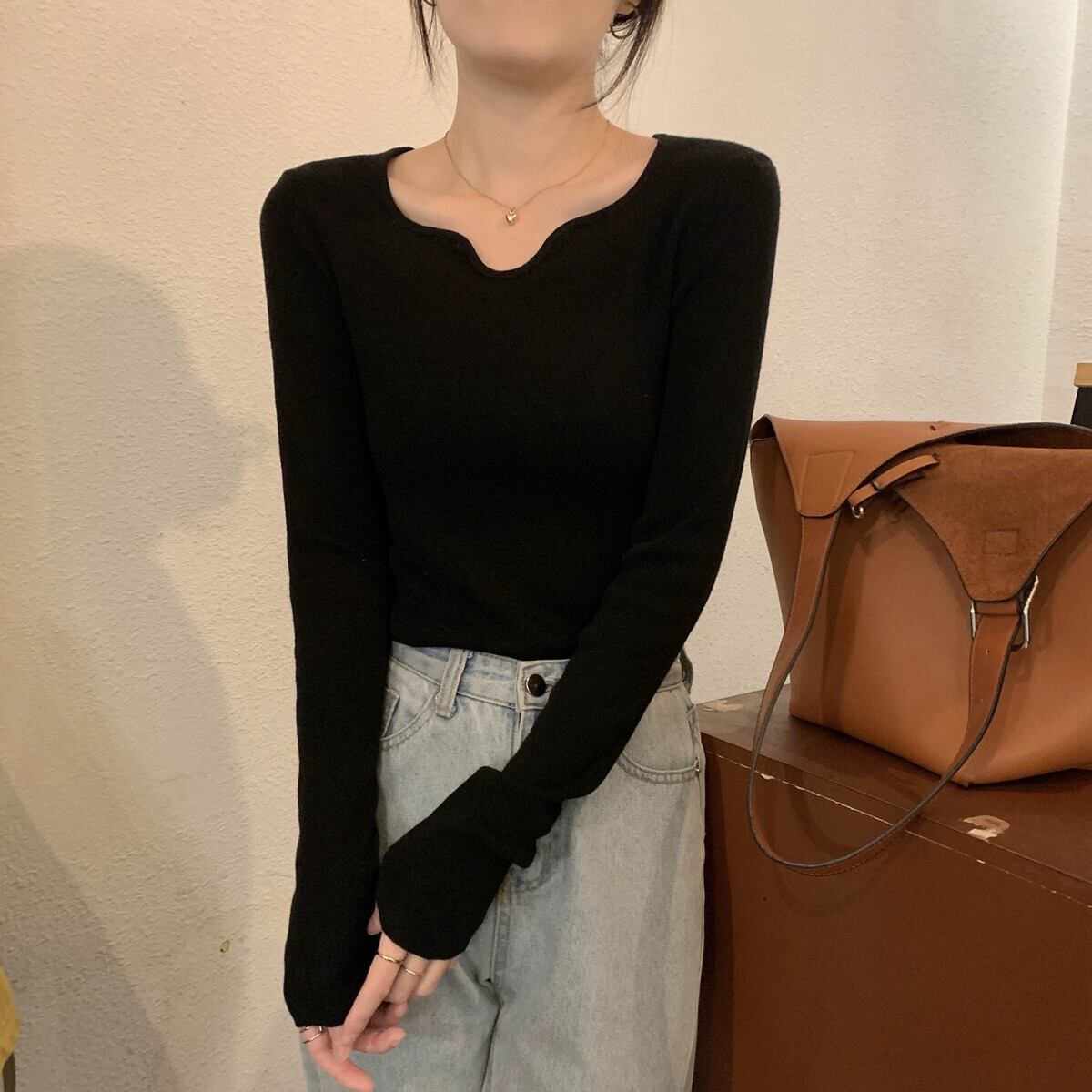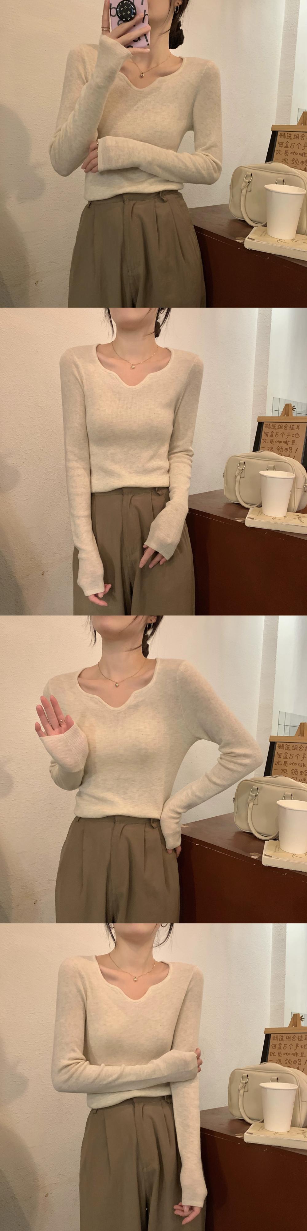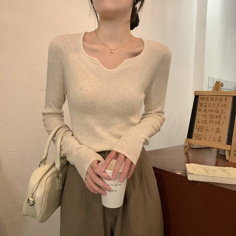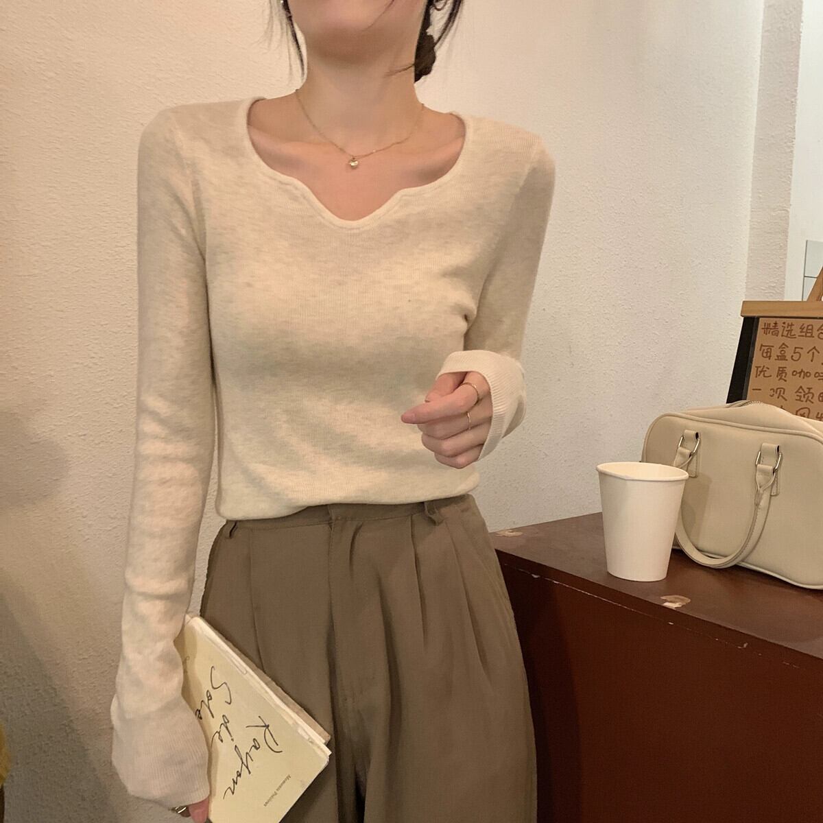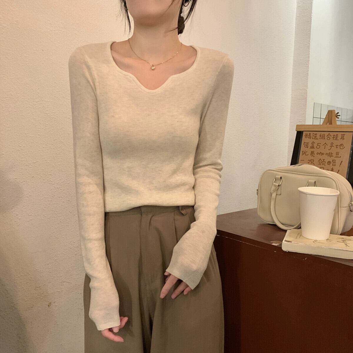 コートの中にVネックボトリングシャツを着た女性、秋冬フレンチファッション、アインスタイル、着痩せ、鎖骨露出ニットセーター、アプリコット オータム 秋物 ウィンター 冬物 Vネック 7460022444480545 | framboise21