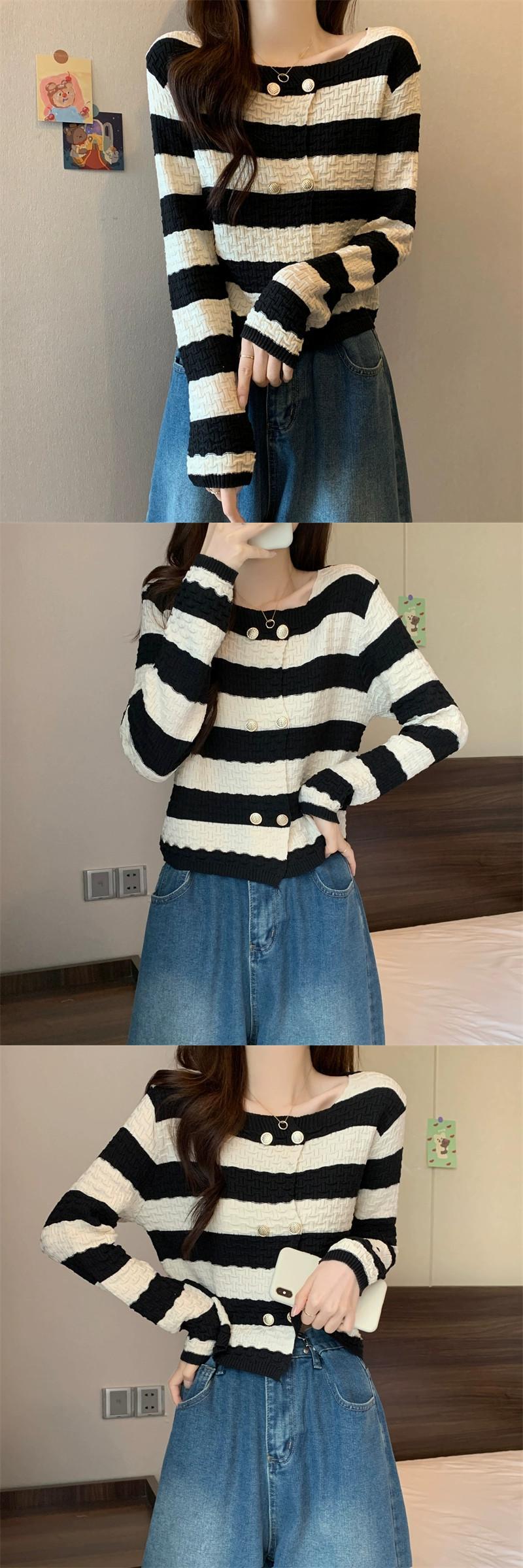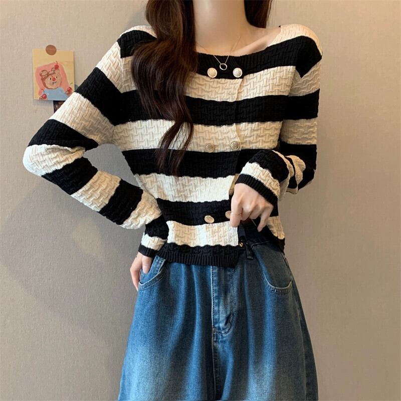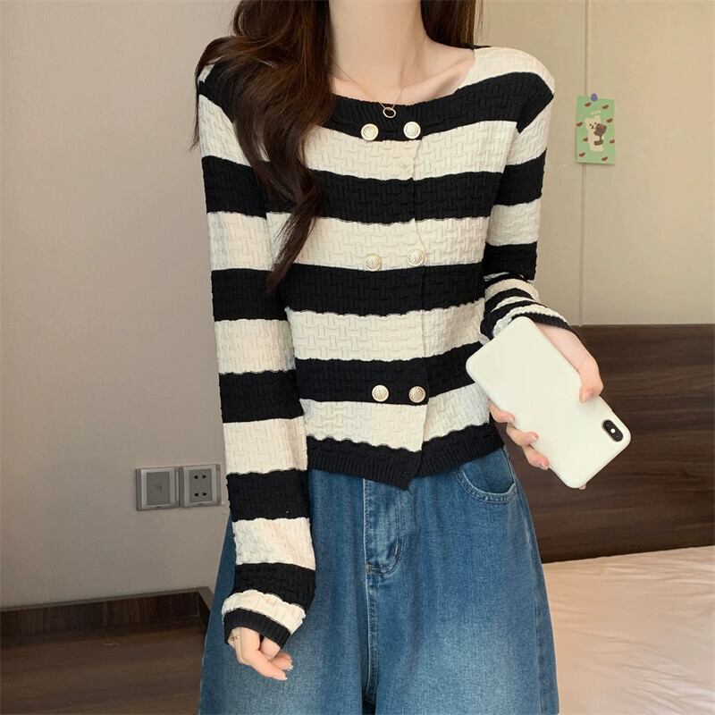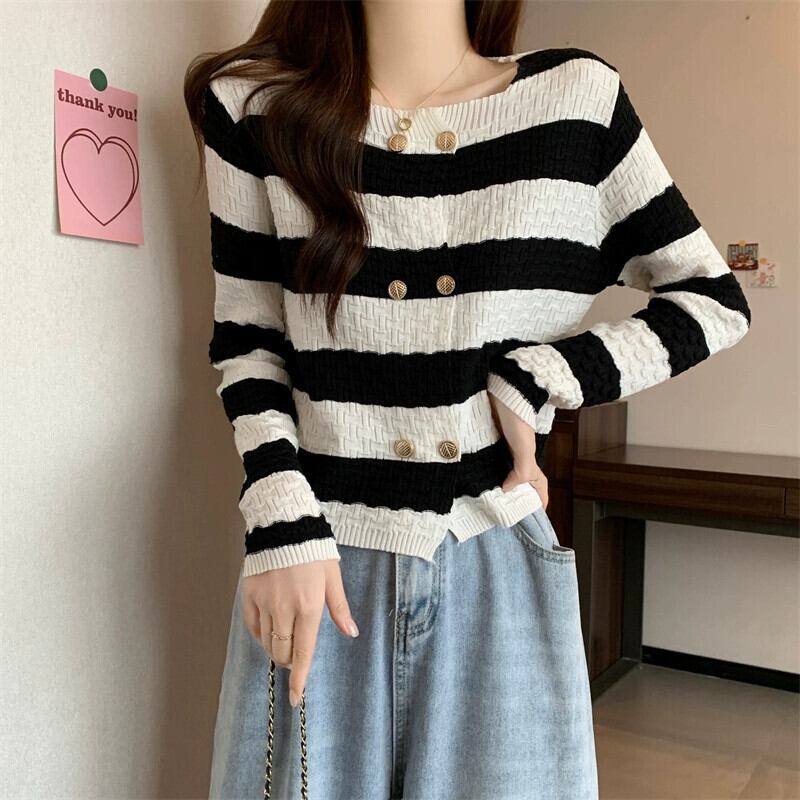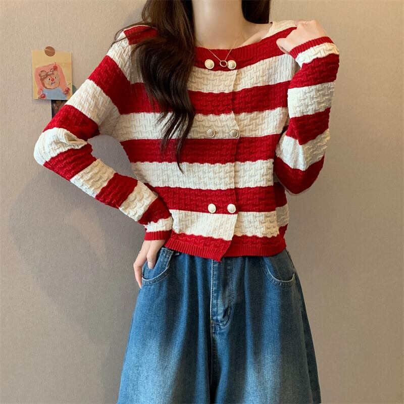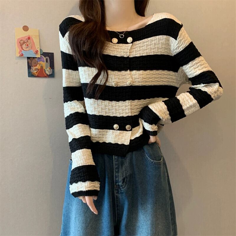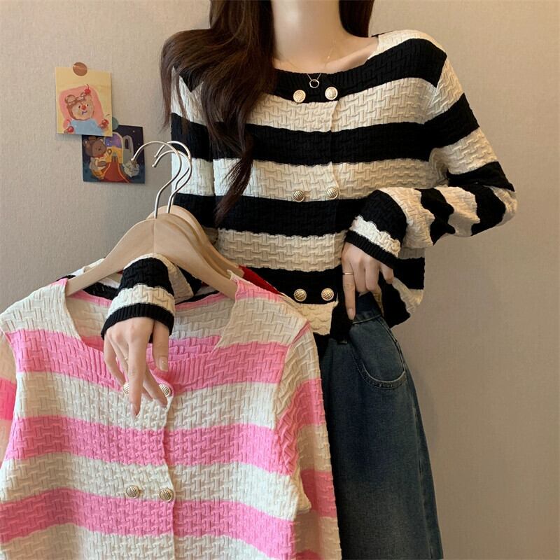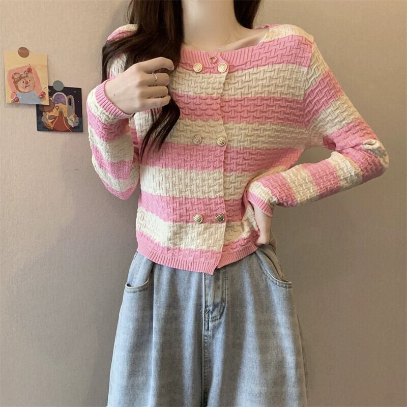 春、秋、冬のストライプのニットカーディガンジャケットの女性、高級、小さな香り、ゆったりとしたアウターウェア、スリムでシックなショートセーター スプリング 春物 オータム 秋物 ウィンター 冬物 7460048097712545 | framboise21