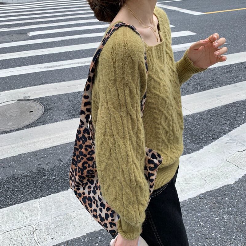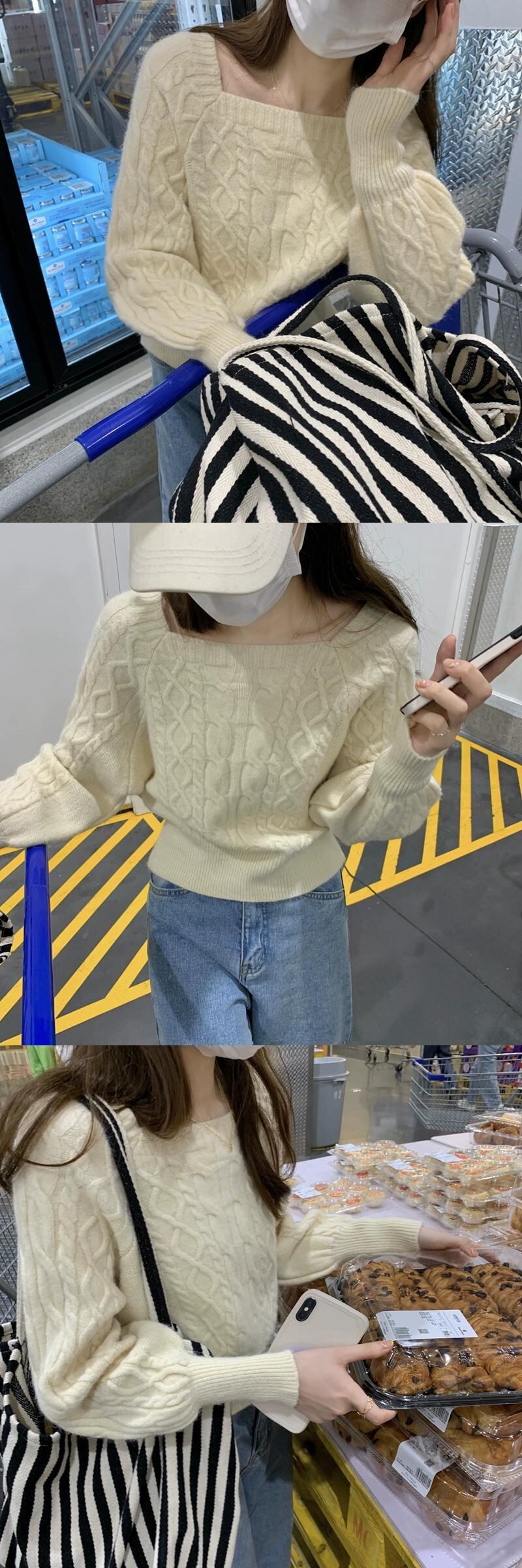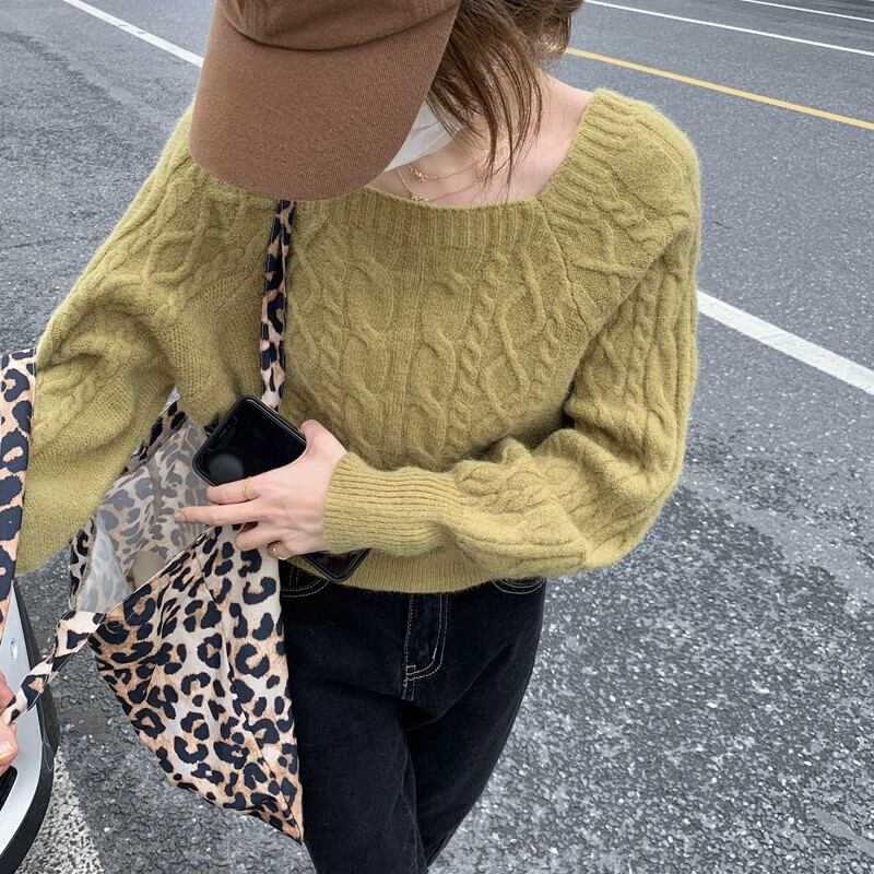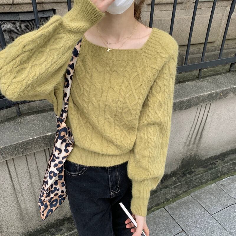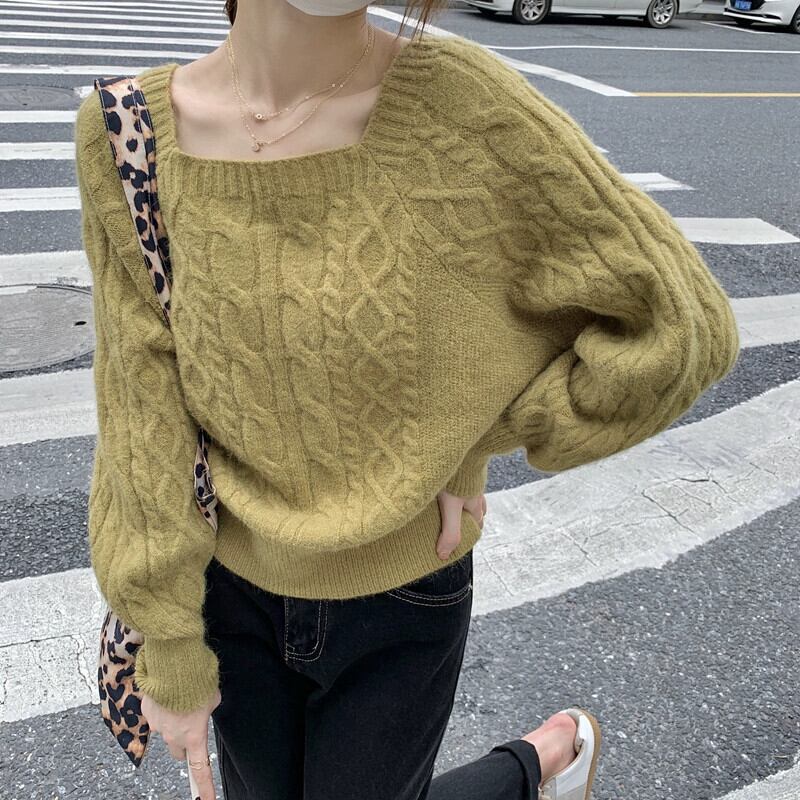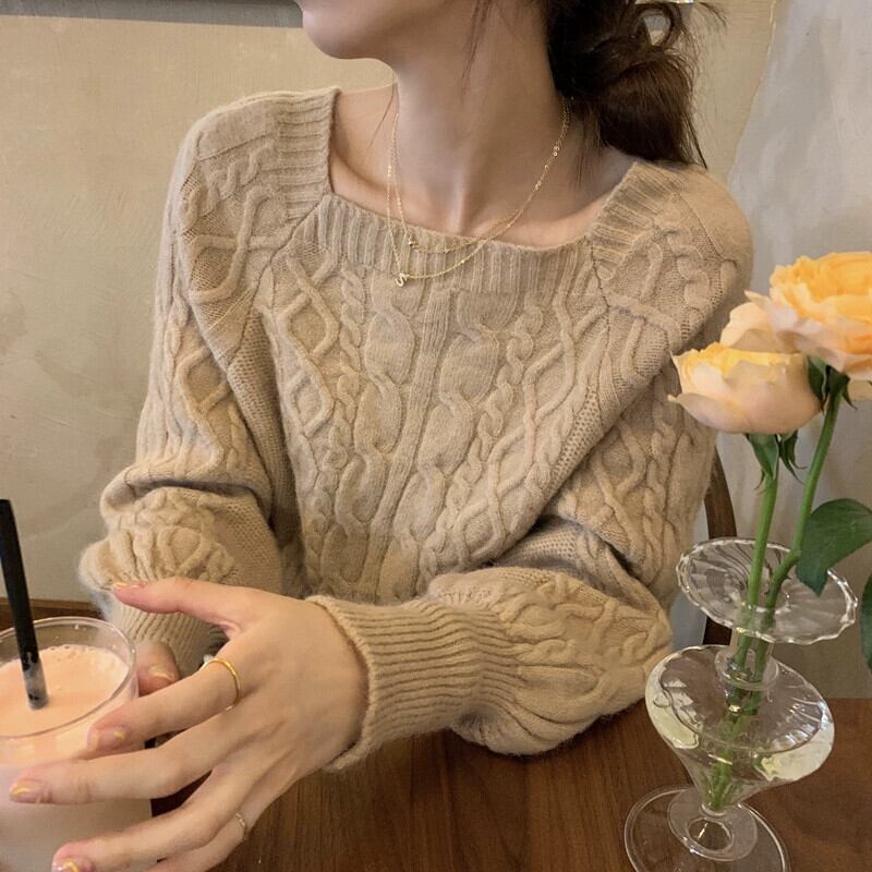 厚みのあるショートソフトワクシーツイストセーターレディース、秋と冬のレトロなルーズアウターウェア、スリムプルオーバー長袖スクエアネックセーター ロング オータム 秋物 ウィンター 冬物 スクウェア 7460060906786530 | framboise21