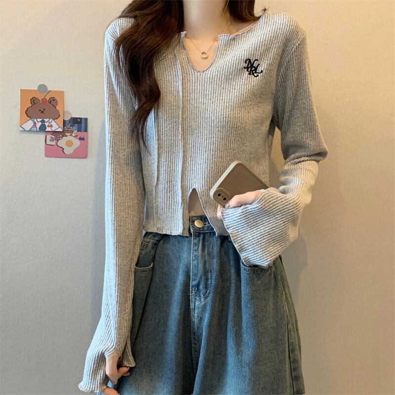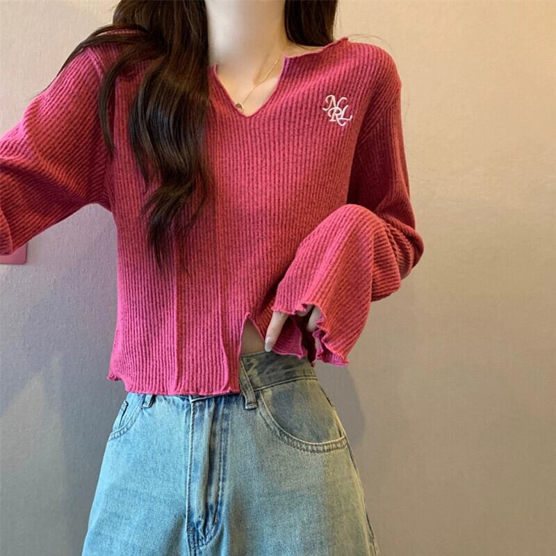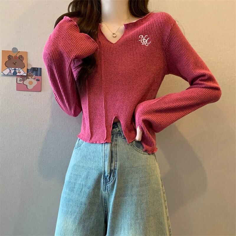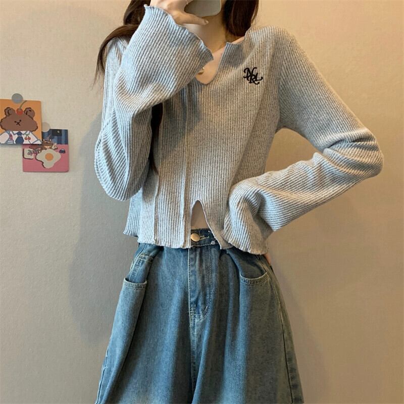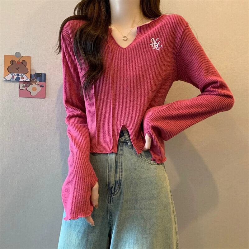 秋冬の小さなショートニットボトムシャツレディース、ファッショナブルでゆったりとしたインナースリットVネック長袖トップス ロング オータム 秋物 ウィンター 冬物 7460066714274263 | framboise21