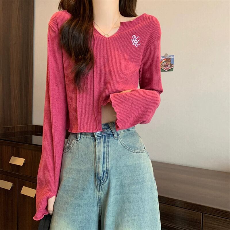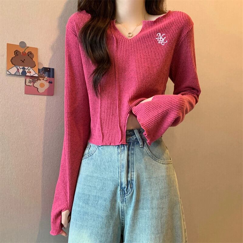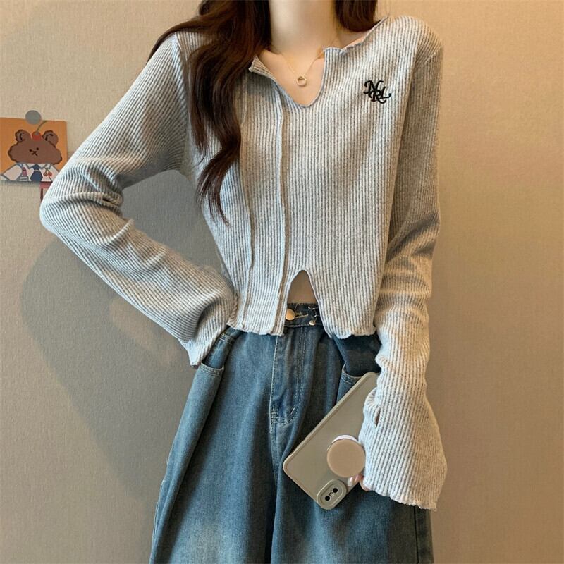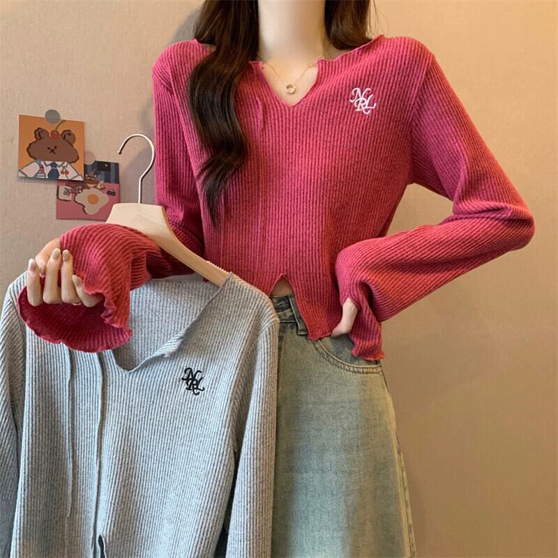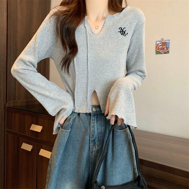 秋冬の小さなショートニットボトムシャツレディース、ファッショナブルでゆったりとしたインナースリットVネック長袖トップス ロング オータム 秋物 ウィンター 冬物 7460066714274263 | framboise21