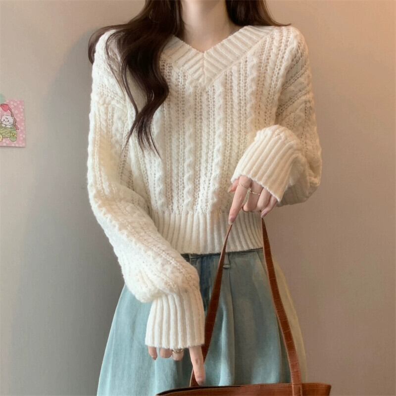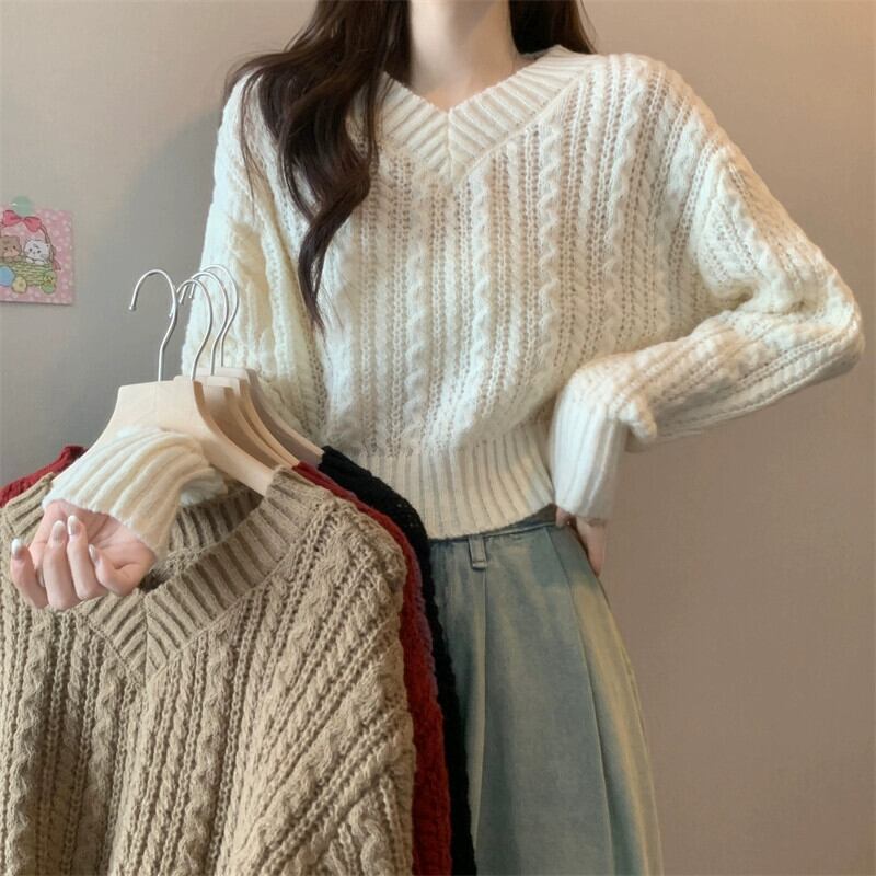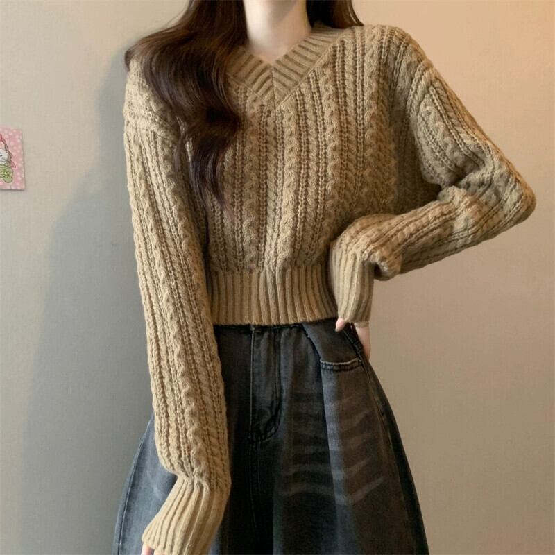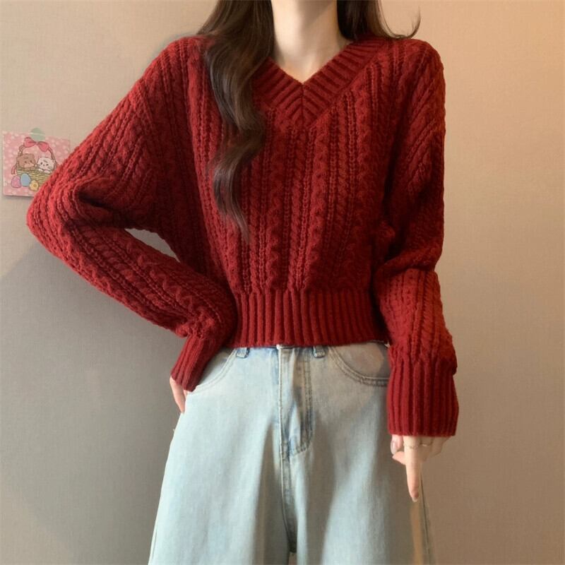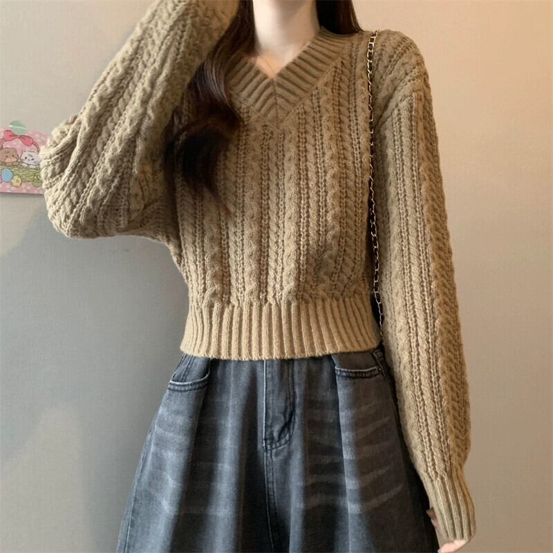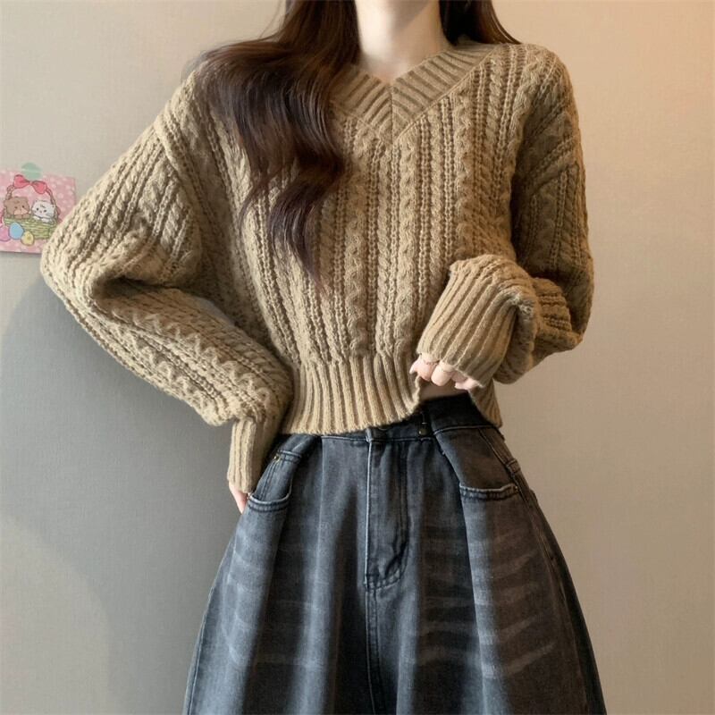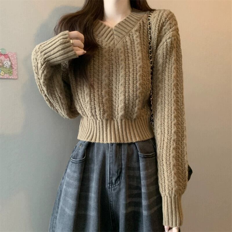 厚く短い太い糸のツイストセーターの女性の秋と冬のフランスのレトロなルーズアウターウェア痩身 V ネック長袖セーター ショート ロング オータム 秋物 ウィンター 冬物 Vネック 7460042723167184 | framboise21