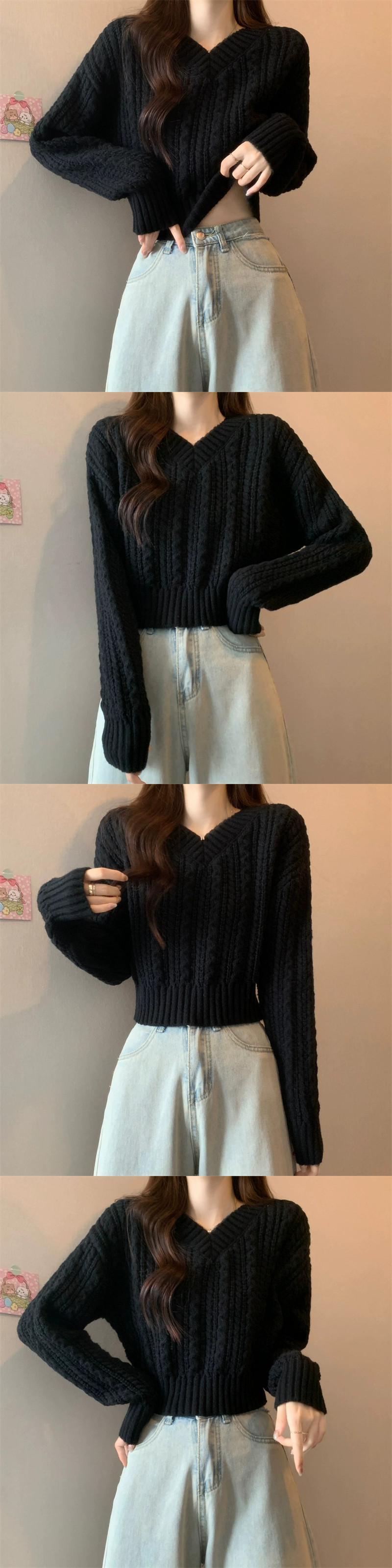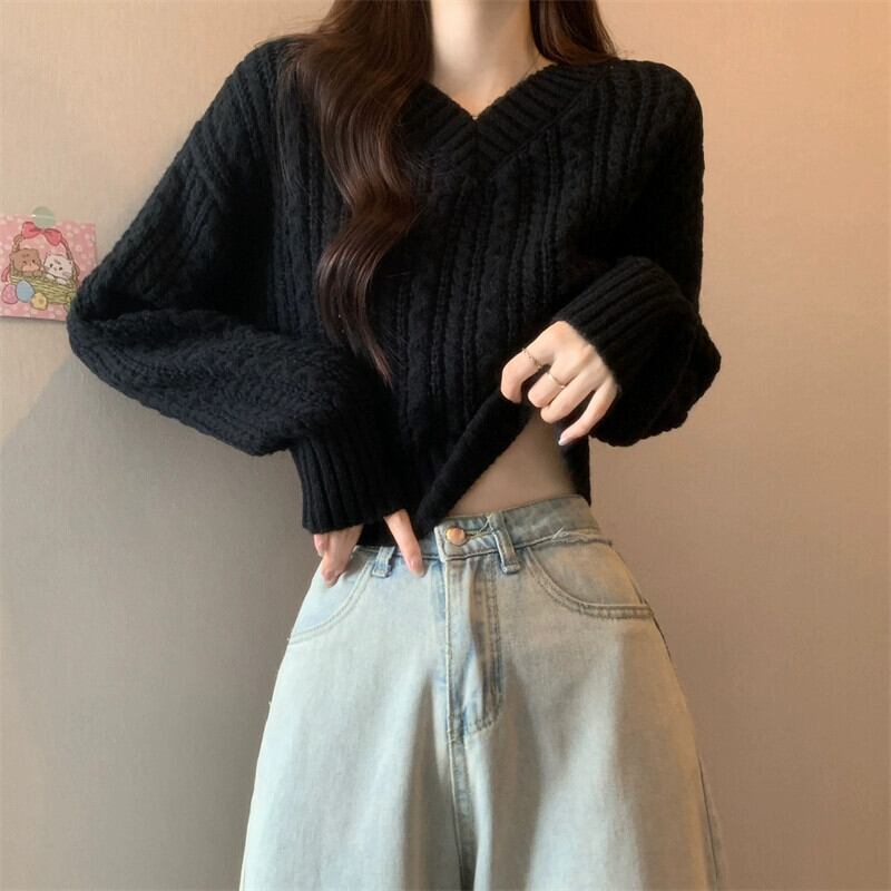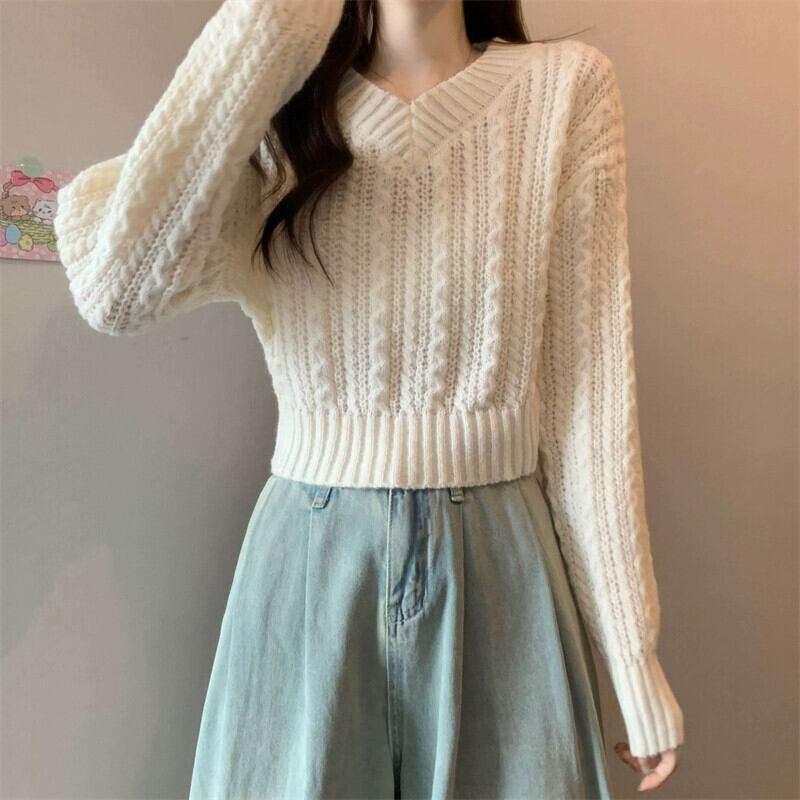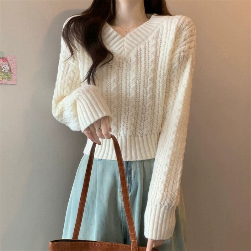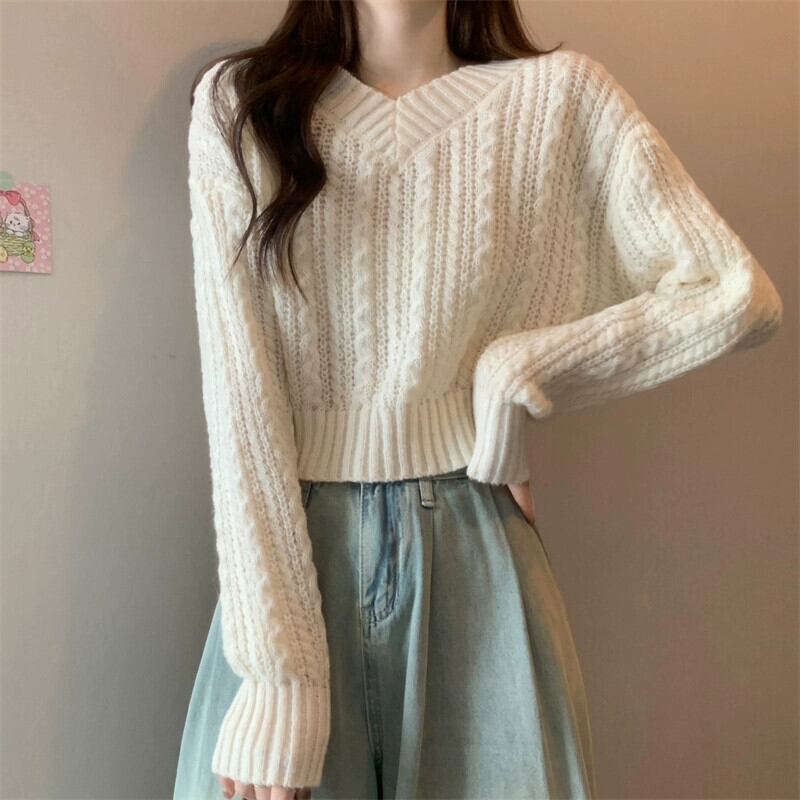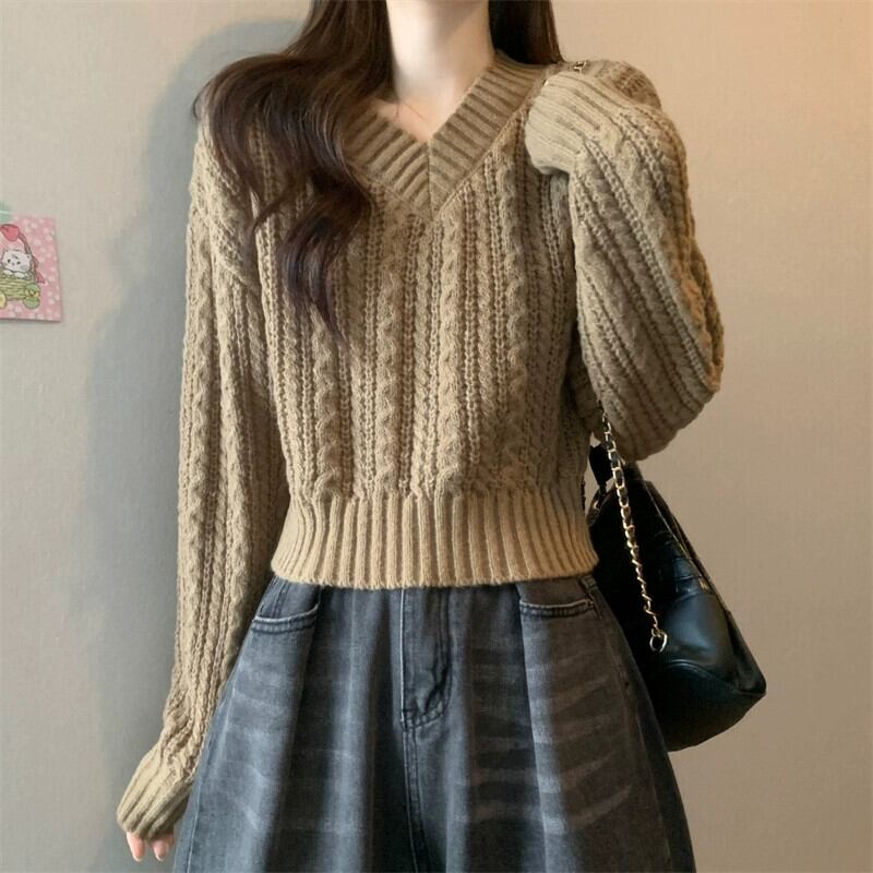 厚く短い太い糸のツイストセーターの女性の秋と冬のフランスのレトロなルーズアウターウェア痩身 V ネック長袖セーター ショート ロング オータム 秋物 ウィンター 冬物 Vネック 7460042723167184 | framboise21