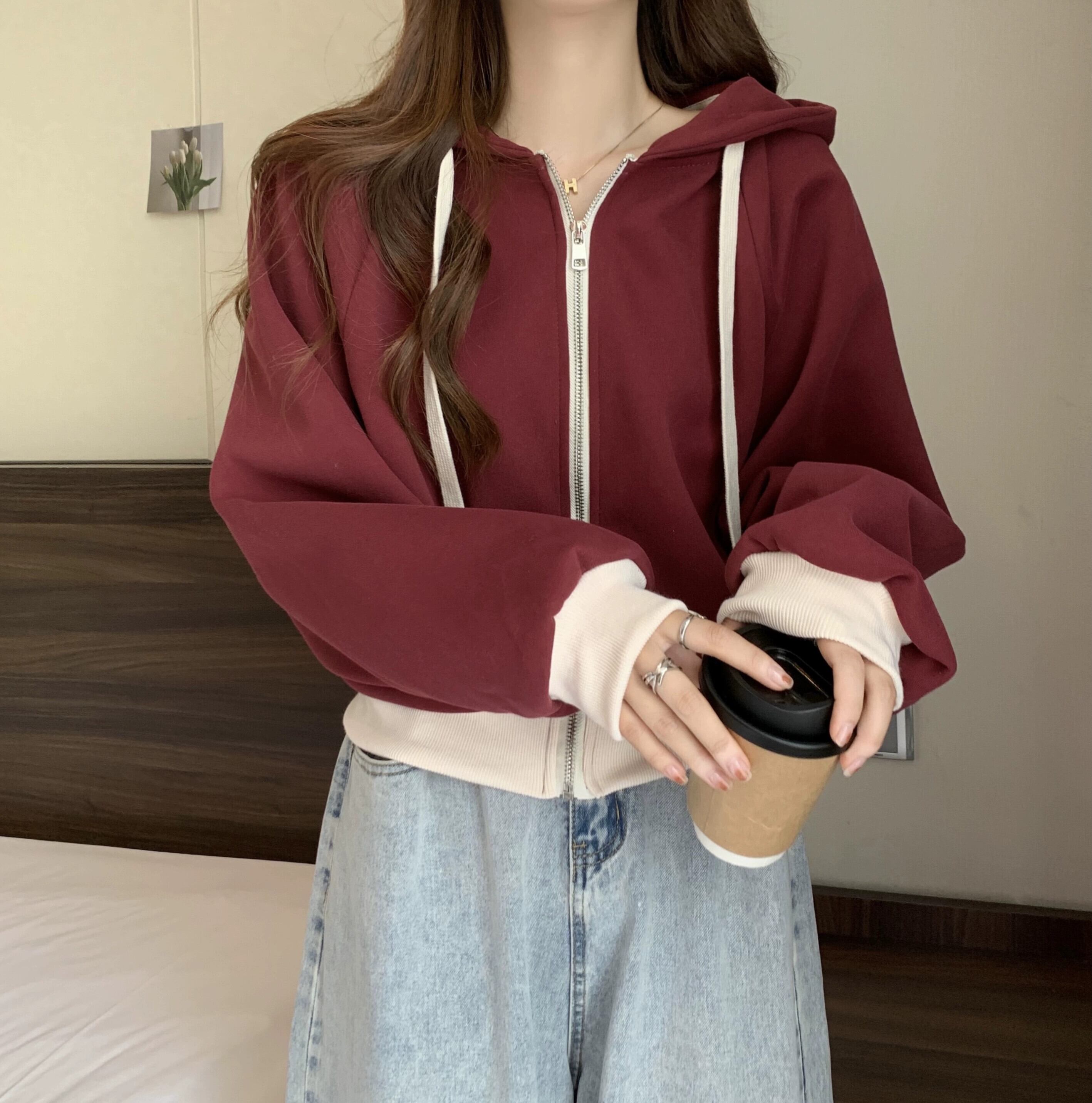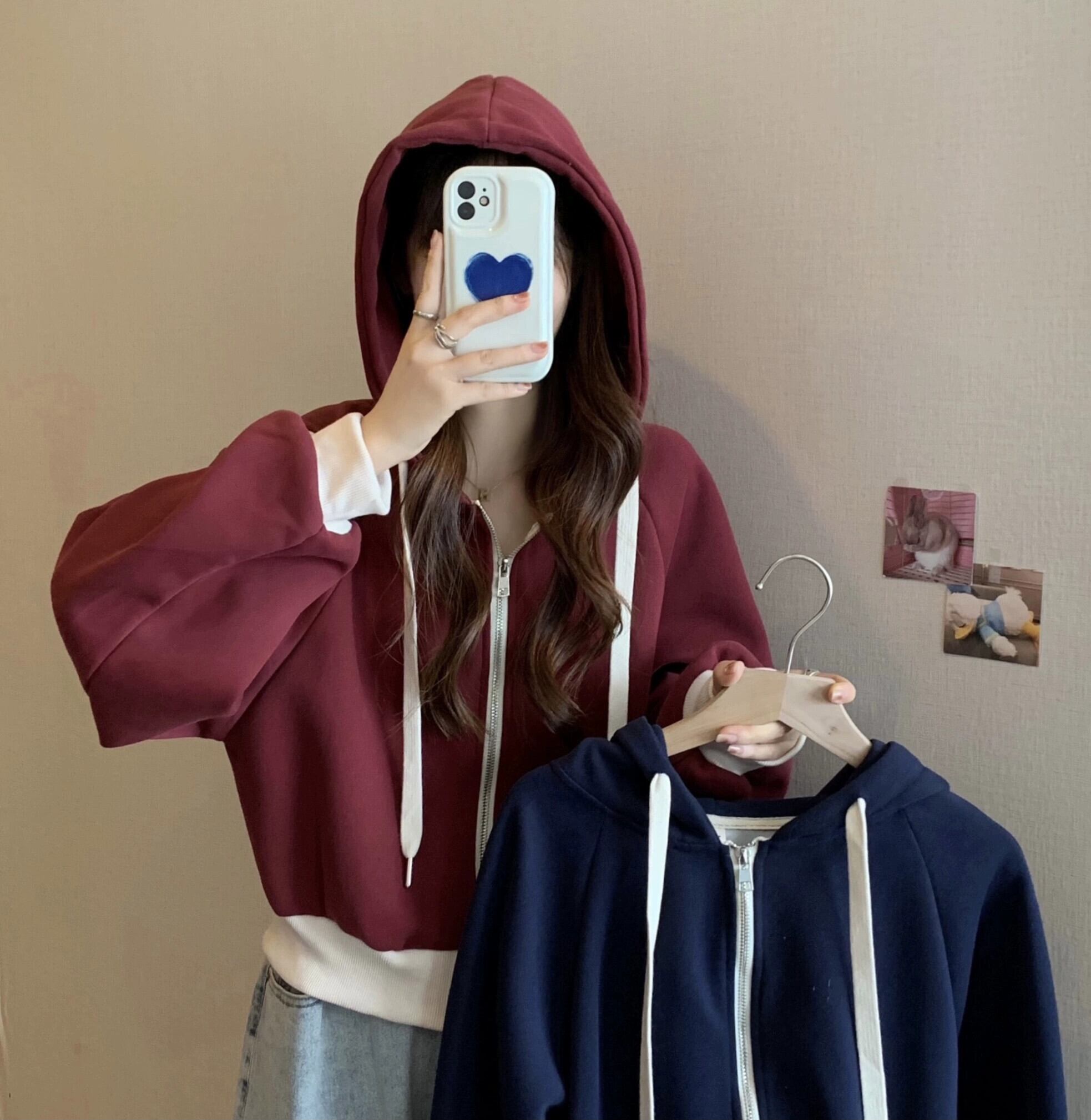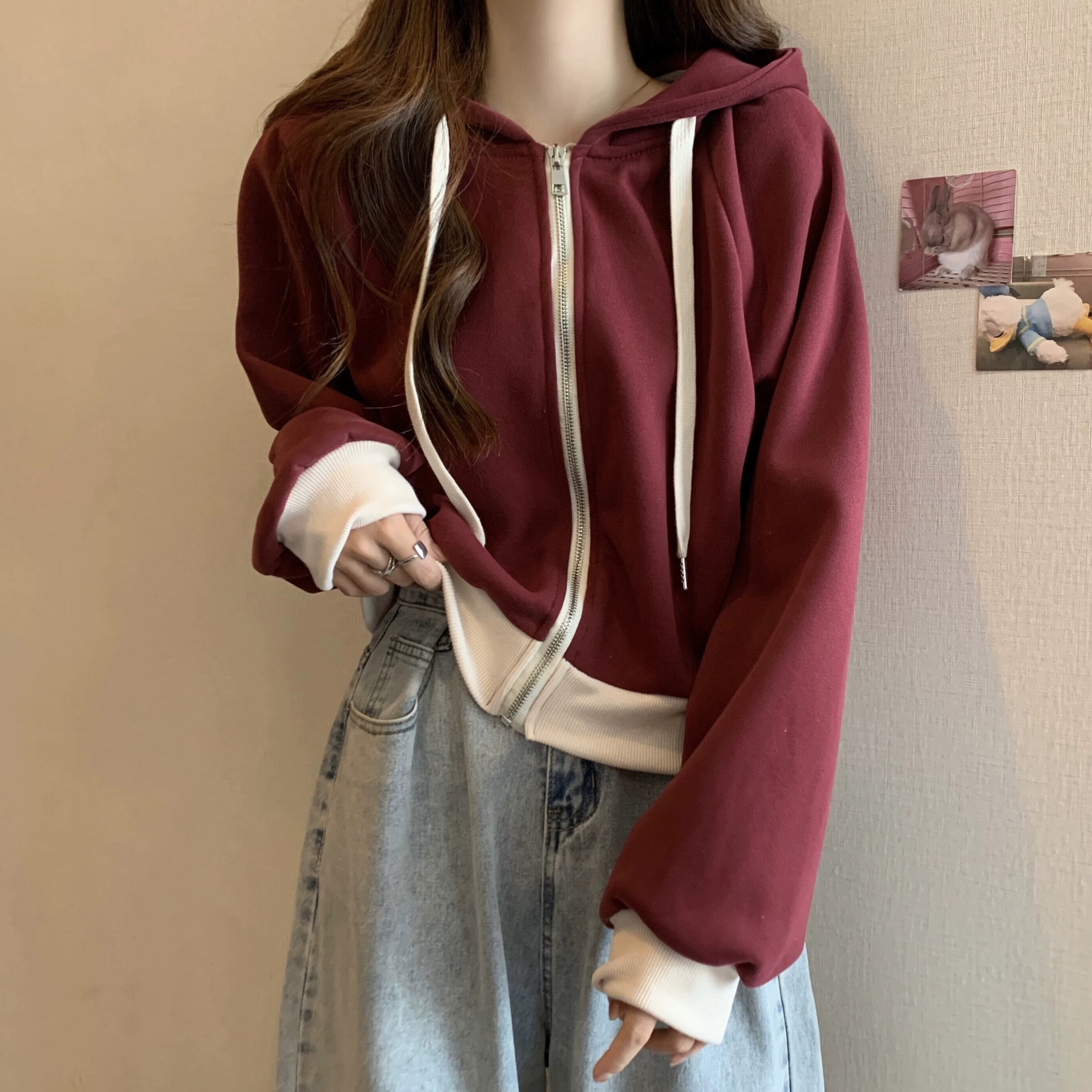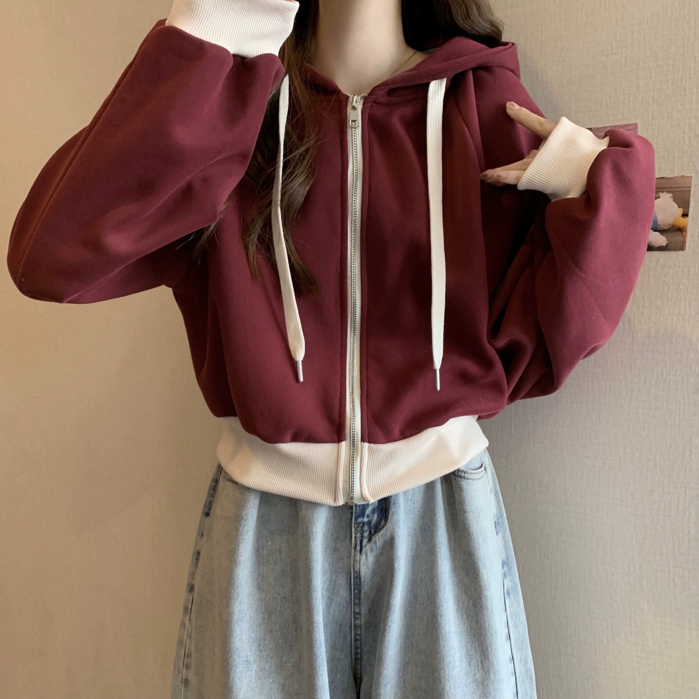 芸術的なレトロなフード付きスウェットシャツの女性の春と秋 2023 新しいスタイルのルーズカジュアル多用途ブルゴーニュジッパージャケット スプリング 春物 オータム 秋物 7460099471656607 | framboise21