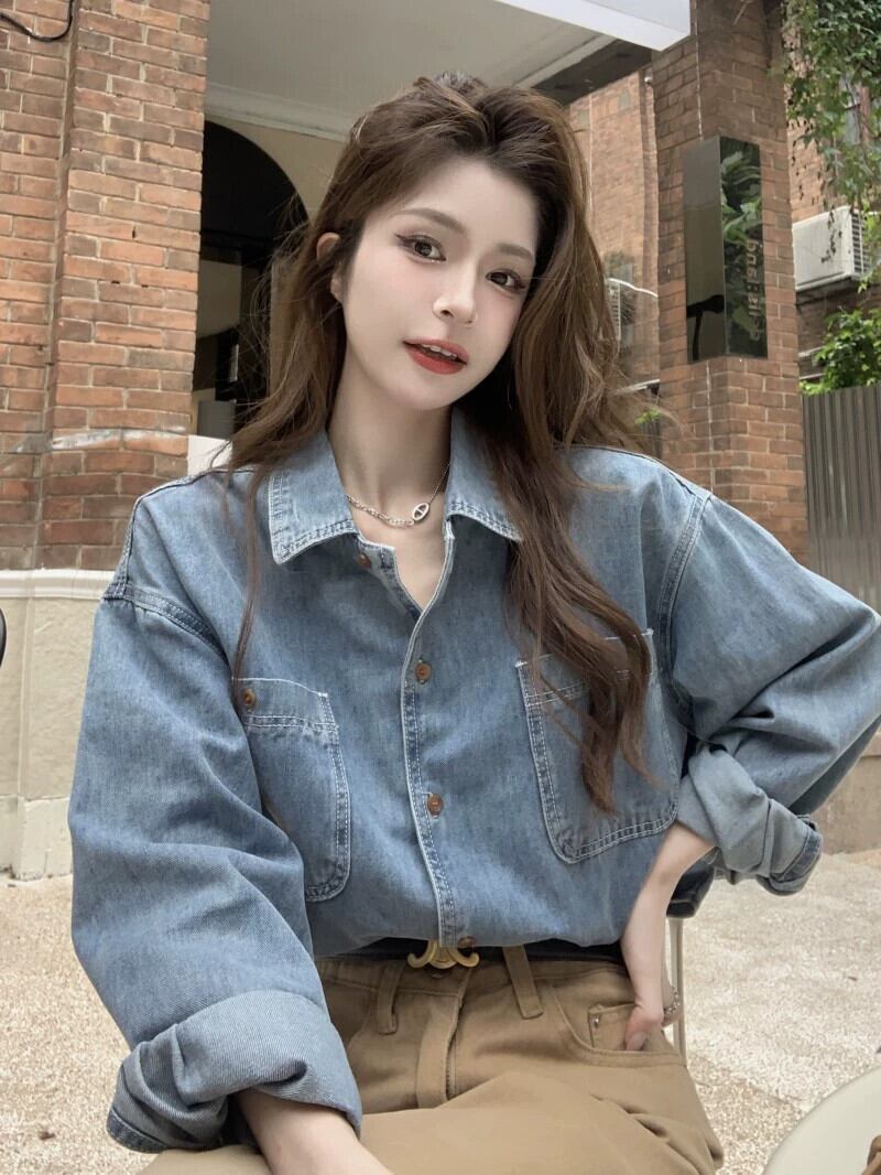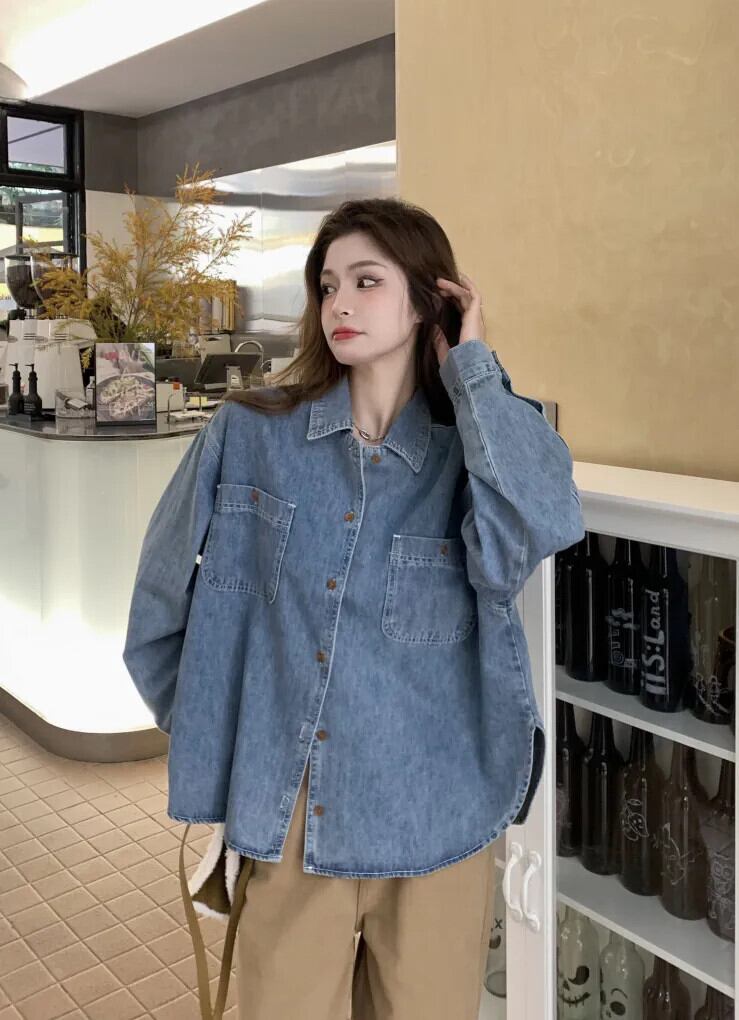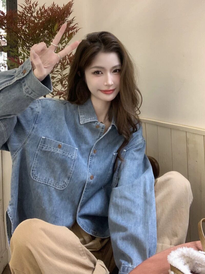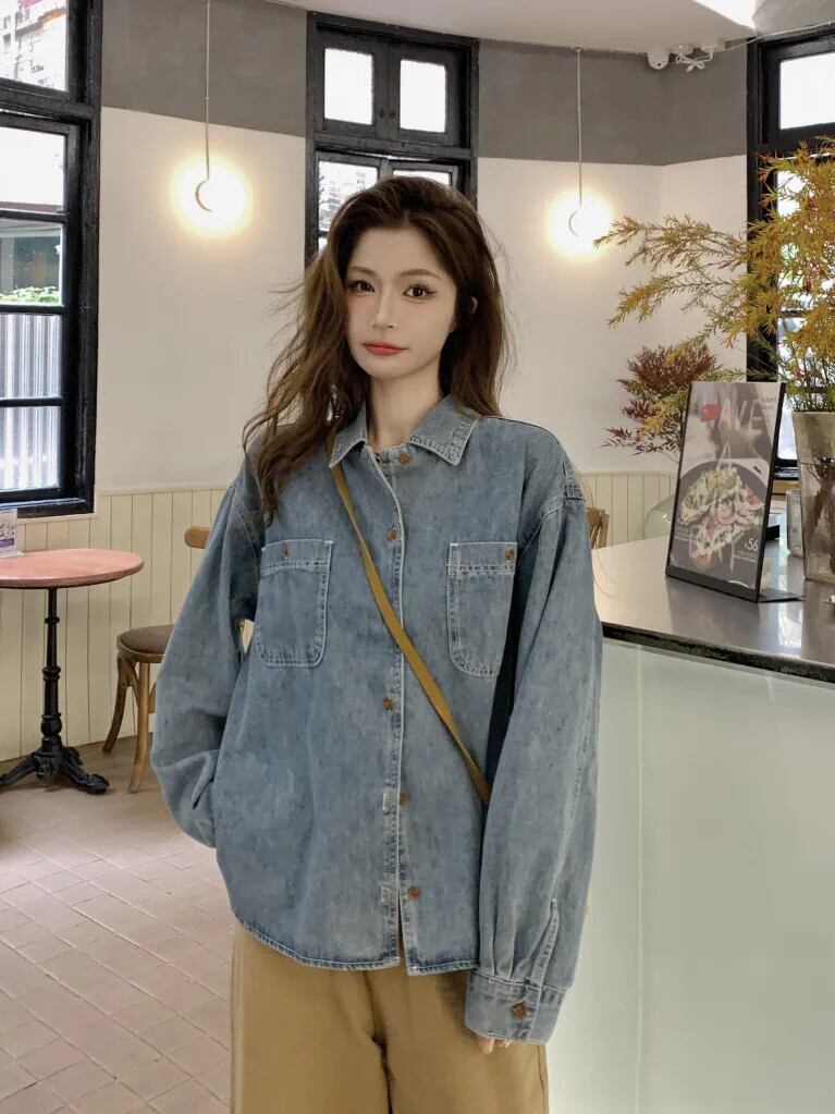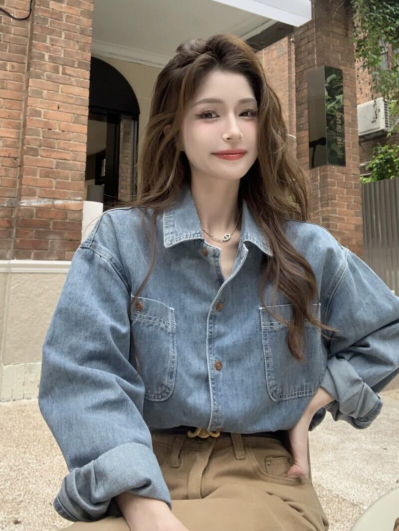 ミッドレングスウォッシュデニムジャケット女性新 2023 春と秋のハイストリートアメカジルーズ万能ブルージャケット カジュアル スプリング 春物 オータム 秋物 7460079568118840 | framboise21