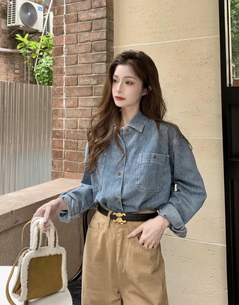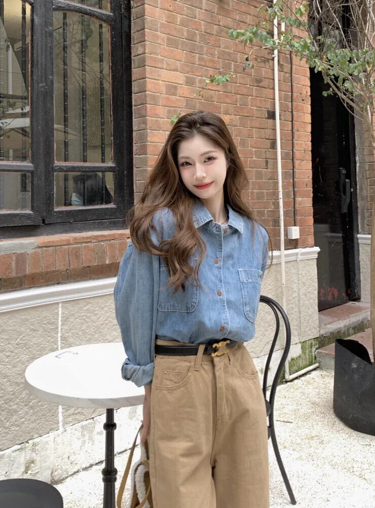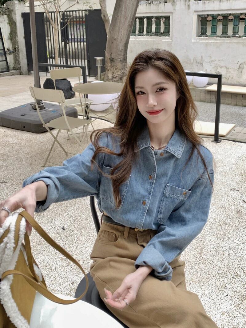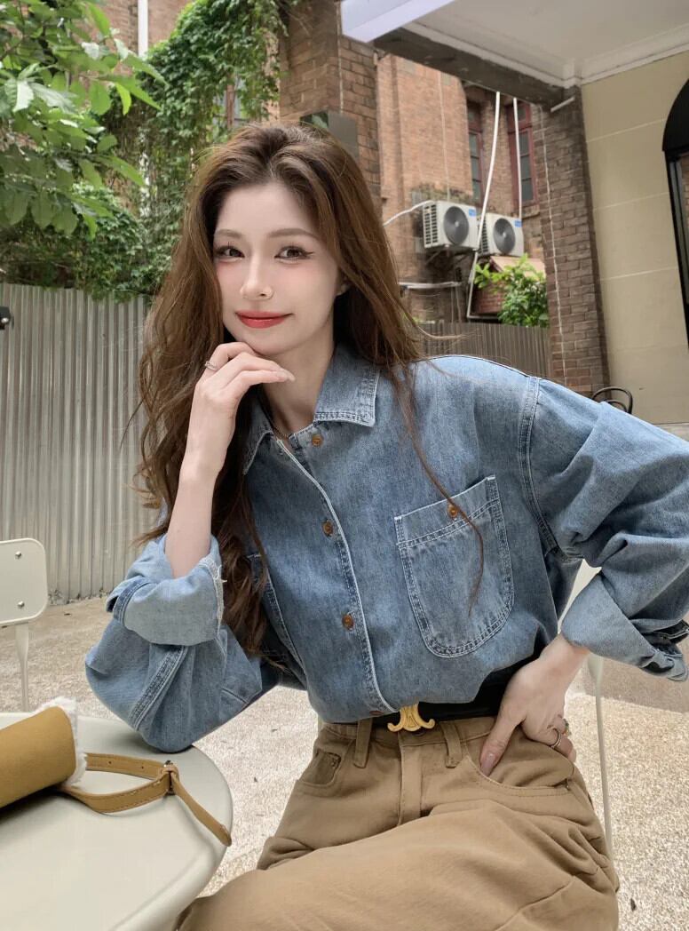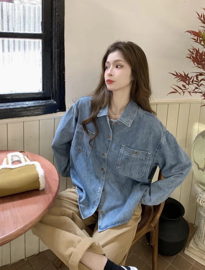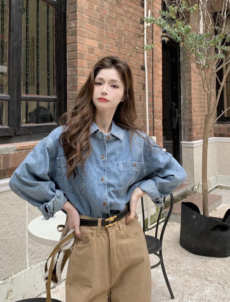 ミッドレングスウォッシュデニムジャケット女性新 2023 春と秋のハイストリートアメカジルーズ万能ブルージャケット カジュアル スプリング 春物 オータム 秋物 7460079568118840 | framboise21