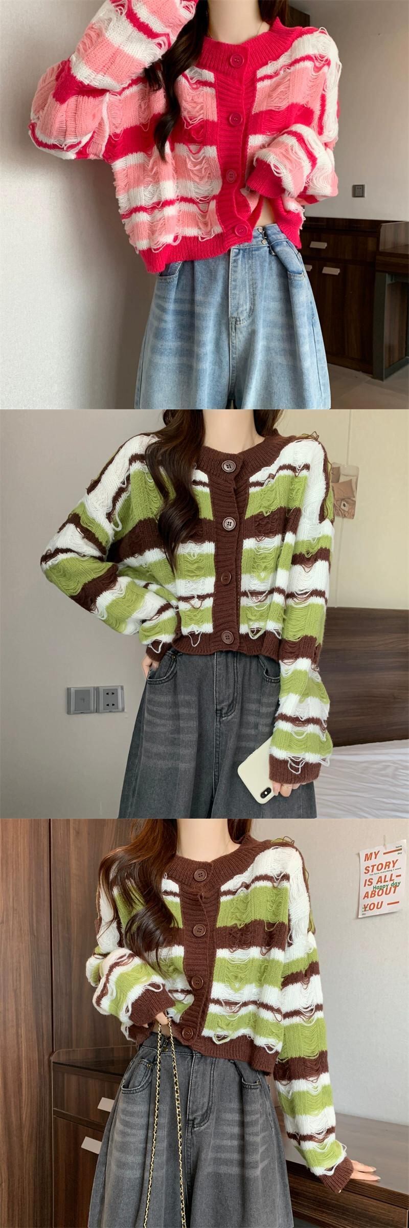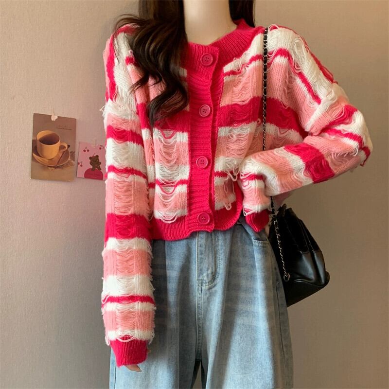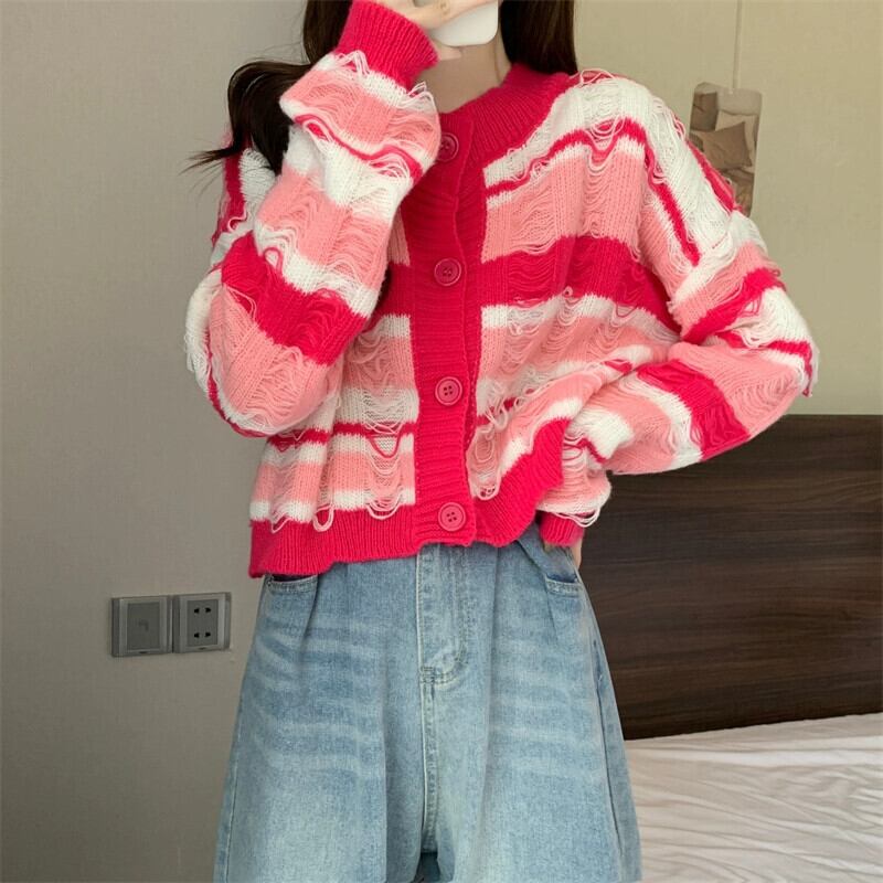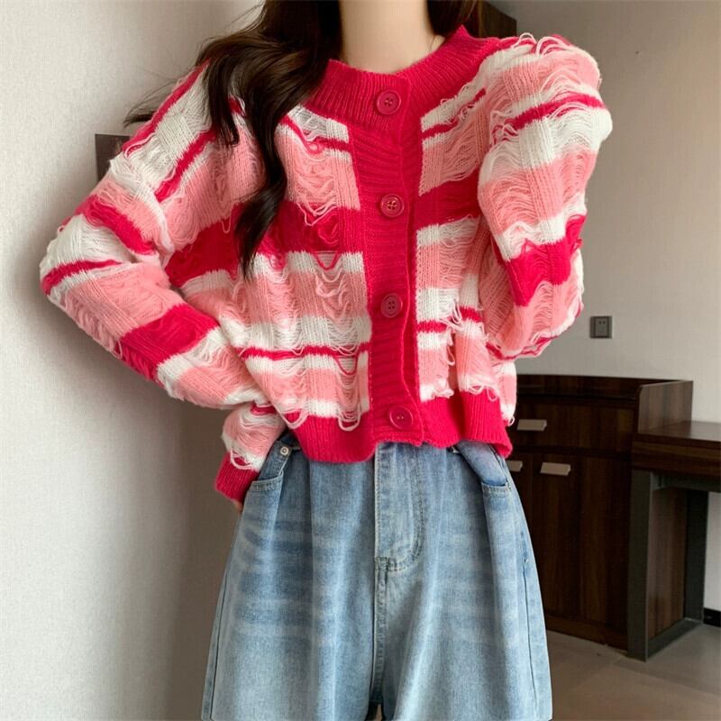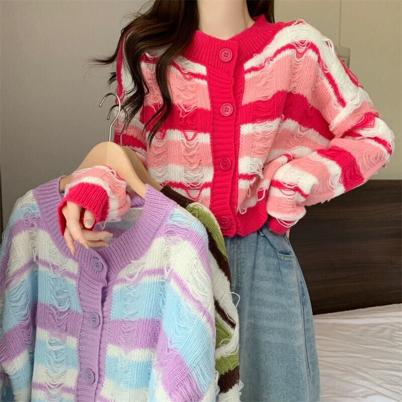 コントラストストライプショートセータージャケット女性の秋と冬のフランスのレトロなルーズアウターウェア多用途ホールニットカーディガン オータム 秋物 ウィンター 冬物 7460091133468535 | framboise21