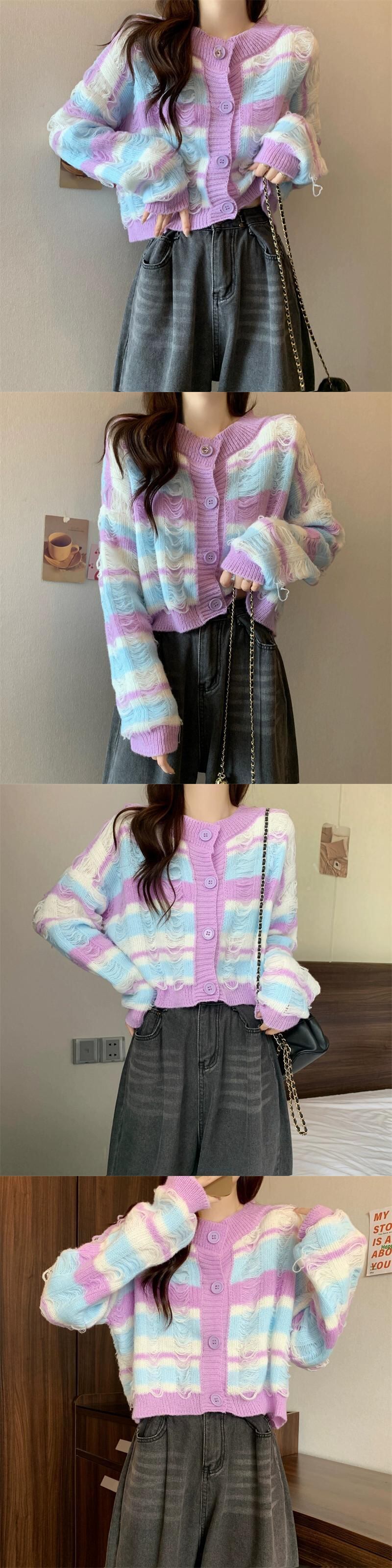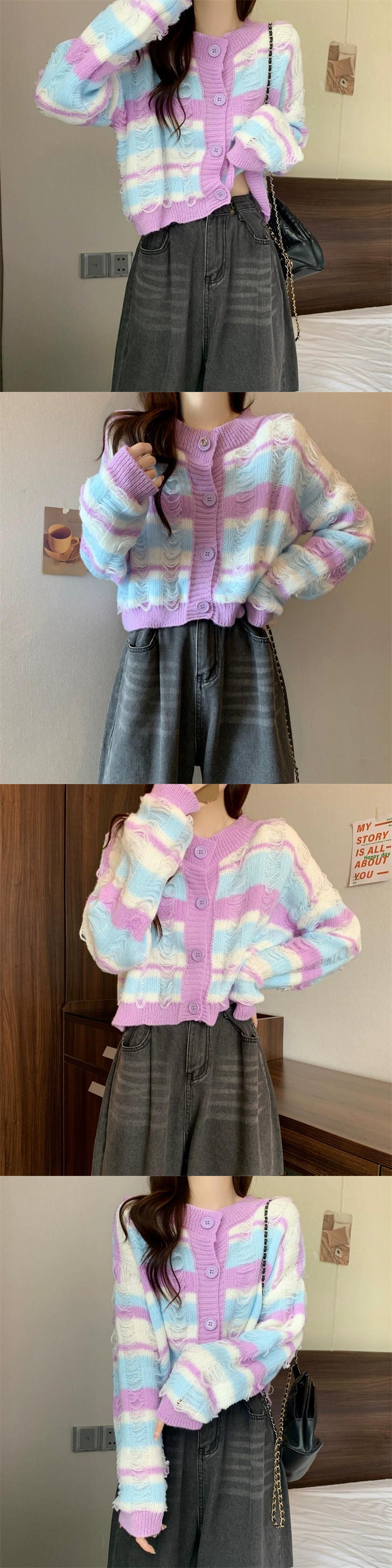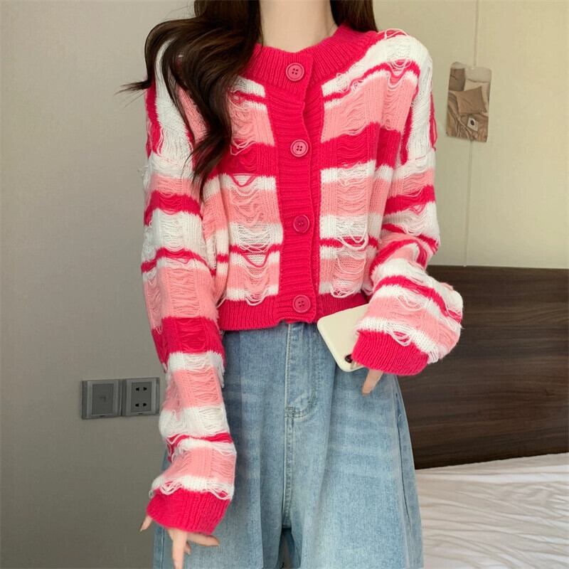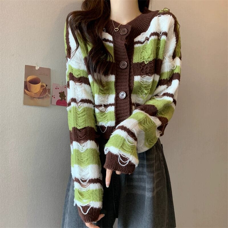 コントラストストライプショートセータージャケット女性の秋と冬のフランスのレトロなルーズアウターウェア多用途ホールニットカーディガン オータム 秋物 ウィンター 冬物 7460091133468535 | framboise21
