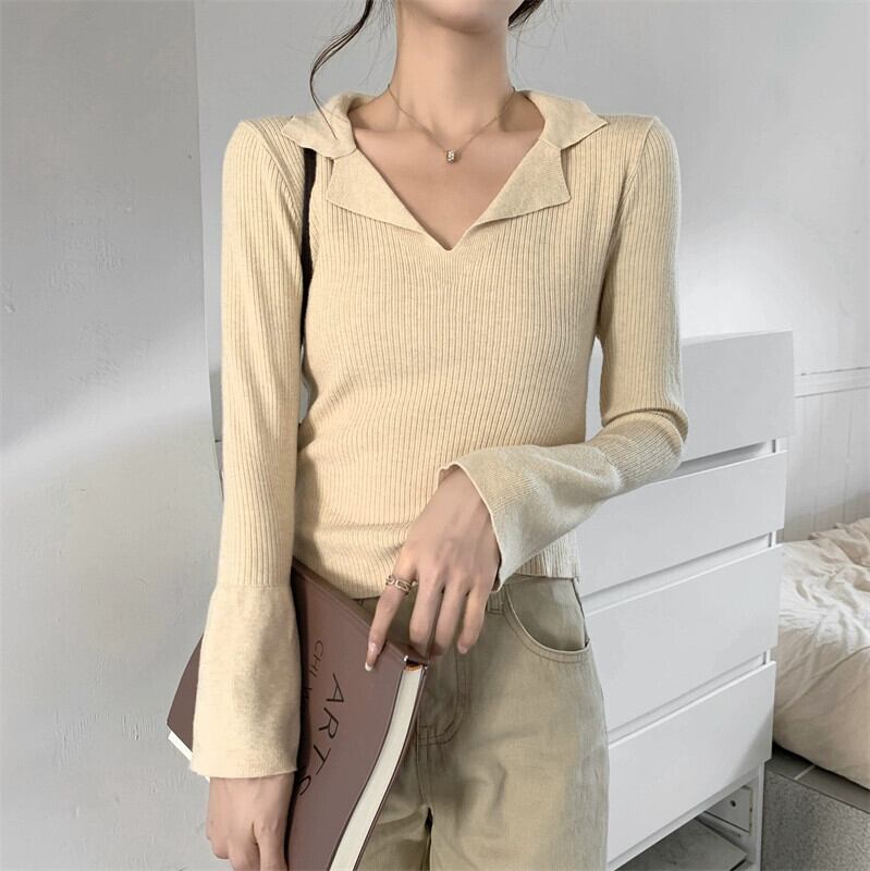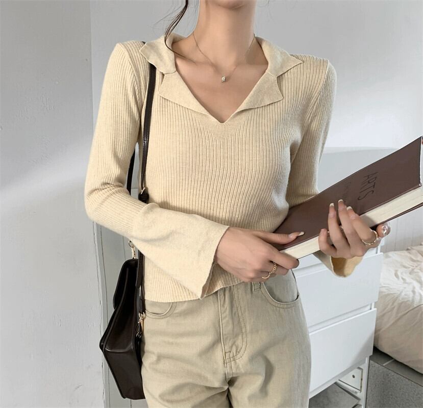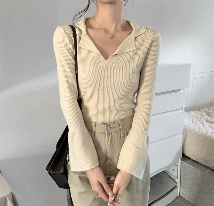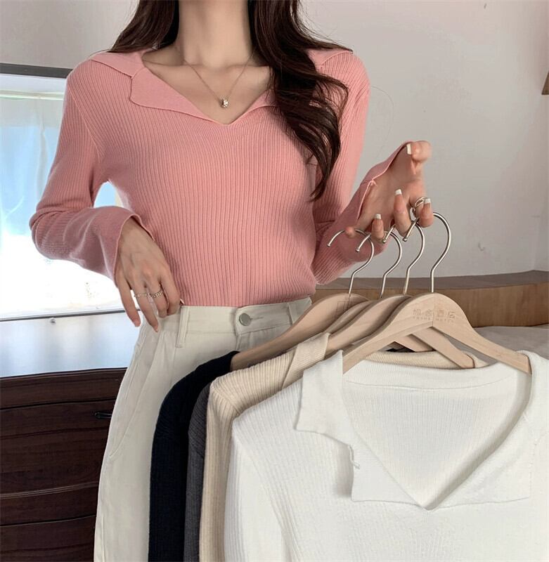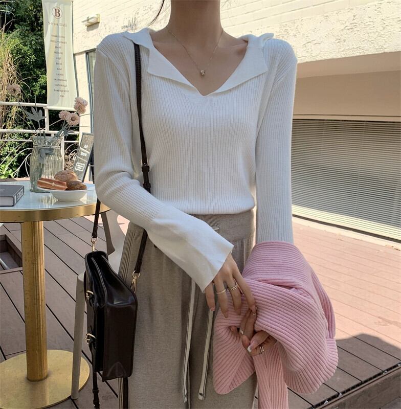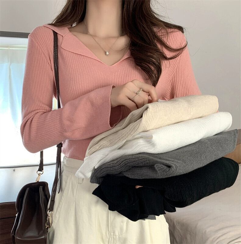 グレーの V ネックボトリングシャツ 2023 新しい女性の秋冬インナーセーター、ファッショナブルでスリムで多用途の長袖ニットトップ ロング オータム 秋物 ウィンター 冬物 Vネック 7460060853331819 | framboise21