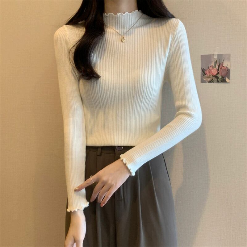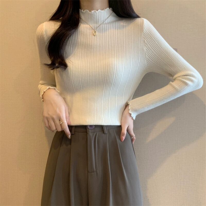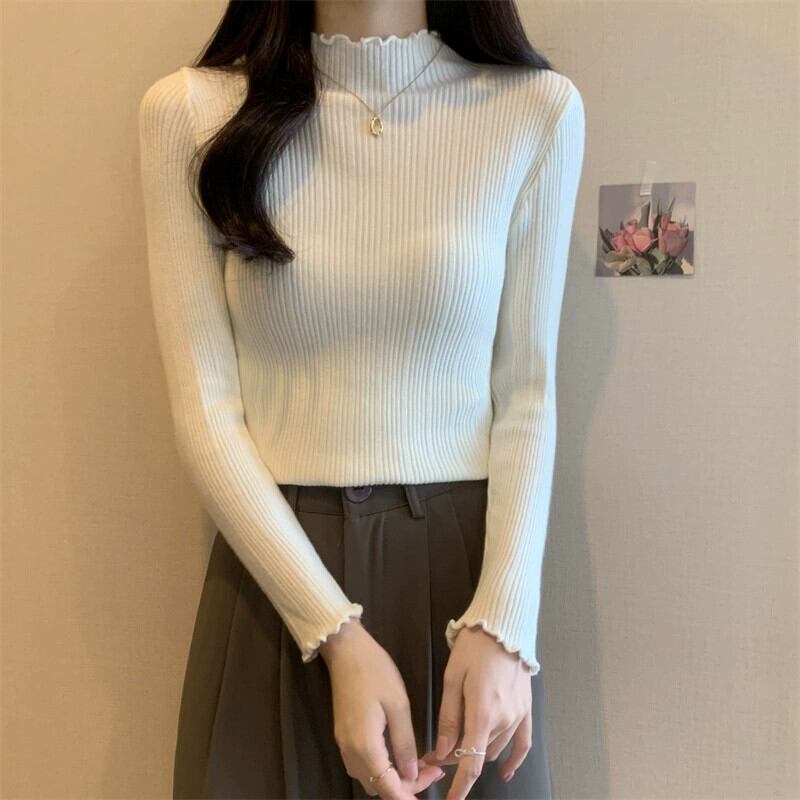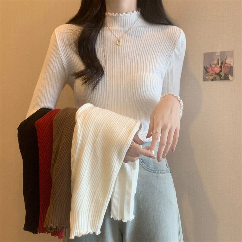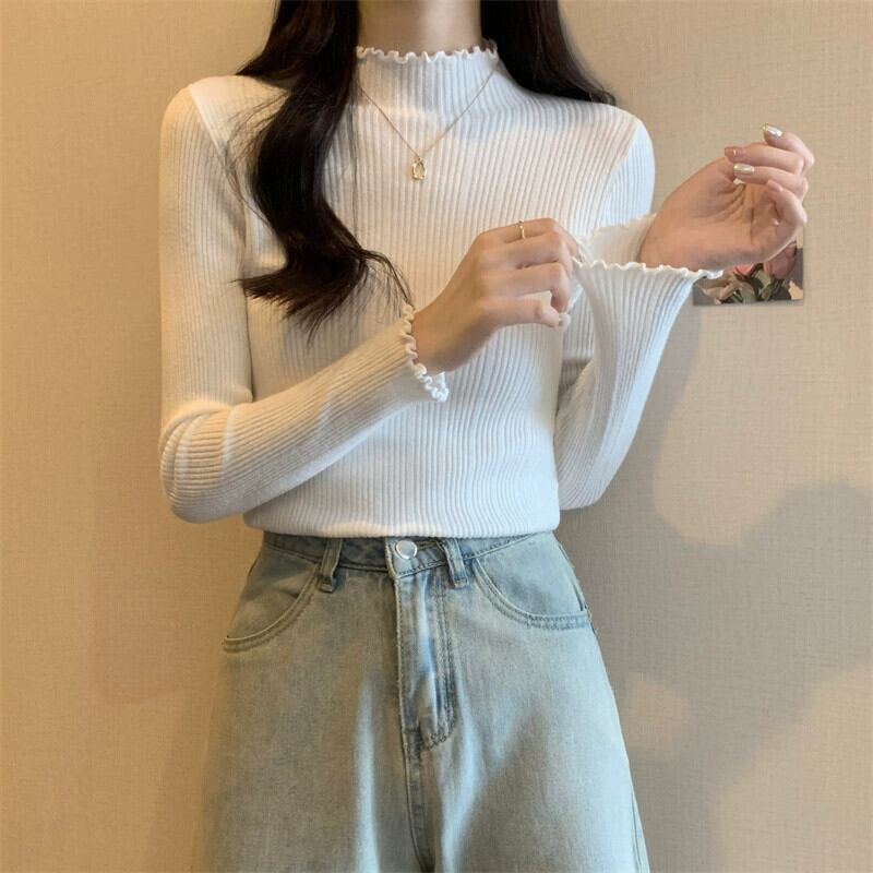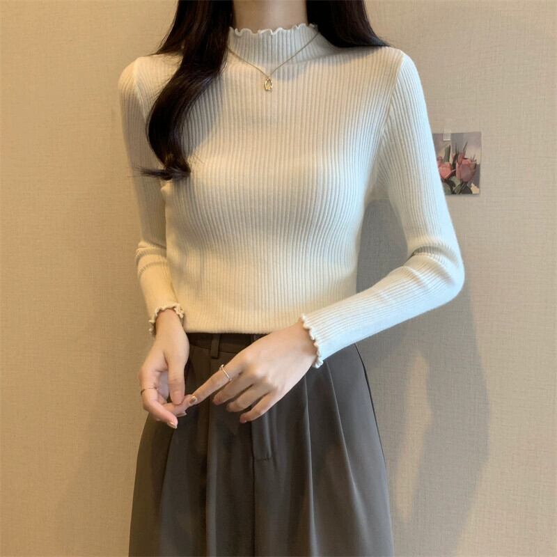 秋と冬のハーフタートルネックボトリングシャツ女性、コートとセーター、ファッショナブルでウエスタンスタイルのスリムフィットミッドカラーニットセーター、イヤリング付き オータム 秋物 ウィンター 冬物 指輪 7460010004639615 | framboise21
