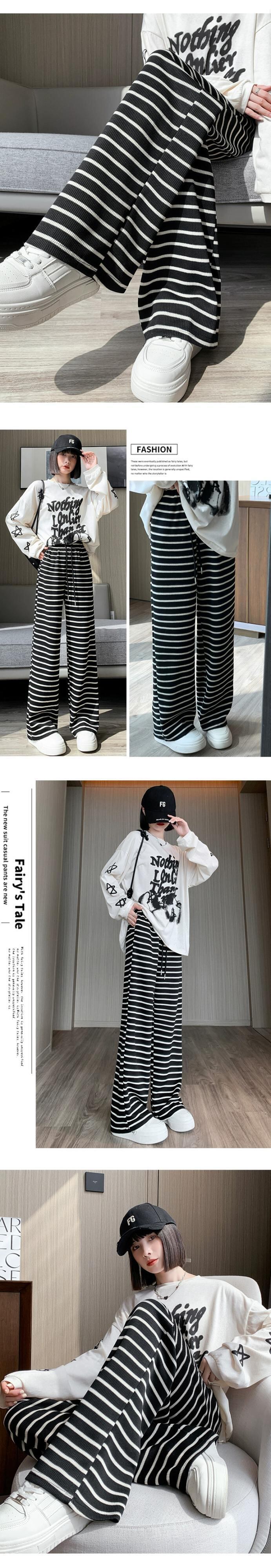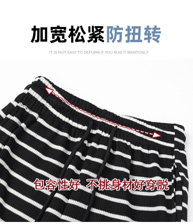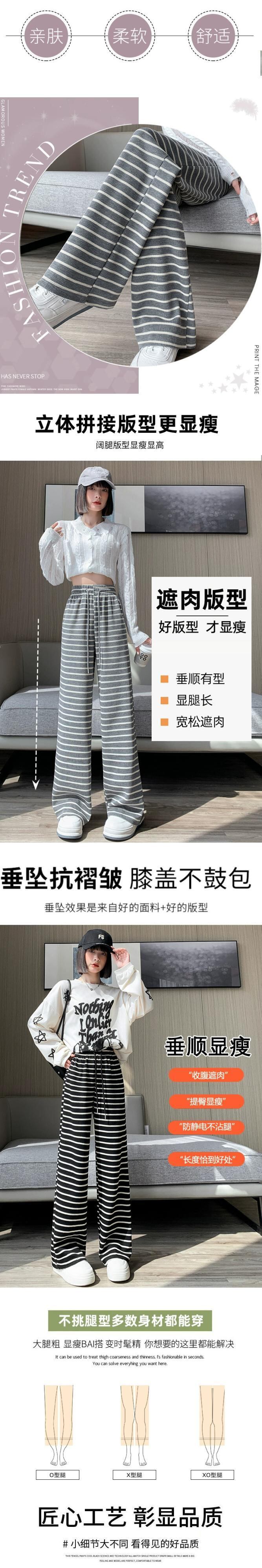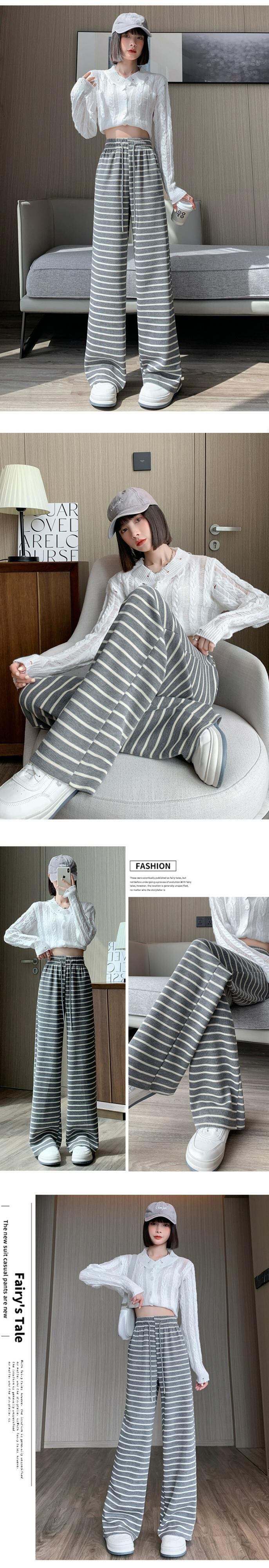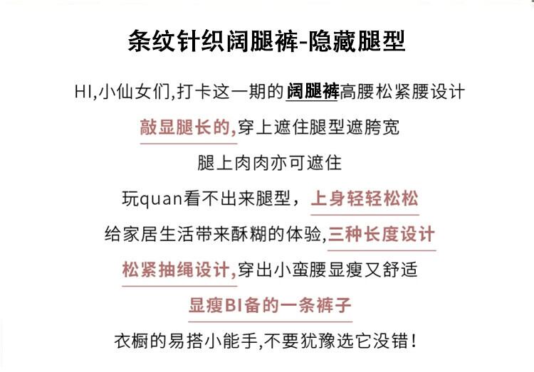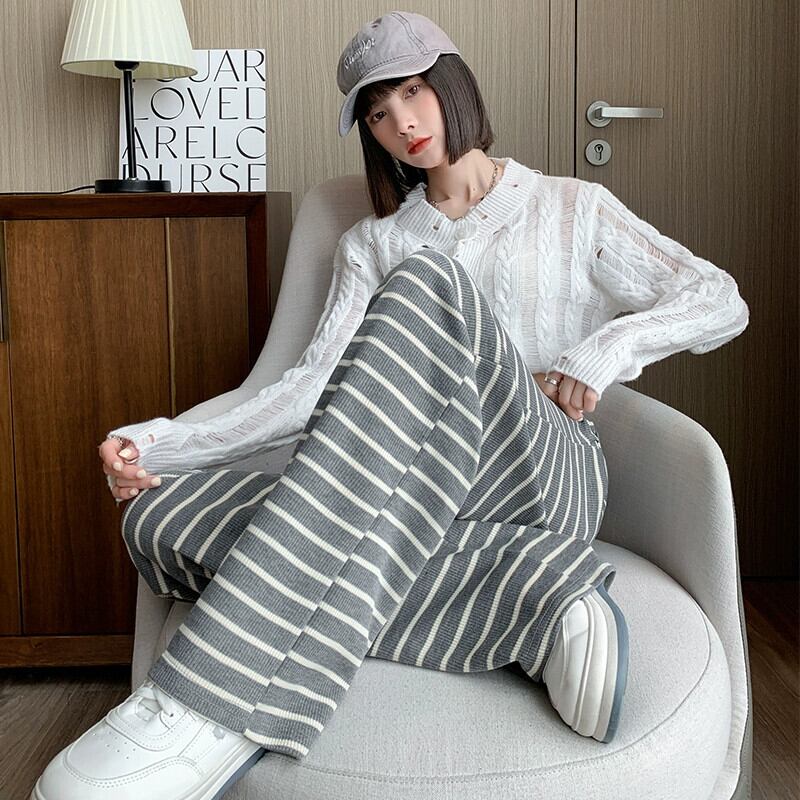 秋と冬のストライプの狭いワイドレッグパンツの女性、ハイウエストのソフトでワックス状のニットパンツ、ルーズでスリムなフロアレングスのストレートカジュアルパンツ オータム 秋物 ウィンター 冬物 7460034240200557 | framboise21