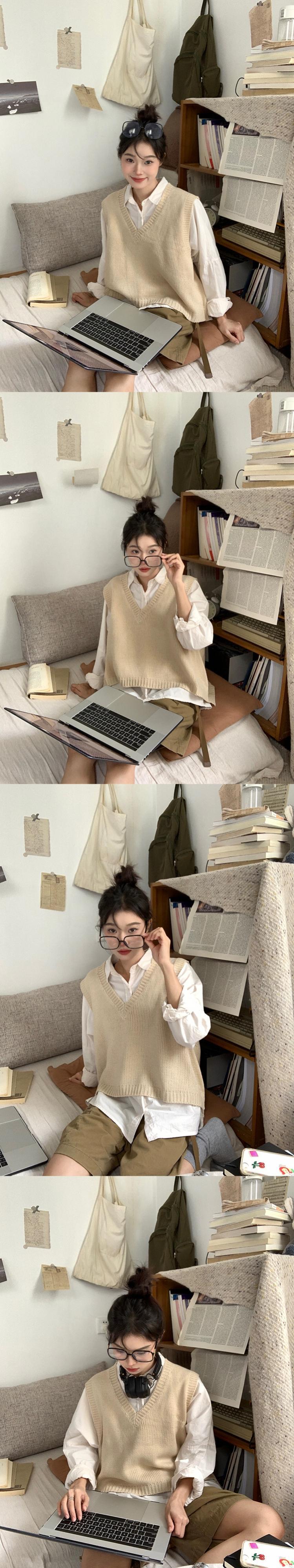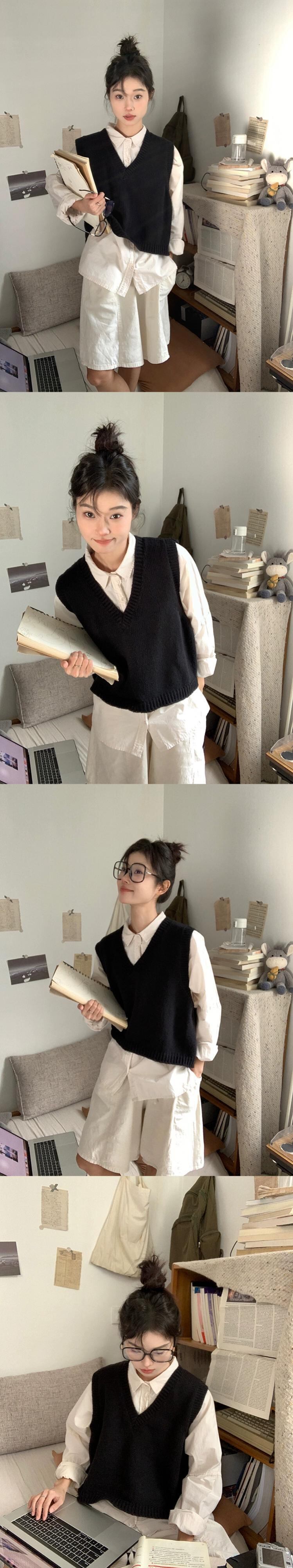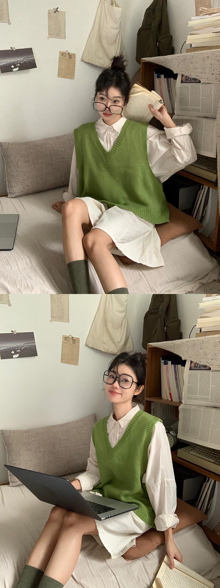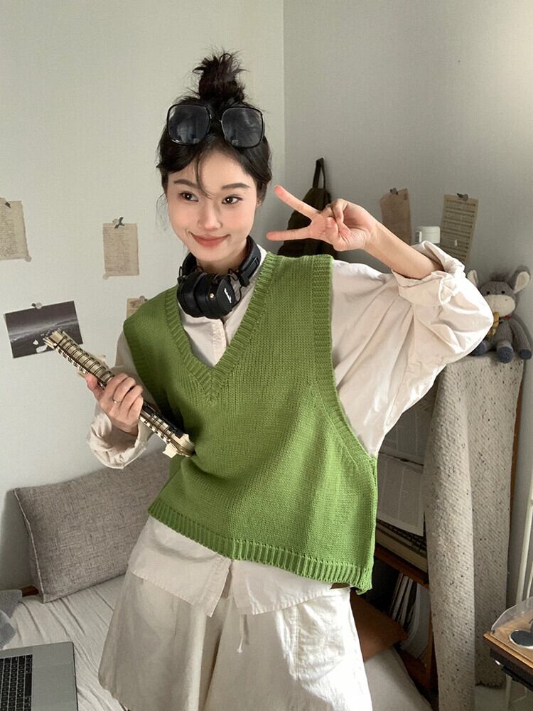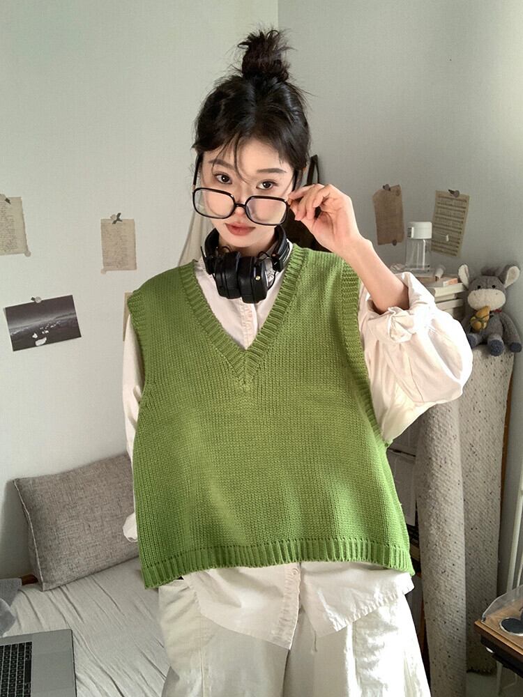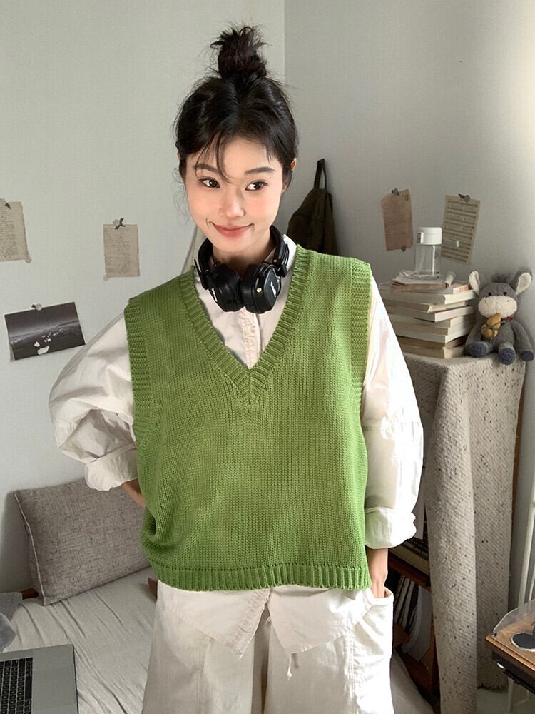 秋と冬のノースリーブ V ネック ニット ベストの女性、カレッジ スタイルのこれらのスタイルの重ね着、ゆったりとしたアウターウェア、短いチョッキのセーター ショート オータム 秋物 ウィンター 冬物 Vネック 7460016986510578 | framboise21