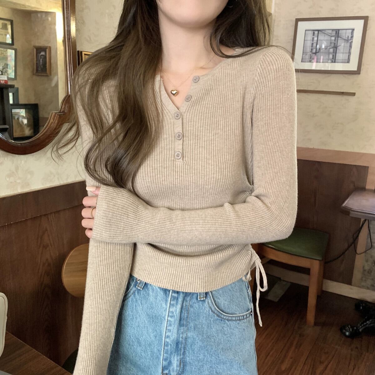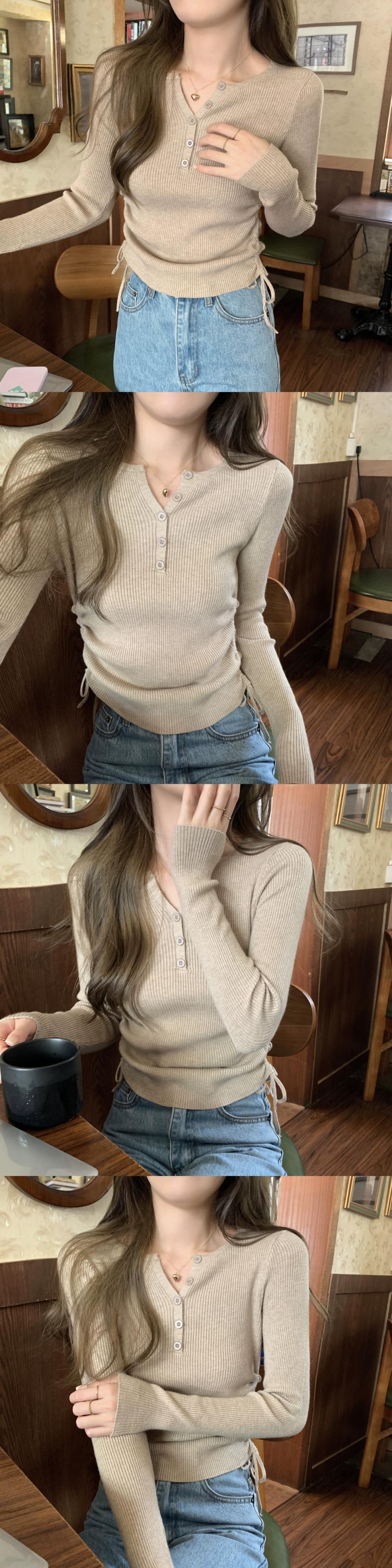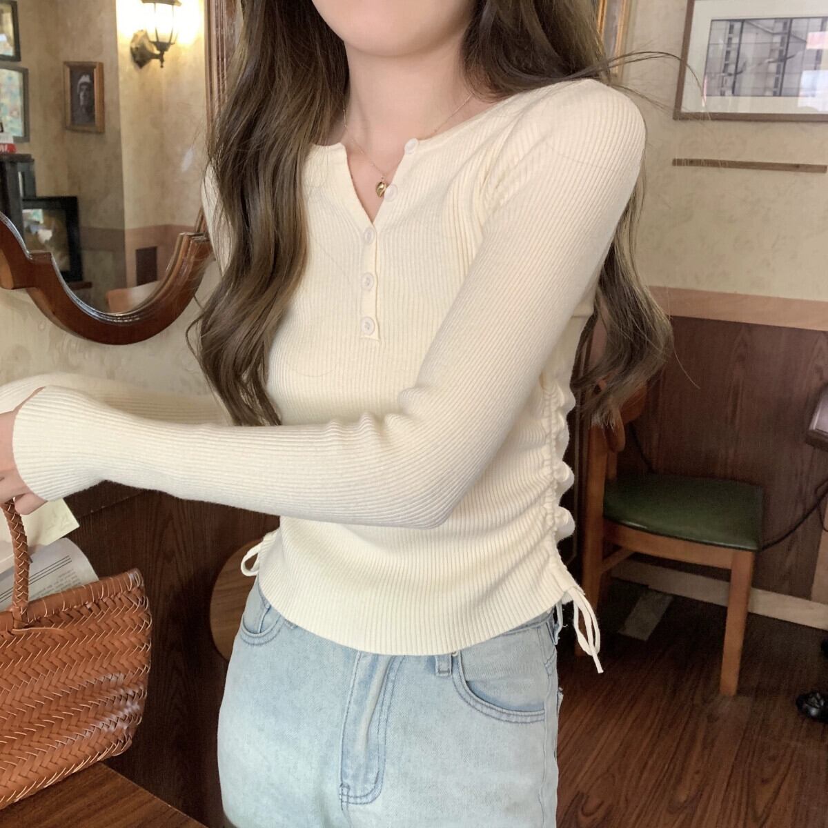 秋と冬のVネックショートボトムシャツ女性、ファッショナブルでスリム、レースアッププリーツ長袖セーター付き ロング オータム 秋物 ウィンター 冬物 7460036256129301 | framboise21