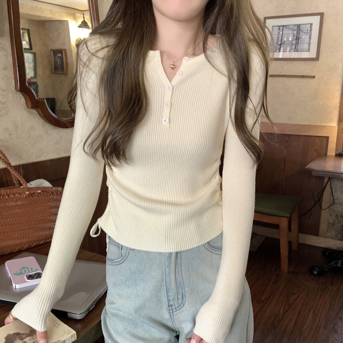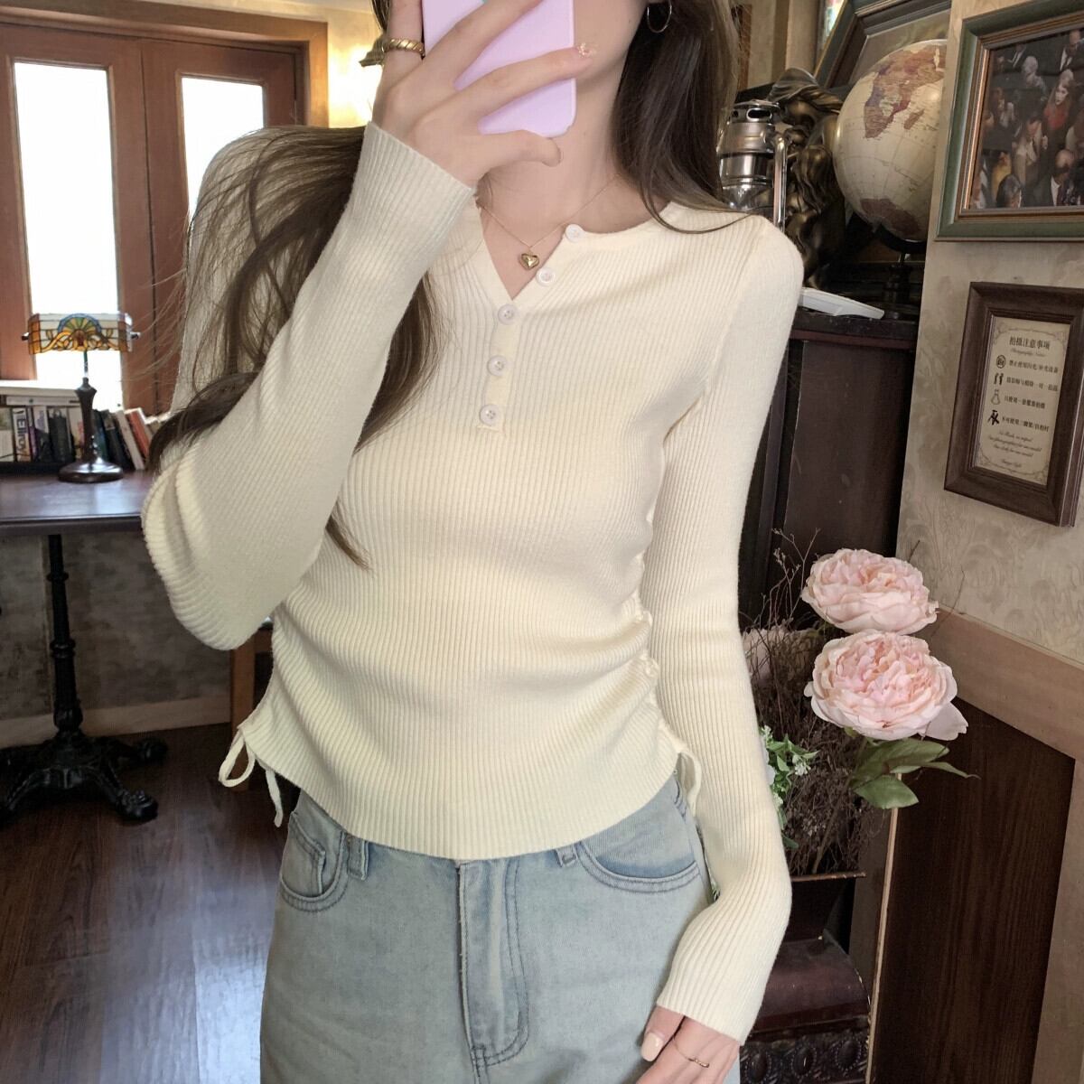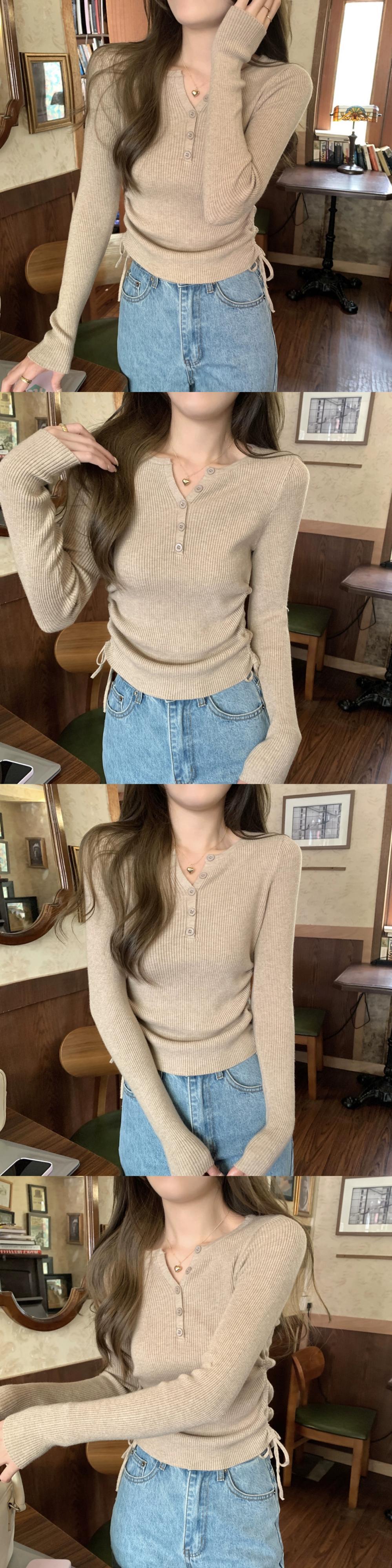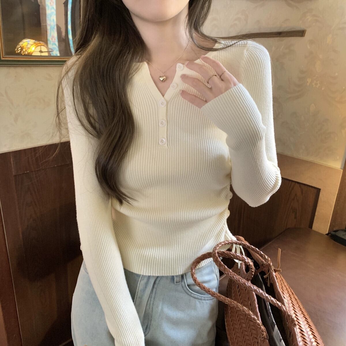 秋と冬のVネックショートボトムシャツ女性、ファッショナブルでスリム、レースアッププリーツ長袖セーター付き ロング オータム 秋物 ウィンター 冬物 7460036256129301 | framboise21