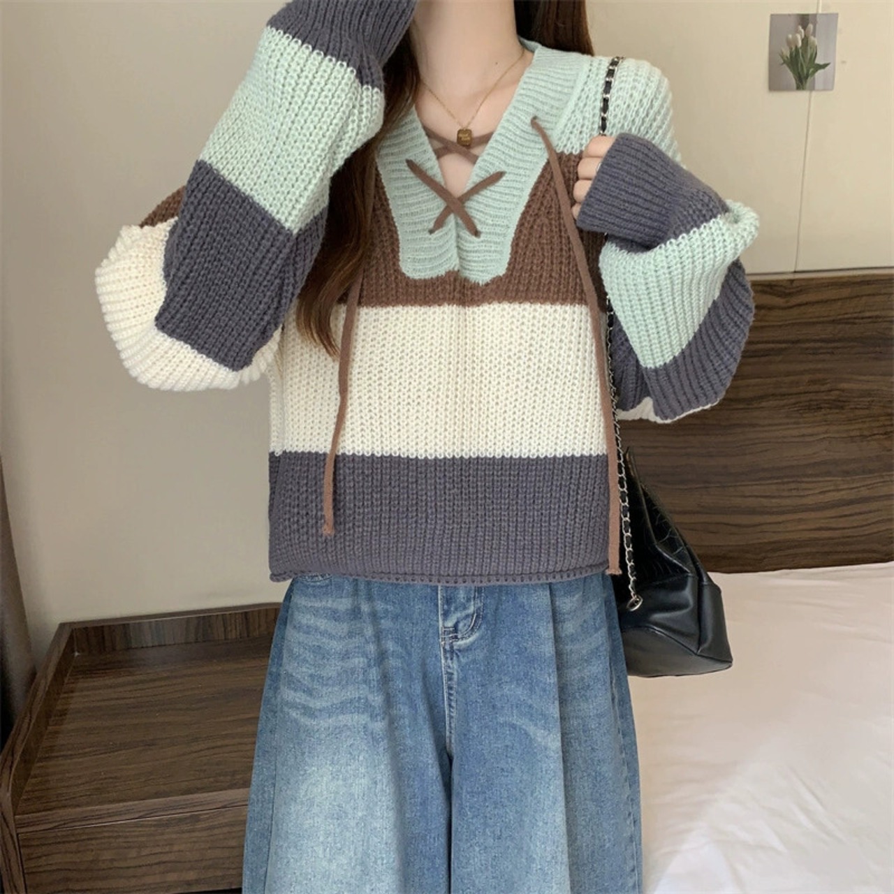 ストライプの短い太いラインのセーターの女性の秋と冬のレトロなルーズアウターウェアスリムプルオーバーレースアップvネック長袖セーター ショート ロング オータム 秋物 ウィンター 冬物 7460014899798325