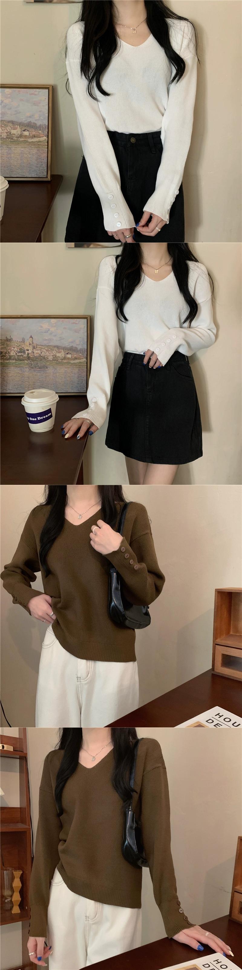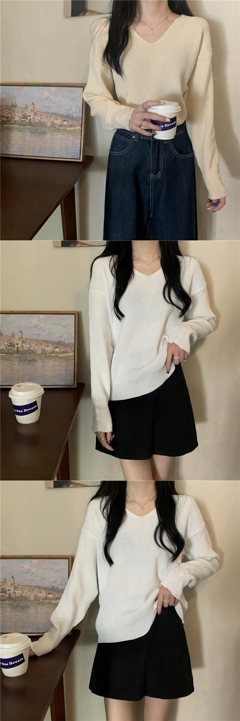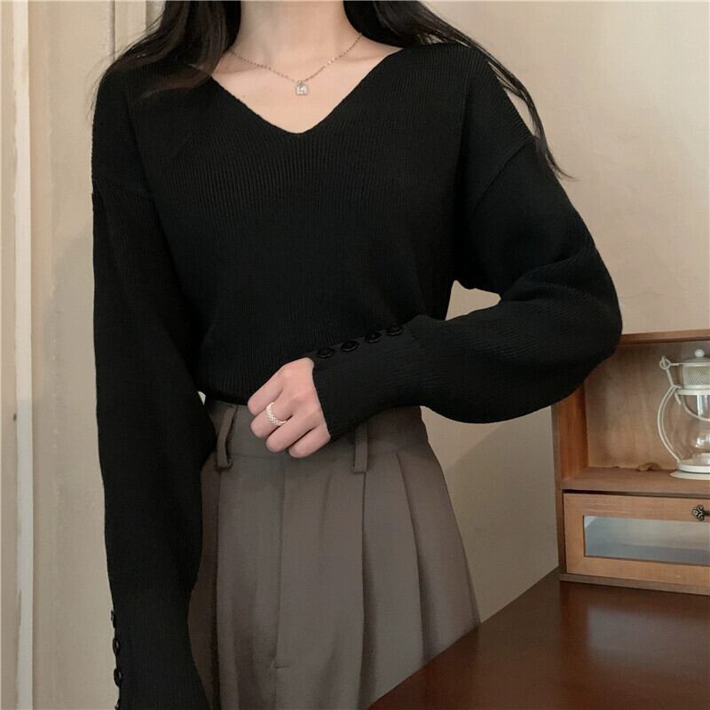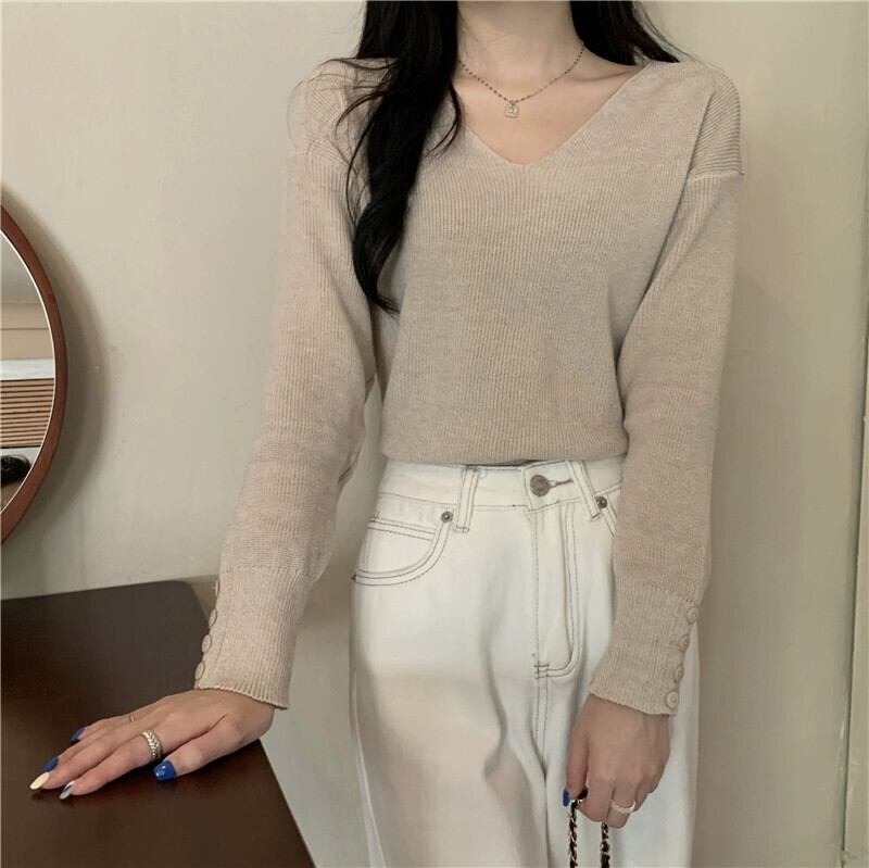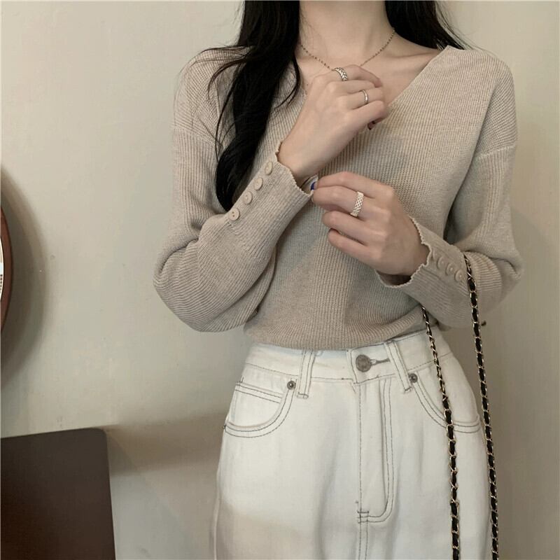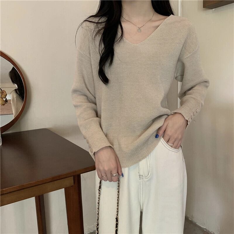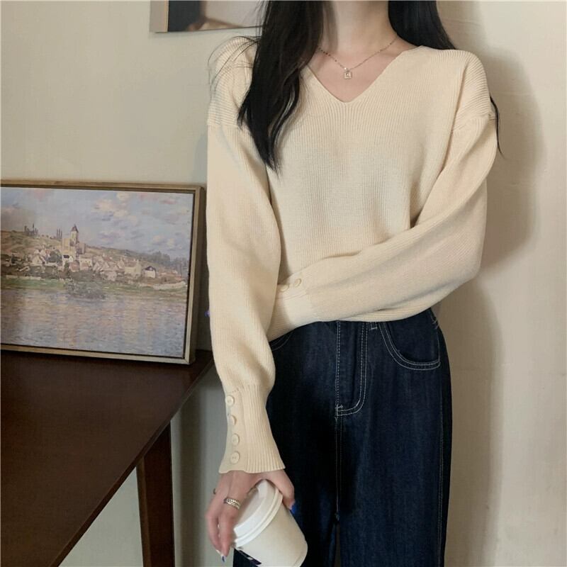 女性の秋と冬のファッショナブルな、ルーズでスリムなプルオーバー長袖ニット セーター、コートの下に V ネックのボトリング シャツが付いています。 ロング オータム 秋物 ウィンター 冬物 Vネック 7460052077385419 | framboise21