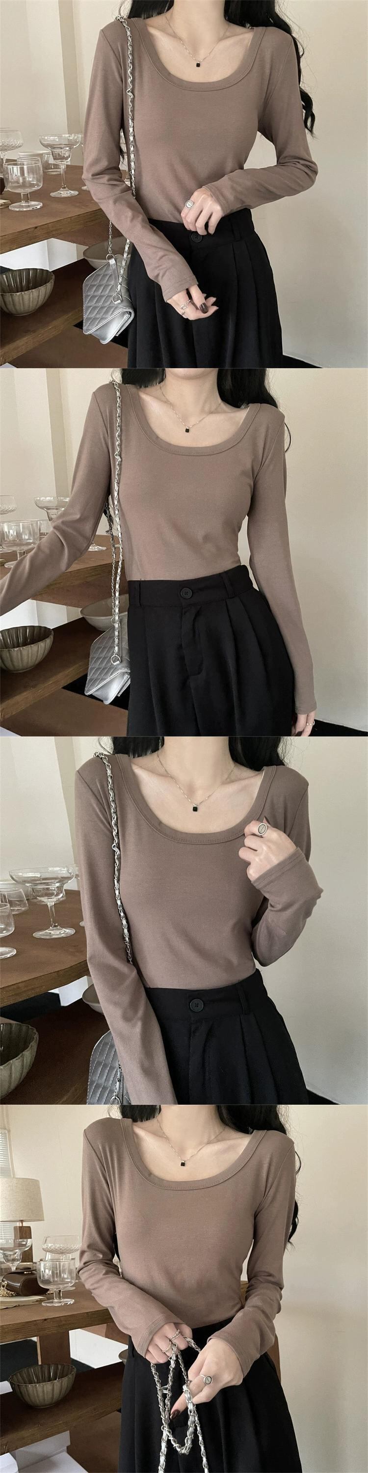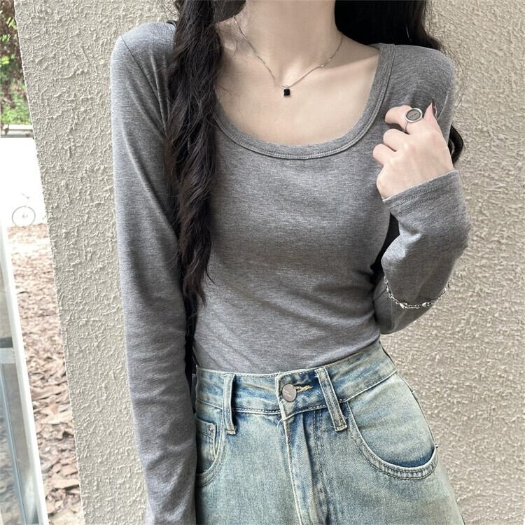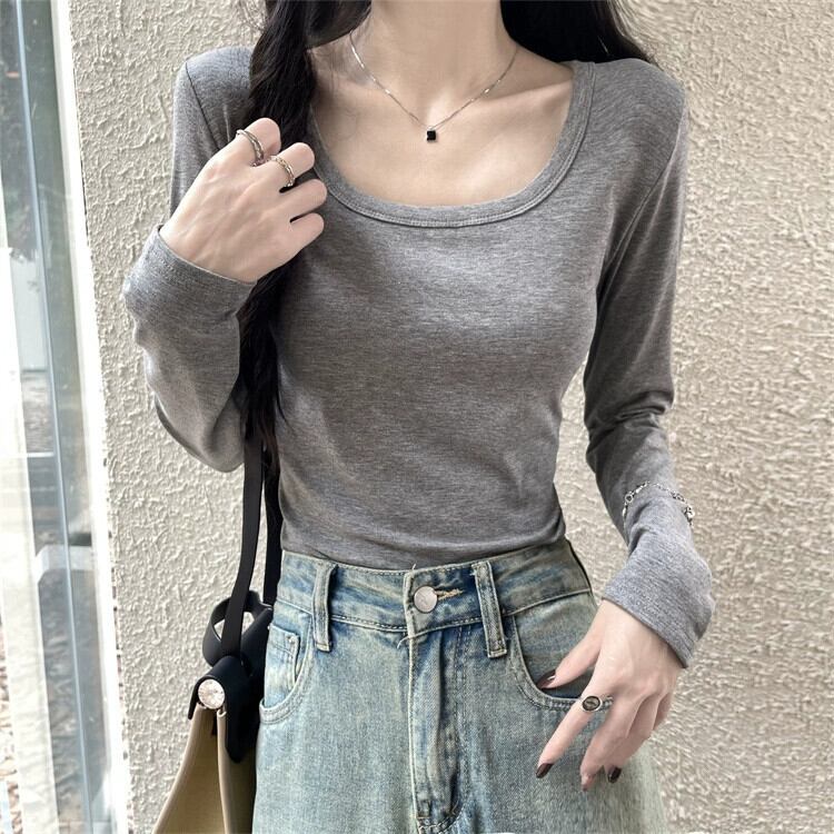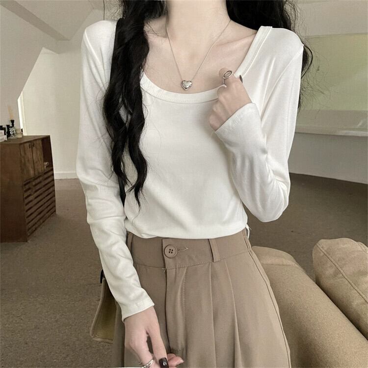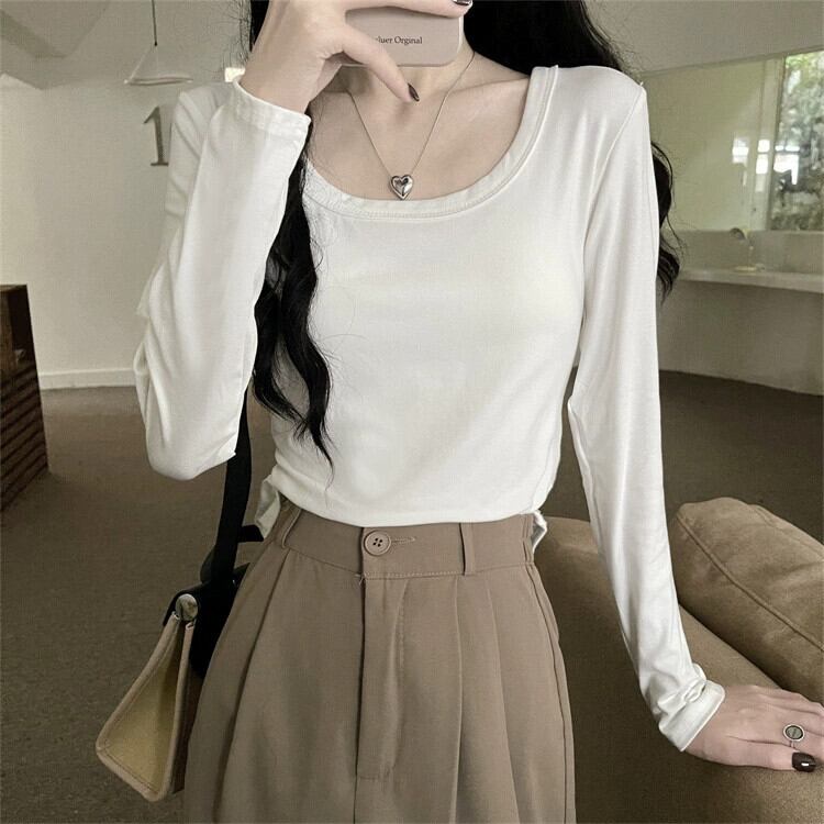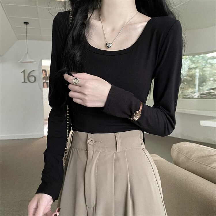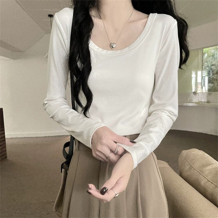 スリムセクシーなローネックボトシャツ女性春と秋 2023 レトロ有能なスタイルスリムインナー長袖 Tシャツ ロング スプリング 春物 オータム 秋物 7460028482982964 | framboise21