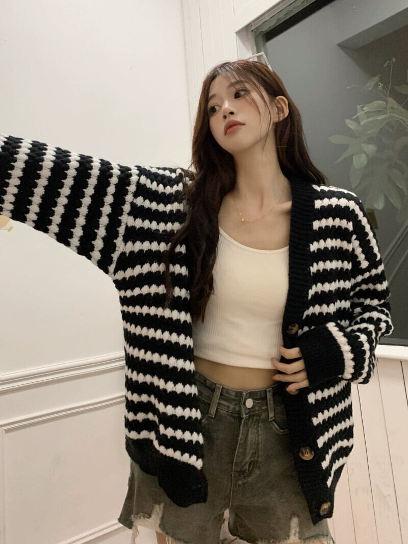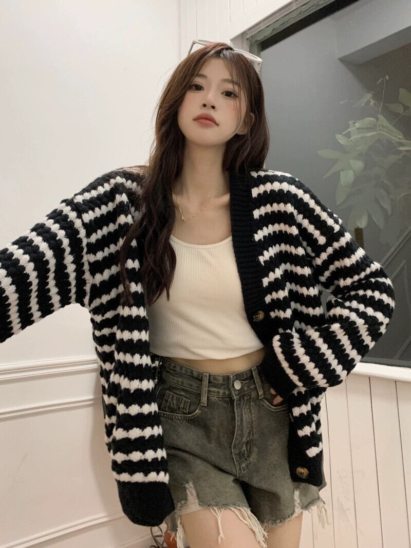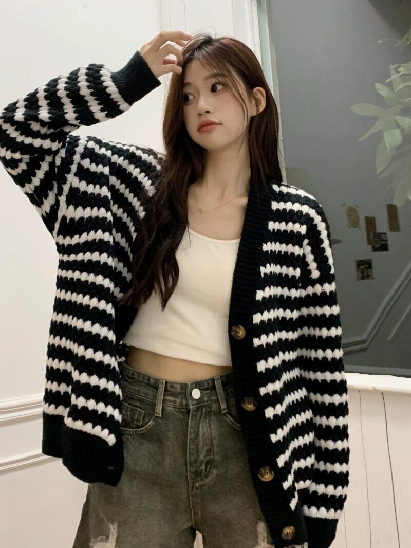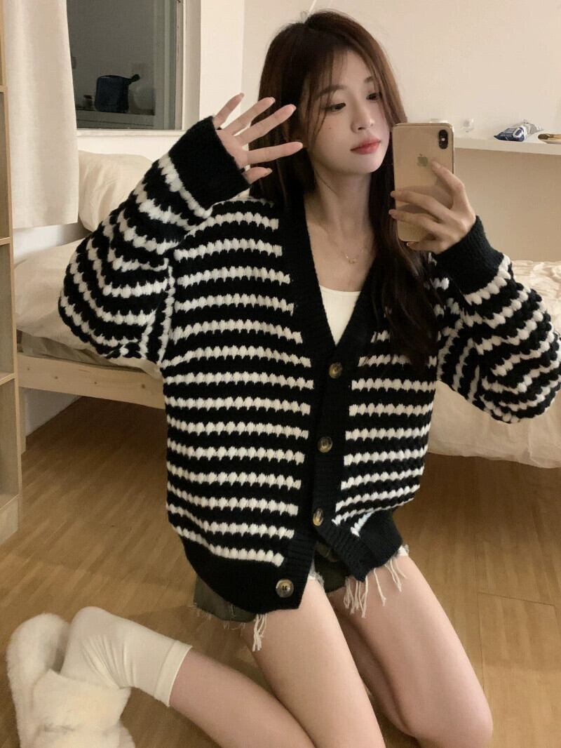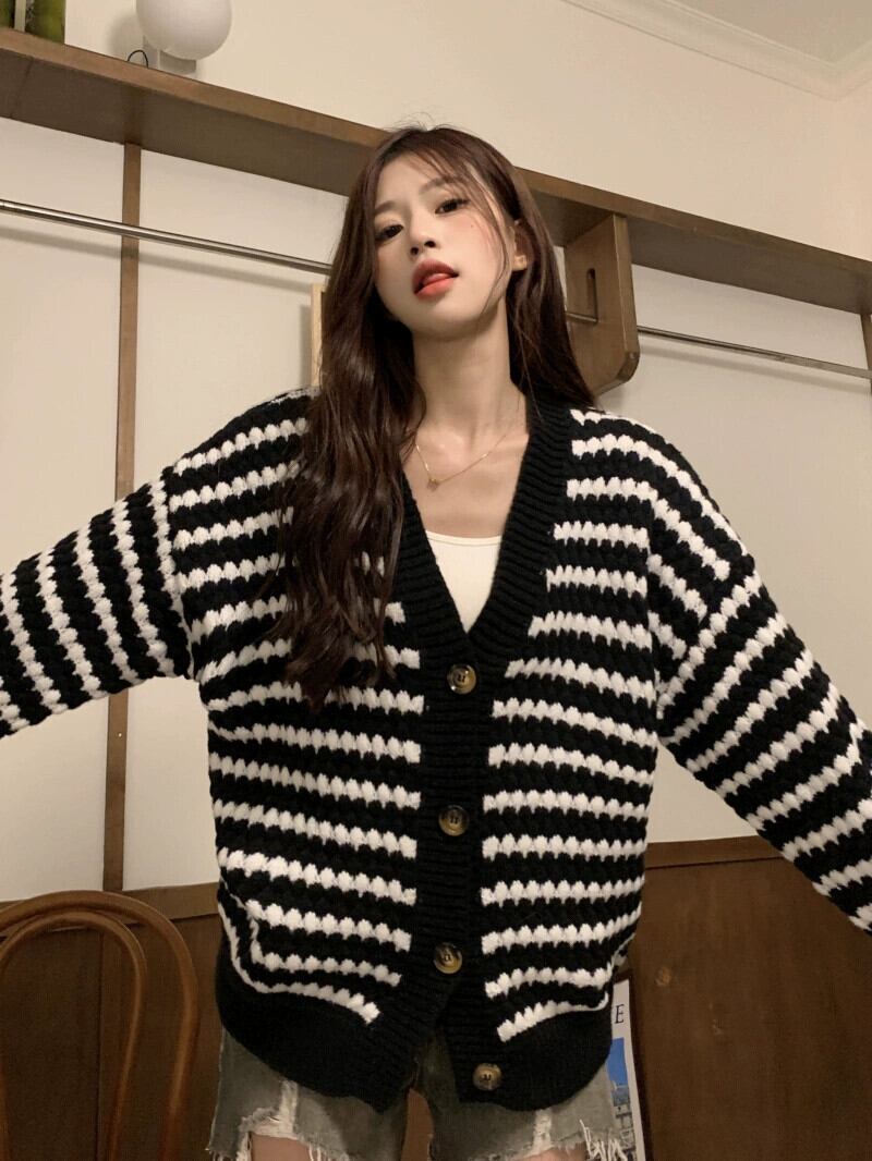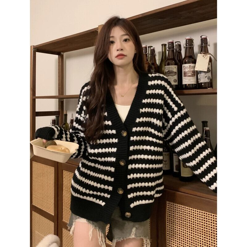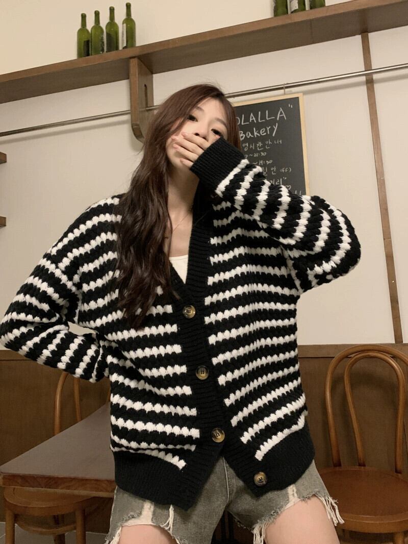 ミッドレングスのブラックストライプカーディガンセータージャケットレディース、秋と冬のレトロなルーズアウターウェア、怠惰なスタイルのVネックセーター オータム 秋物 ウィンター 冬物 7460098353807817 | framboise21