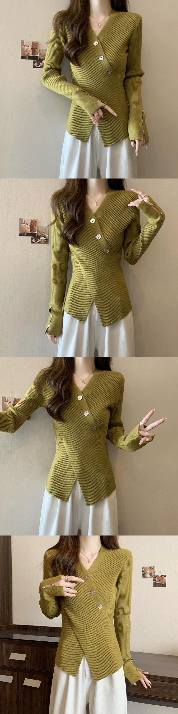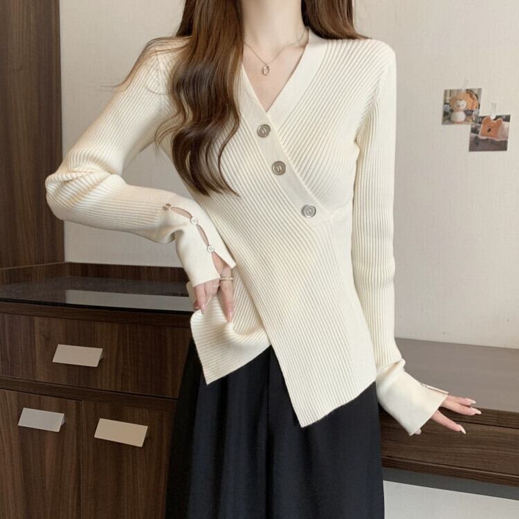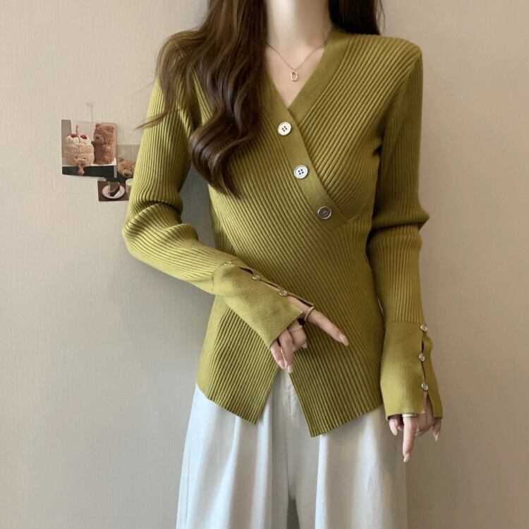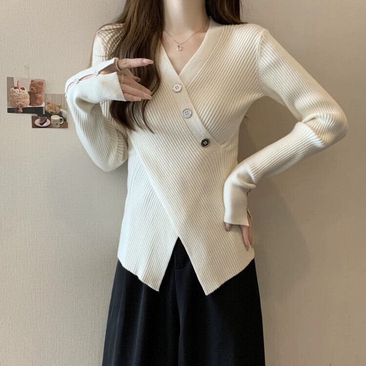 秋冬の不規則なクロスVネックボトリングシャツ女性、ファッショナブルでスリムフィット、ショート長袖ニットセーター ロング オータム 秋物 ウィンター 冬物 7460044555477933 | framboise21