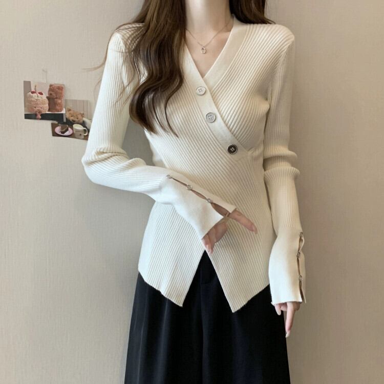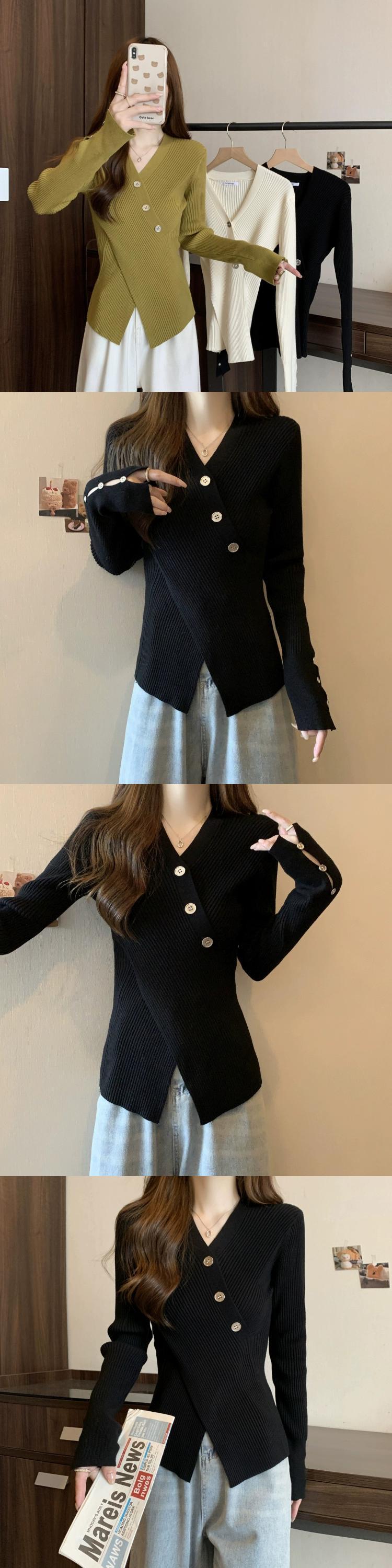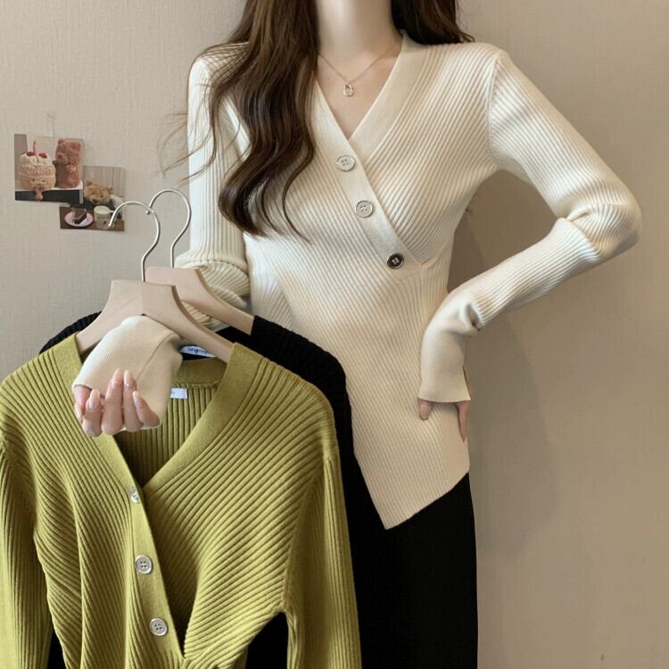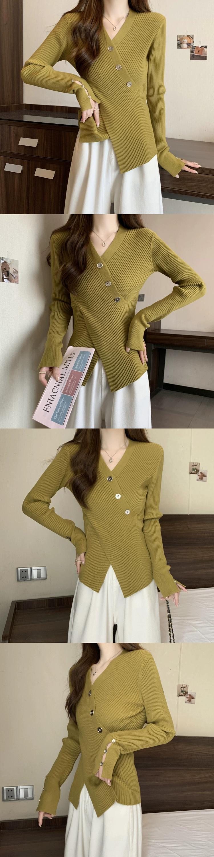 秋冬の不規則なクロスVネックボトリングシャツ女性、ファッショナブルでスリムフィット、ショート長袖ニットセーター ロング オータム 秋物 ウィンター 冬物 7460044555477933 | framboise21