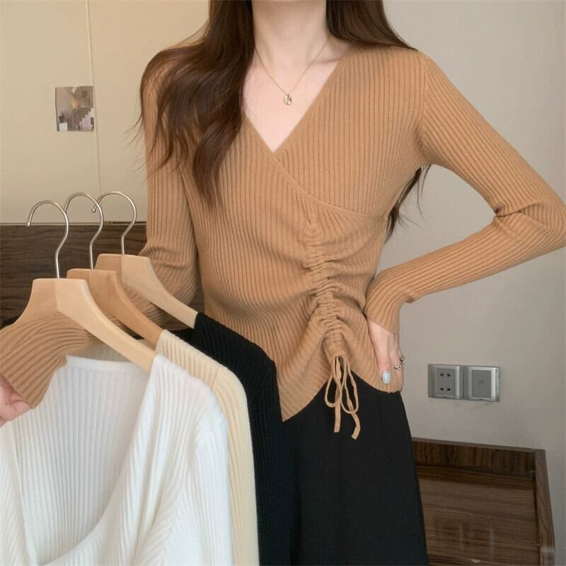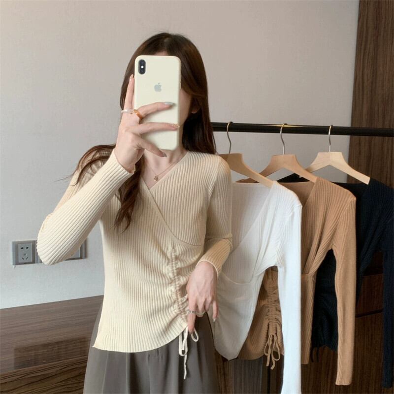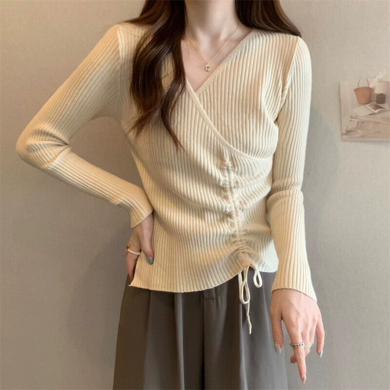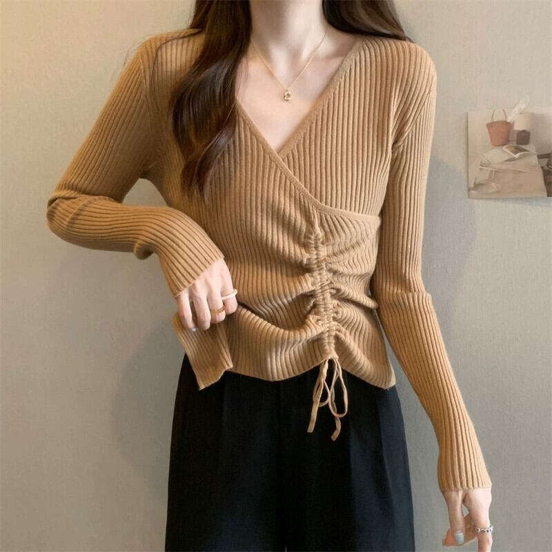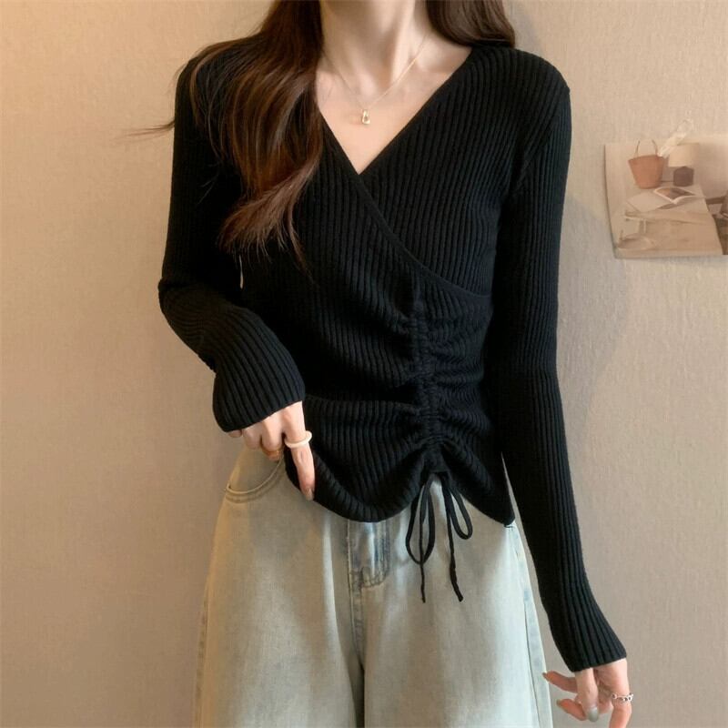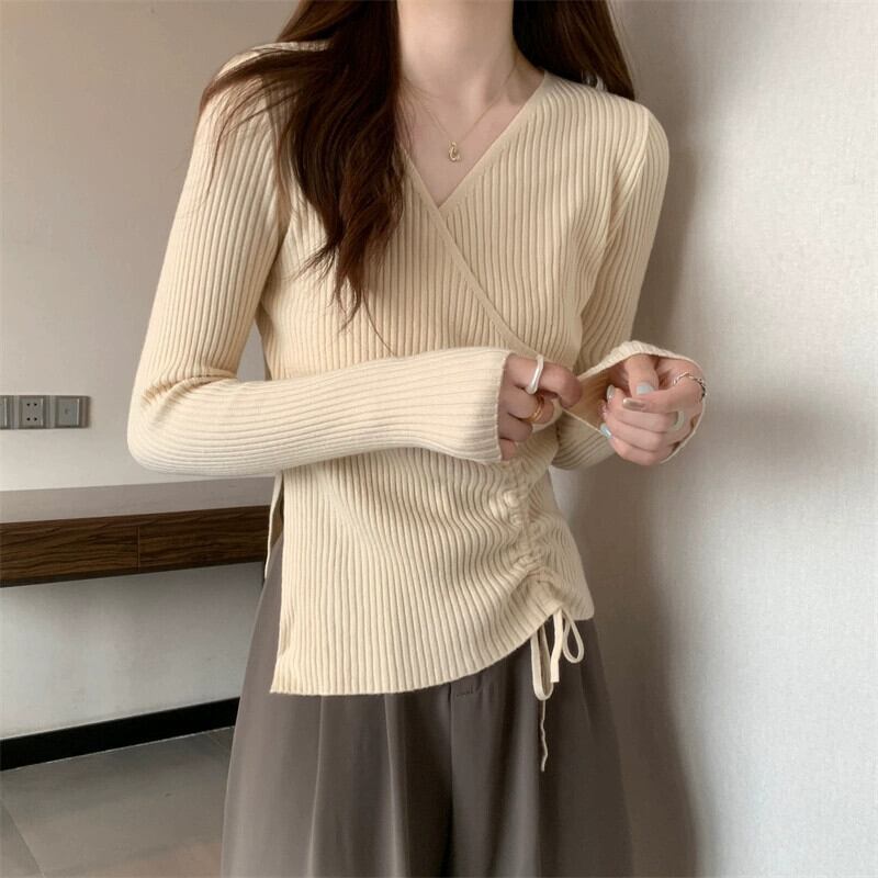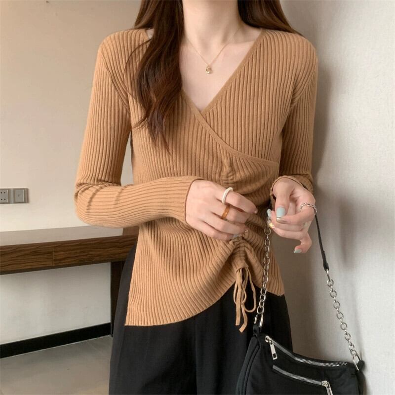 秋冬の不規則なクロス V ネック ボトリング シャツ女性、スリムでスタイリッシュ、短い長袖ニット セーター付き ショート ロング オータム 秋物 ウィンター 冬物 Vネック 7460065760054005 | framboise21