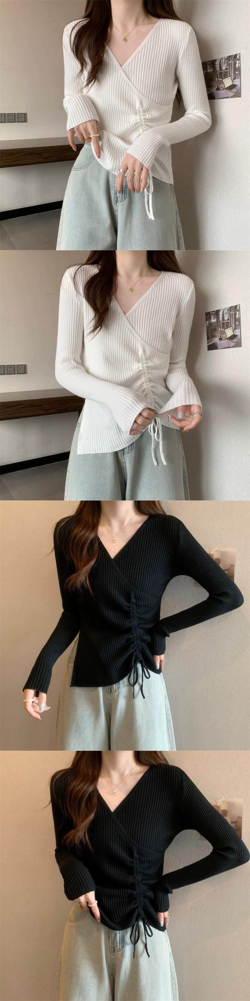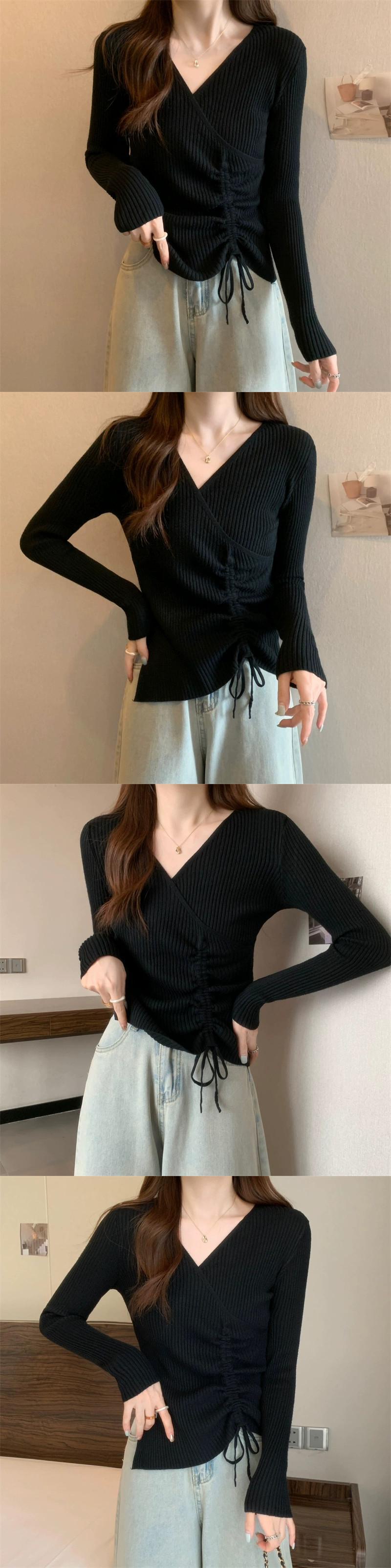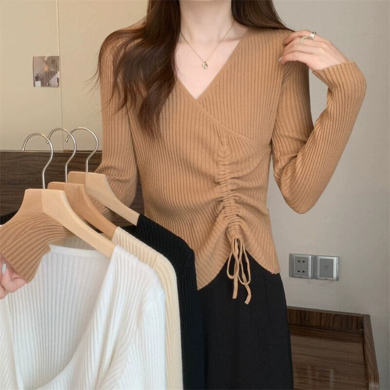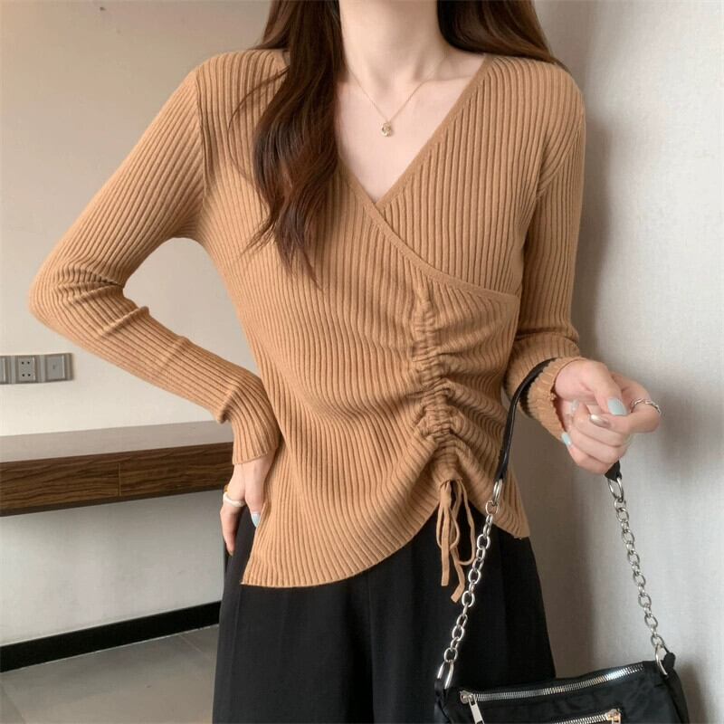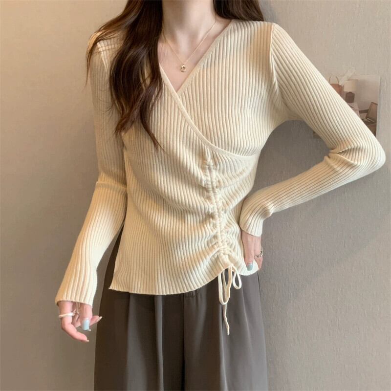 秋冬の不規則なクロス V ネック ボトリング シャツ女性、スリムでスタイリッシュ、短い長袖ニット セーター付き ショート ロング オータム 秋物 ウィンター 冬物 Vネック 7460065760054005 | framboise21