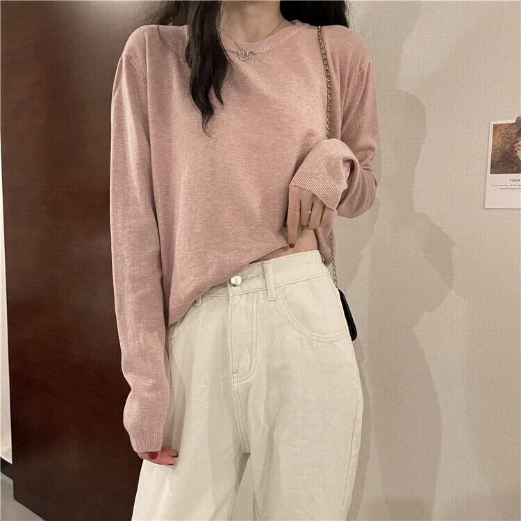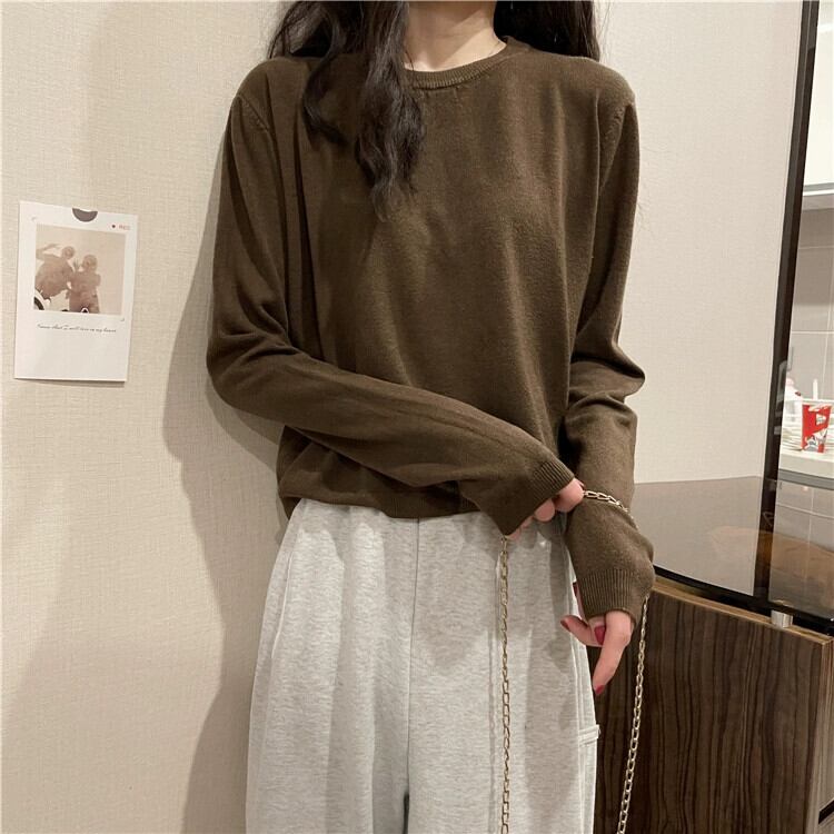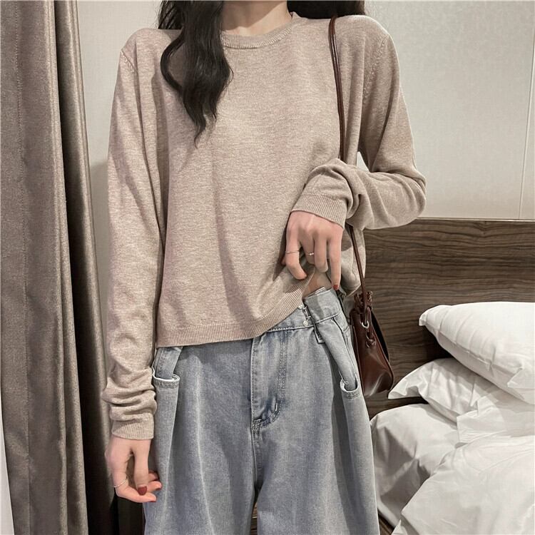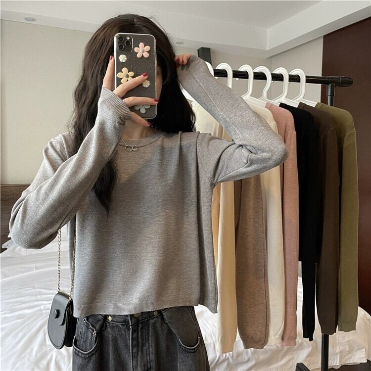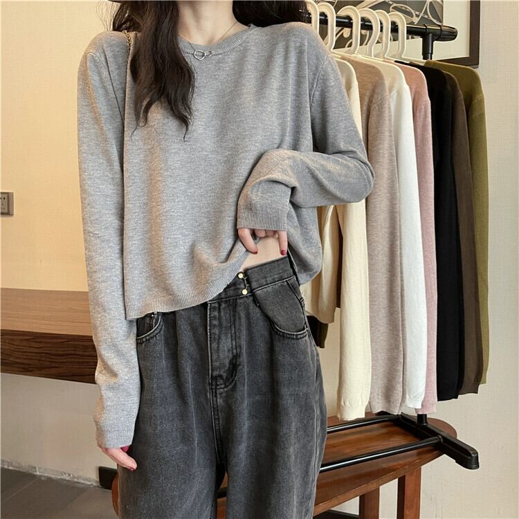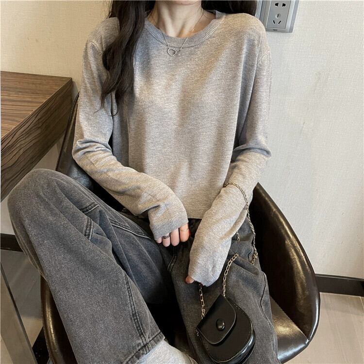 秋冬のグレーのショートニットボトムシャツの女性。ゆったり、スリム、ファッショナブルで万能なラウンドネック長袖セーター。 ロング オータム 秋物 ウィンター 冬物 Oネック 7460018886367111 | framboise21