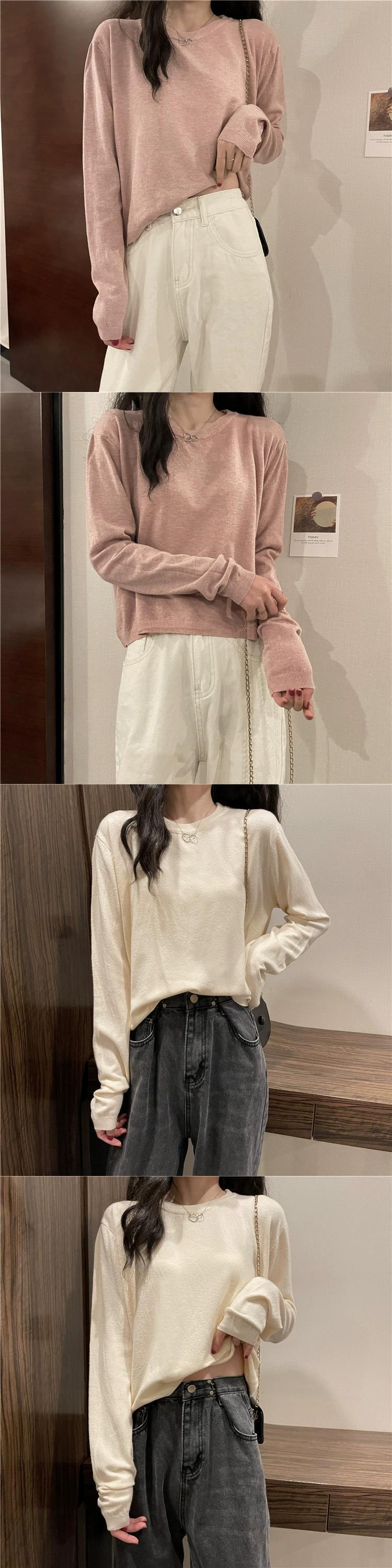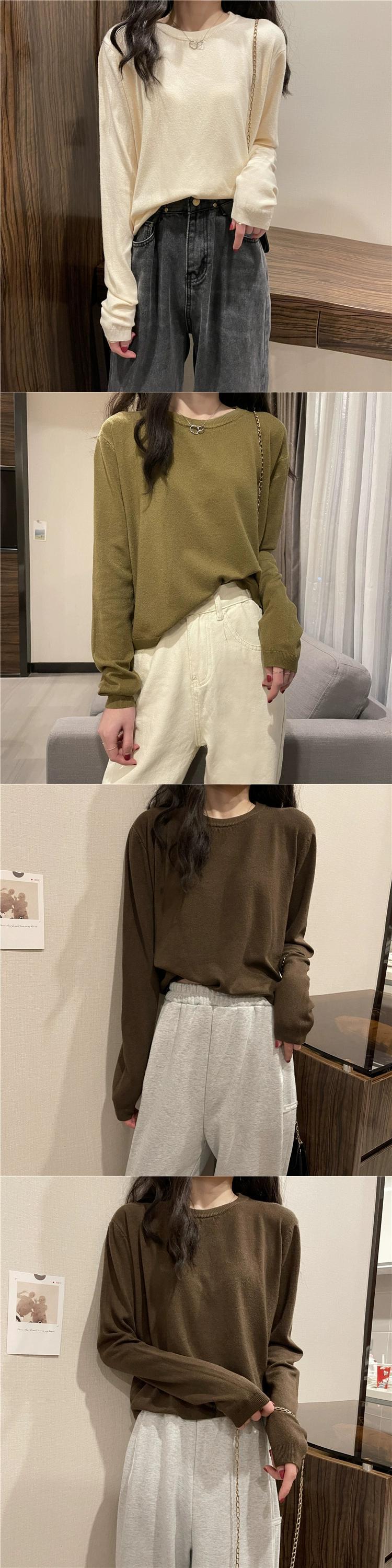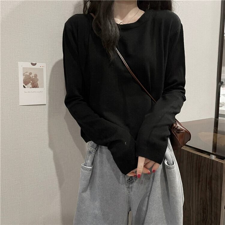 秋冬のグレーのショートニットボトムシャツの女性。ゆったり、スリム、ファッショナブルで万能なラウンドネック長袖セーター。 ロング オータム 秋物 ウィンター 冬物 Oネック 7460018886367111 | framboise21