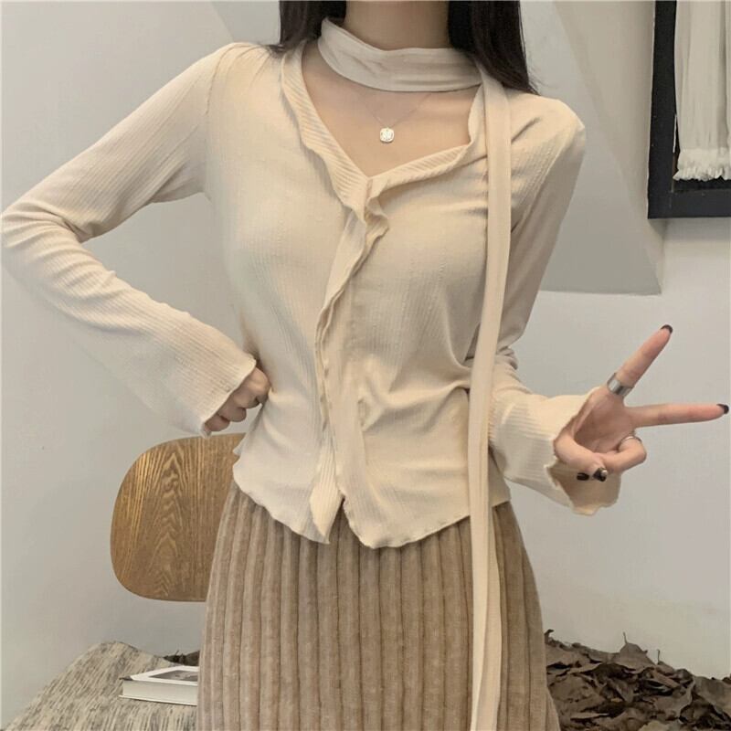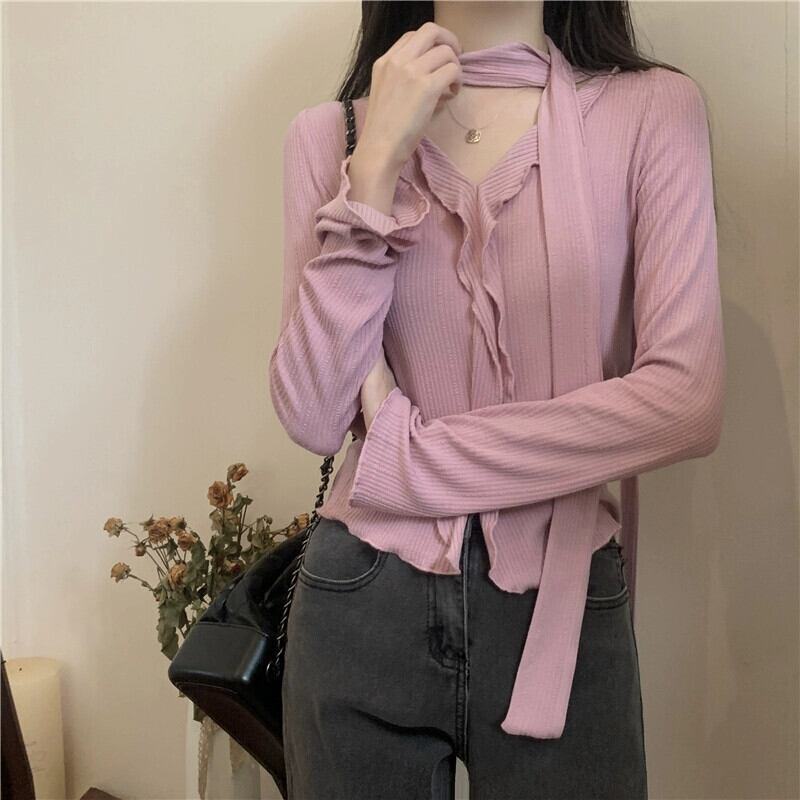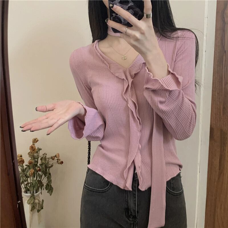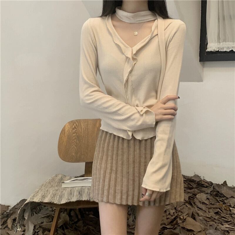 秋と冬の不規則な短い耳裾のボトムシャツ女性、スリムフィットでVネックの長袖ニットセーターを備えたスタイリッシュなインナースタイル ショート ロング オータム 秋物 ウィンター 冬物 7460073622829726 | framboise21