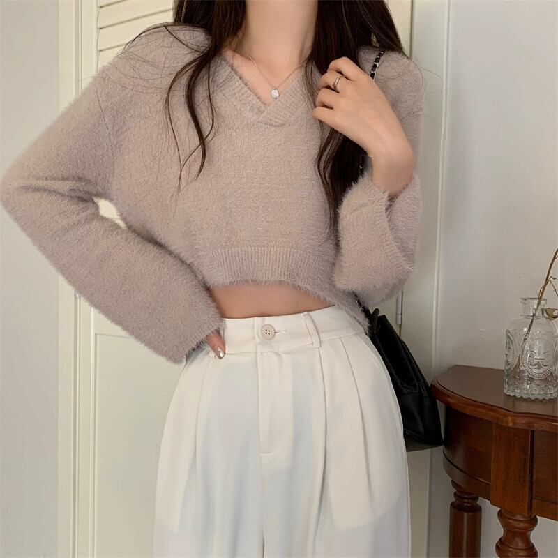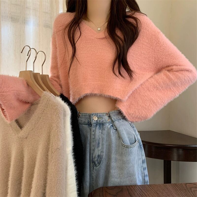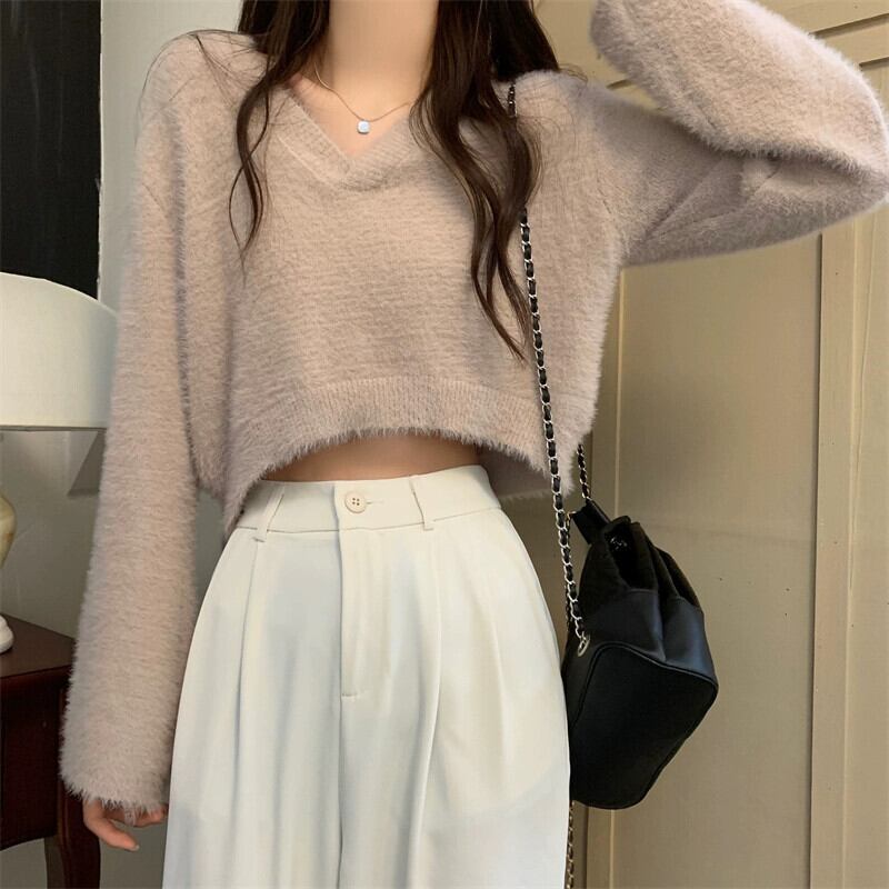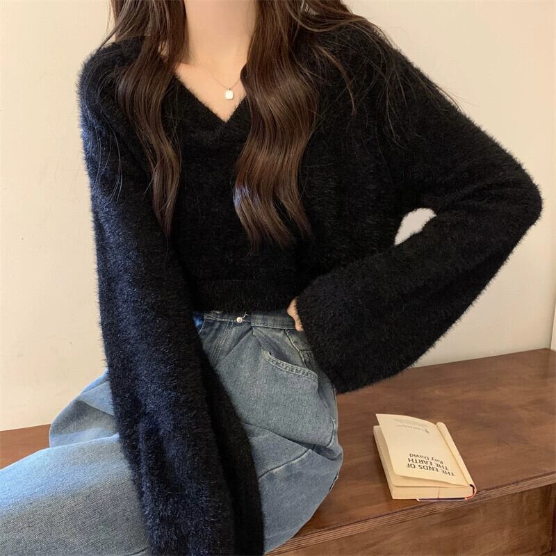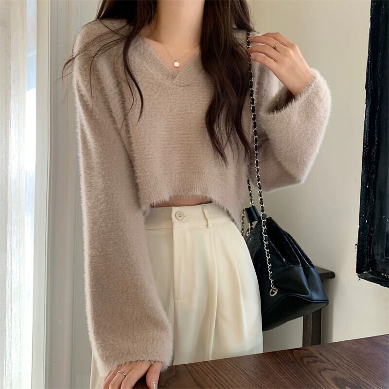 - 秋と冬のウエストショートイミテーションミンクベルベットセーター女性、ゆったりとしたアウターウェア、小柄な人、ファッショナブルなVネック長袖セーター ロング オータム 秋物 ウィンター 冬物 746007263076448 | framboise21