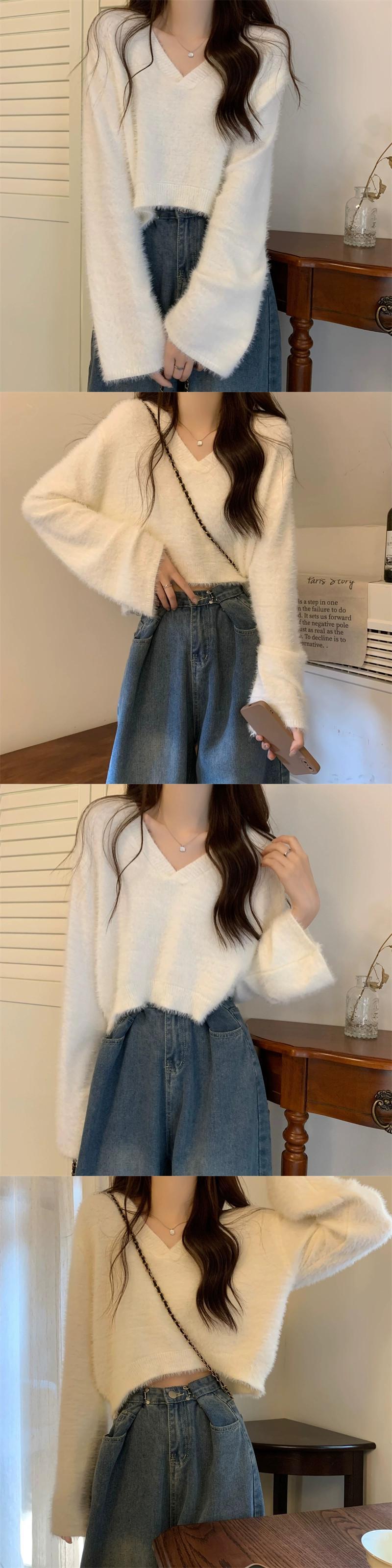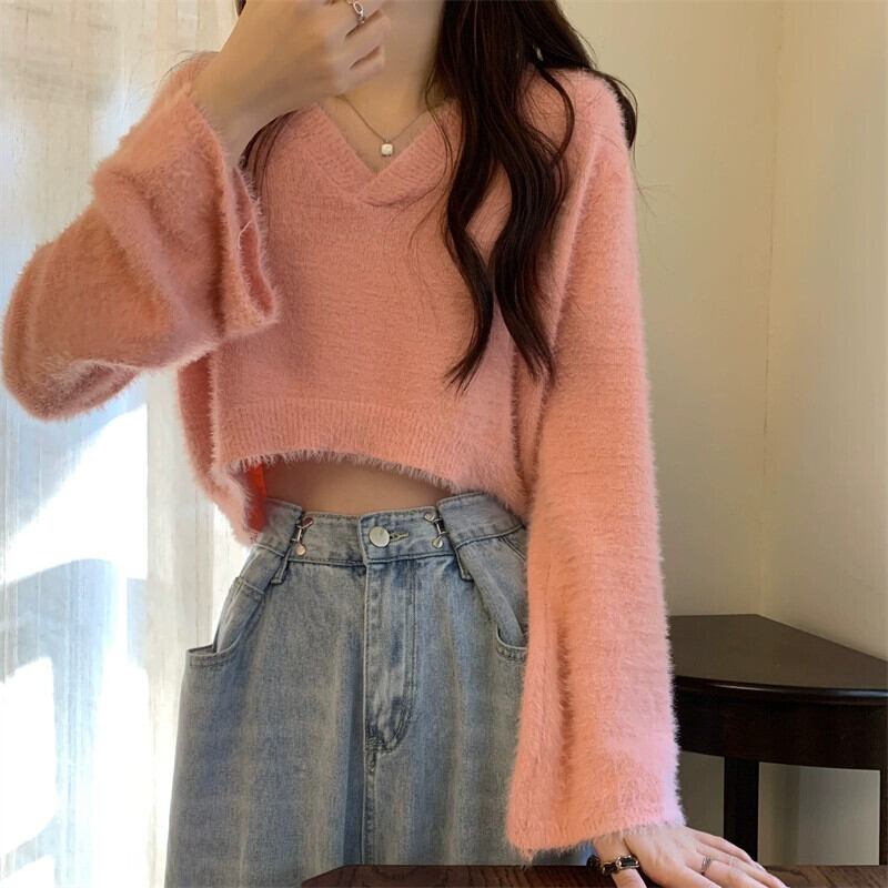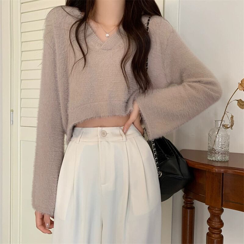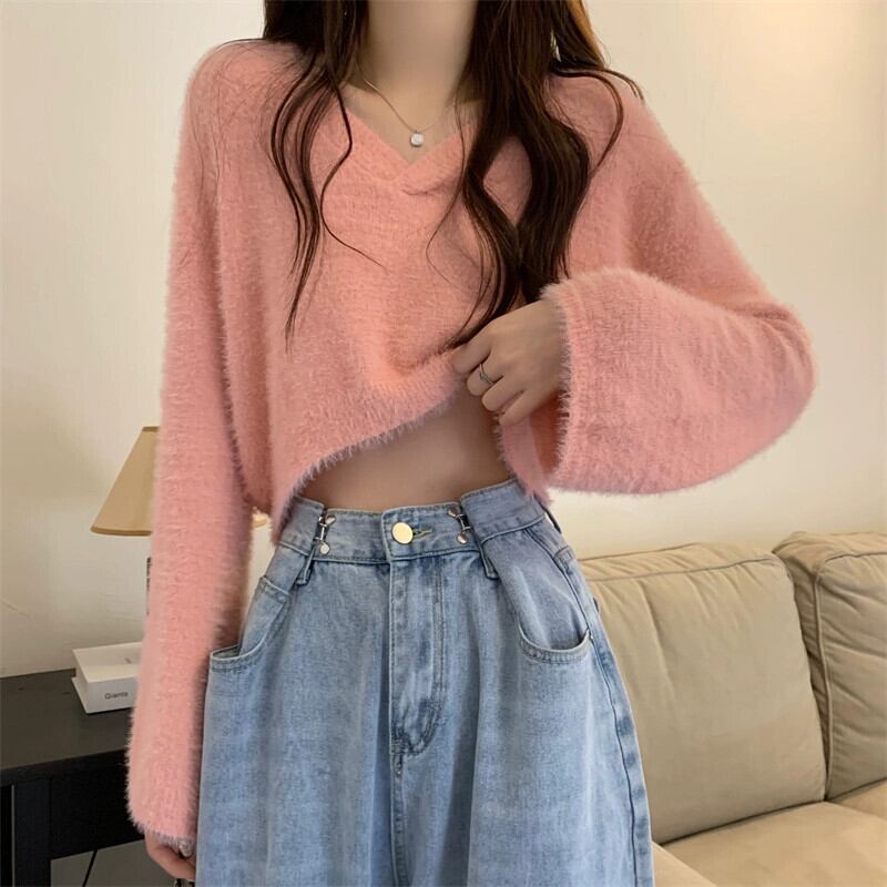 - 秋と冬のウエストショートイミテーションミンクベルベットセーター女性、ゆったりとしたアウターウェア、小柄な人、ファッショナブルなVネック長袖セーター ロング オータム 秋物 ウィンター 冬物 746007263076448 | framboise21
