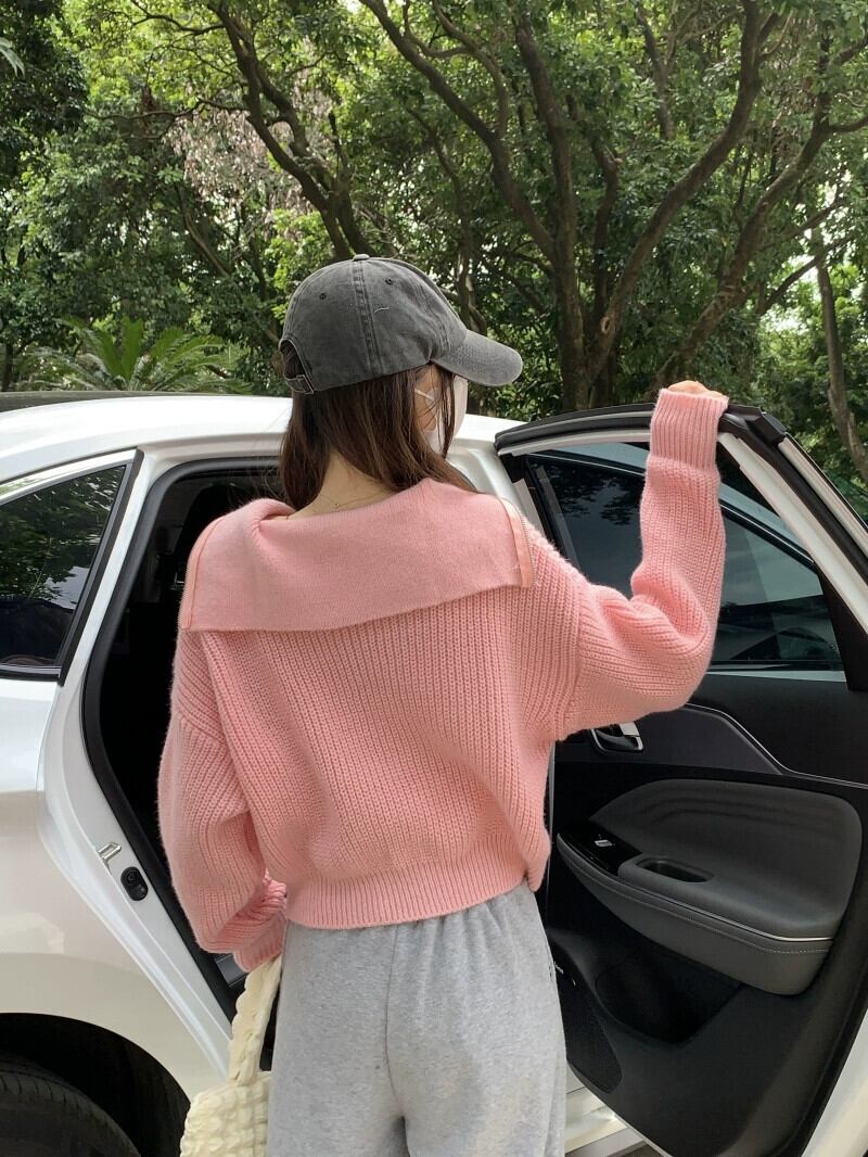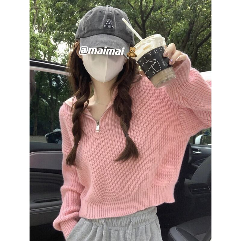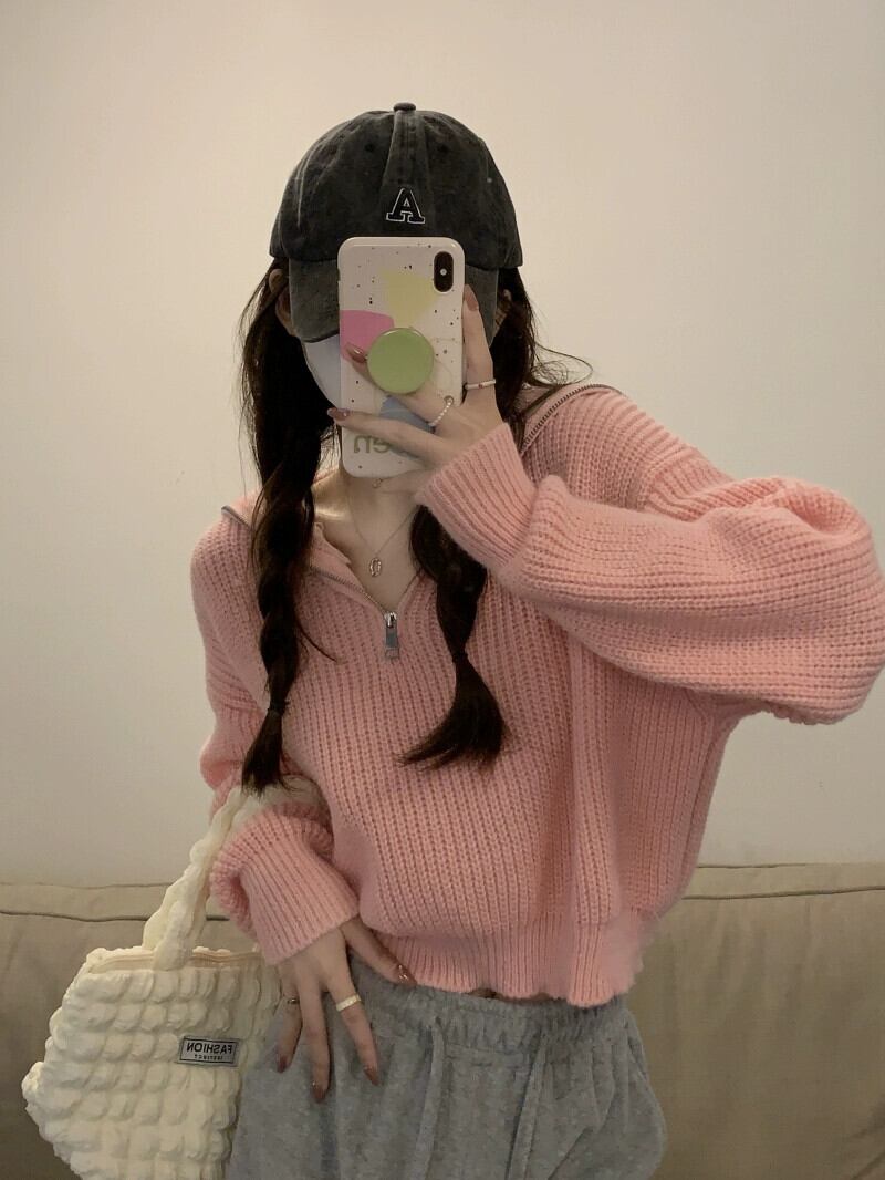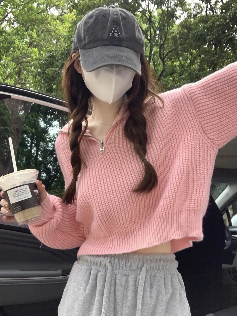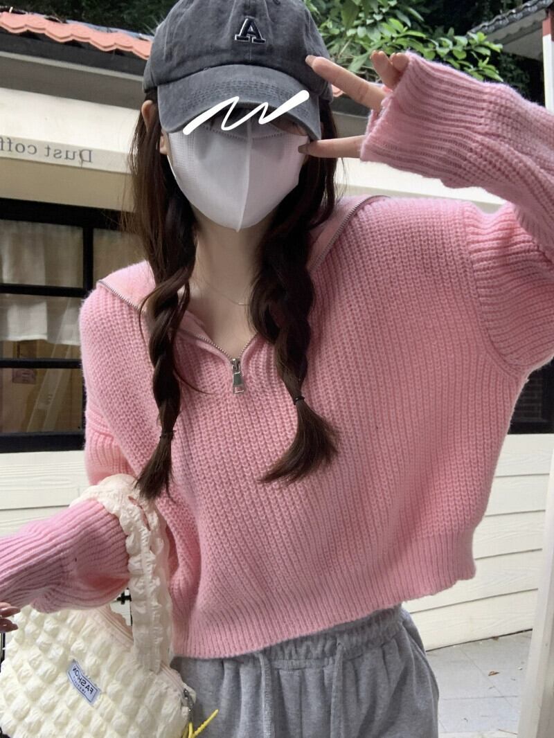 秋と冬のピンクのハーフジップの短い太いラインのセーターの女性、ゆったりとしたアウターウェア、Eign スタイルと多用途のネイビーカラーの長袖セーター ショート ロング オータム 秋物 ウィンター 冬物 7460051288321871 | framboise21