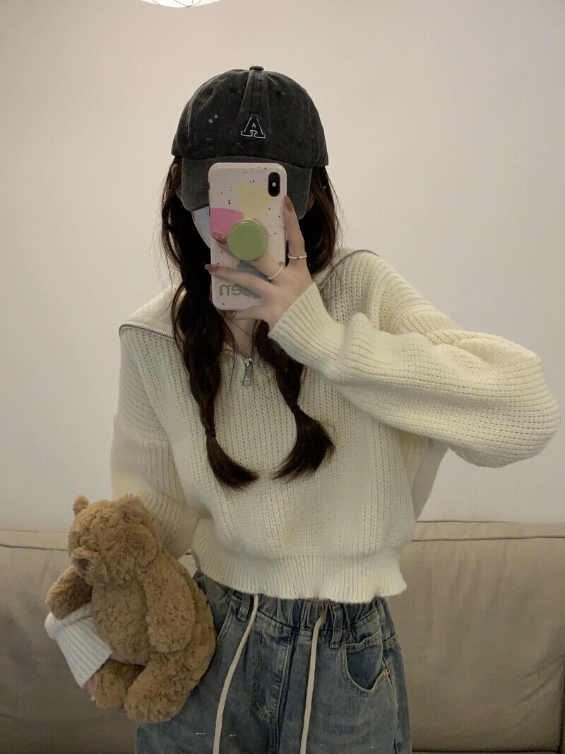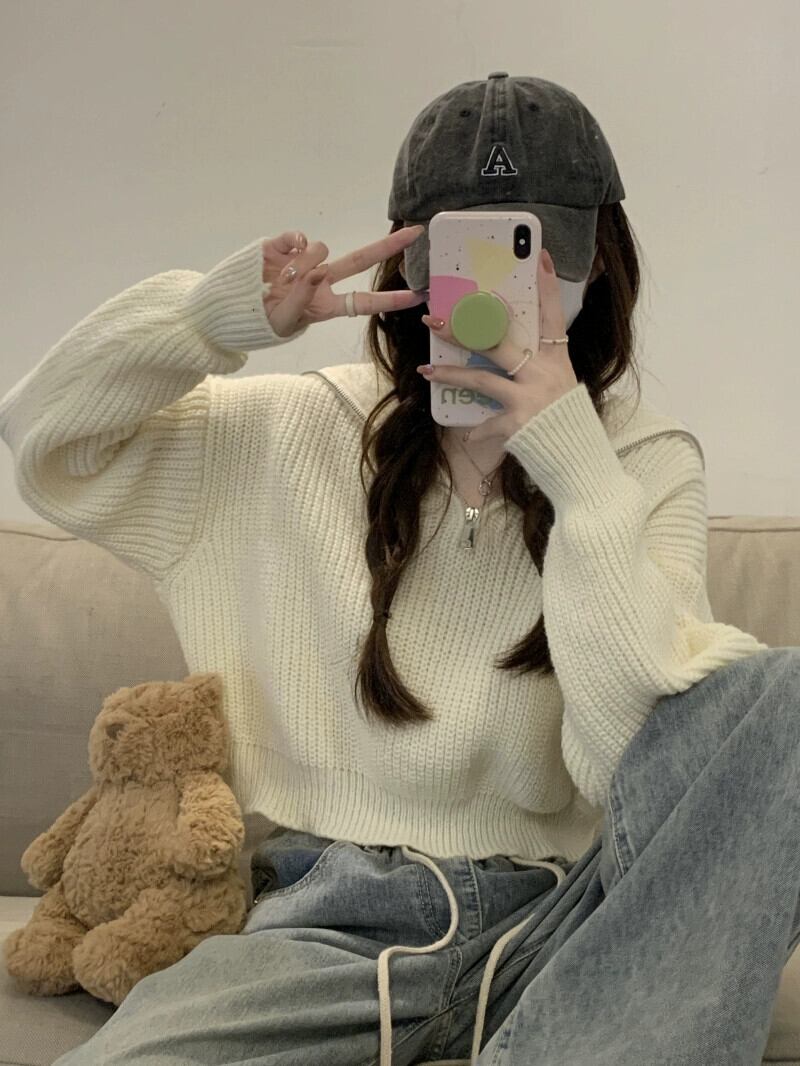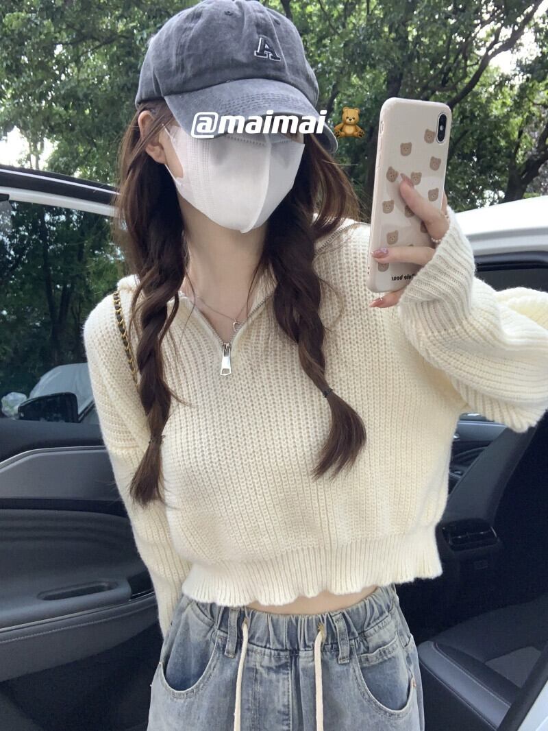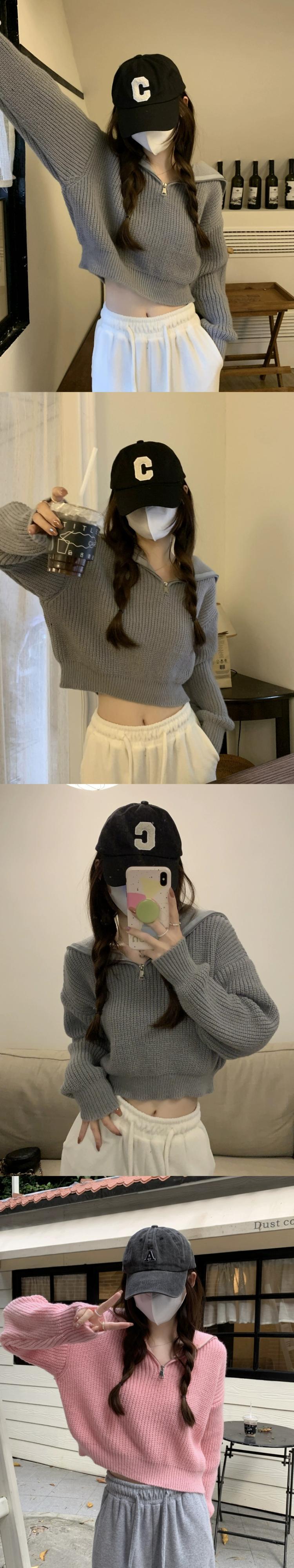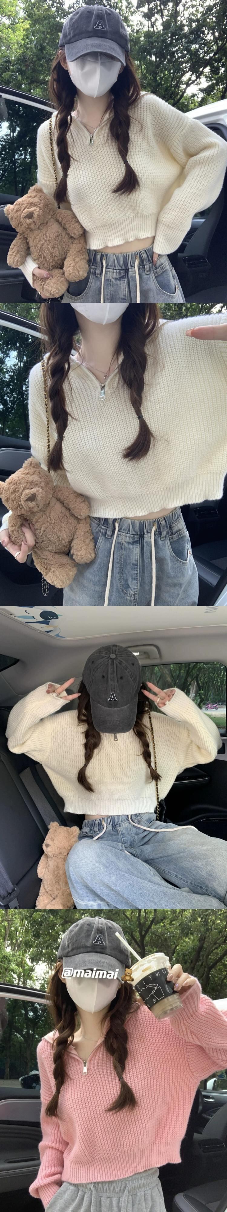 秋と冬のピンクのハーフジップの短い太いラインのセーターの女性、ゆったりとしたアウターウェア、Eign スタイルと多用途のネイビーカラーの長袖セーター ショート ロング オータム 秋物 ウィンター 冬物 7460051288321871 | framboise21