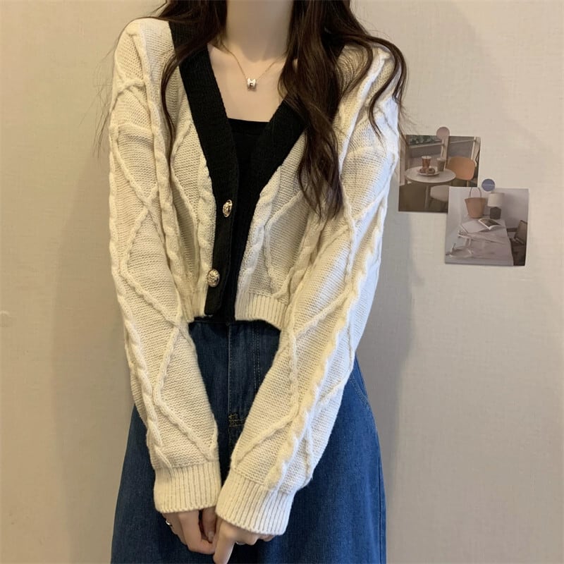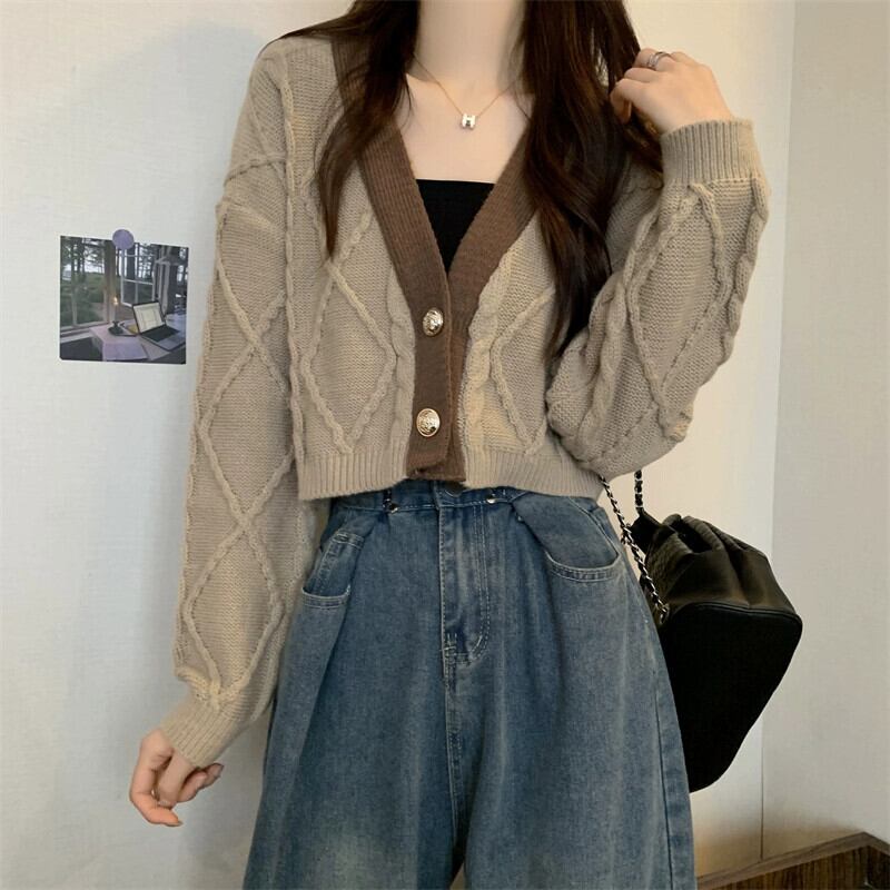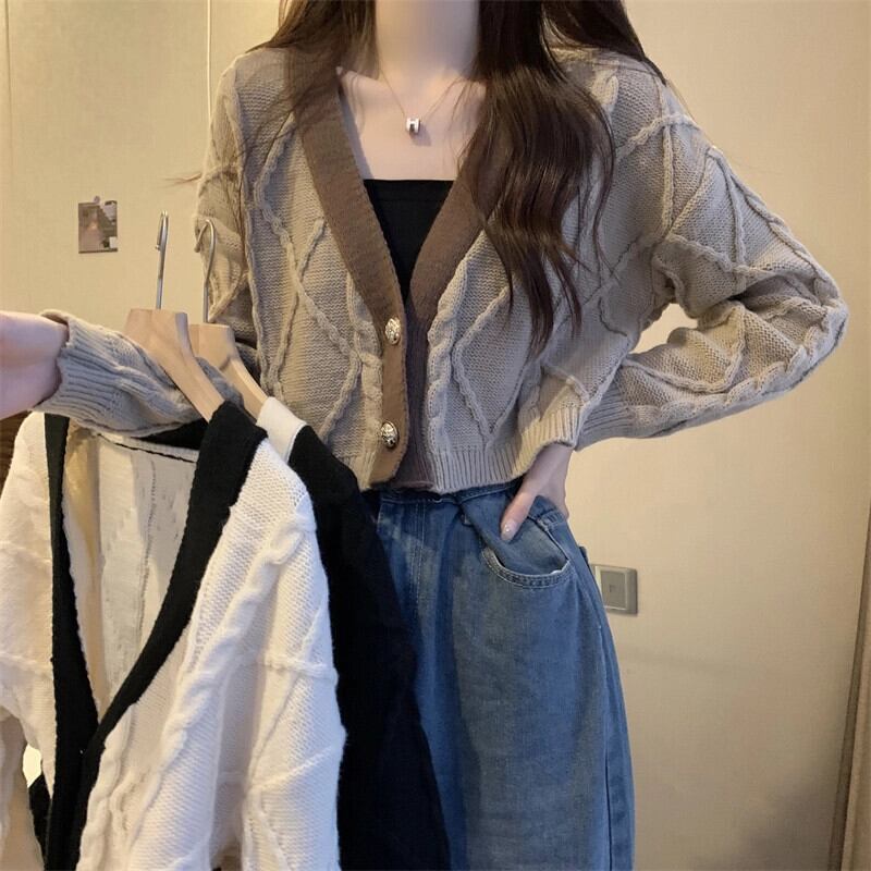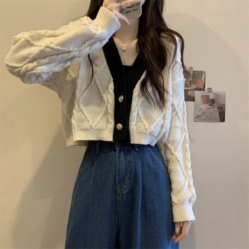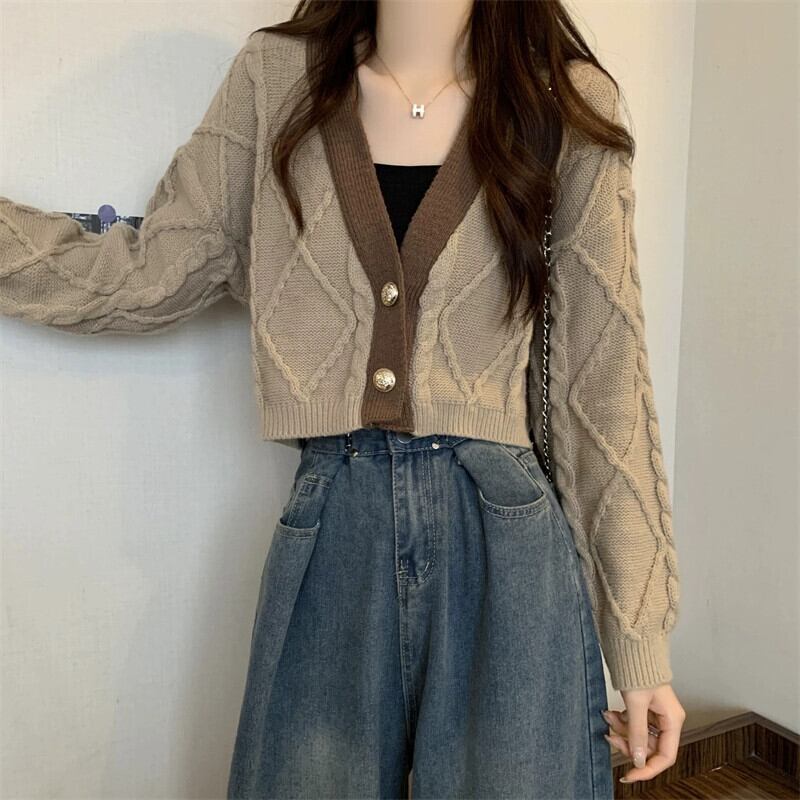 小さなハイウエストショートツイストセータージャケット女性の秋と冬のレトロなルーズアウターウェア怠惰なVネックニットカーディガン オータム 秋物 ウィンター 冬物 7460062416577291 | framboise21