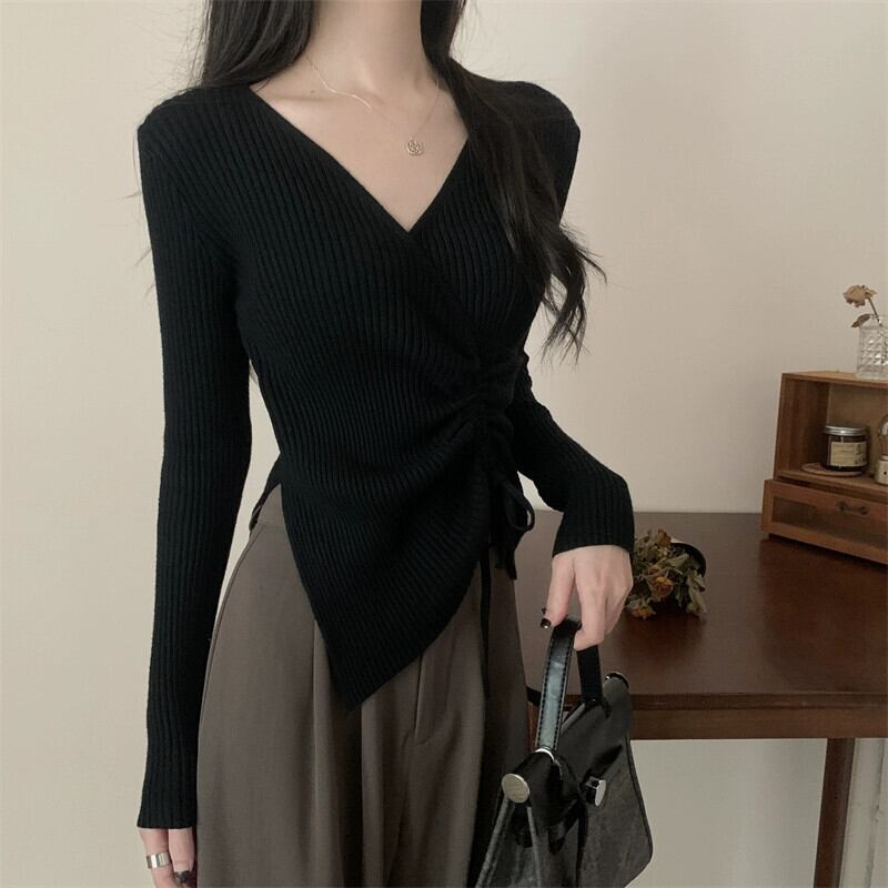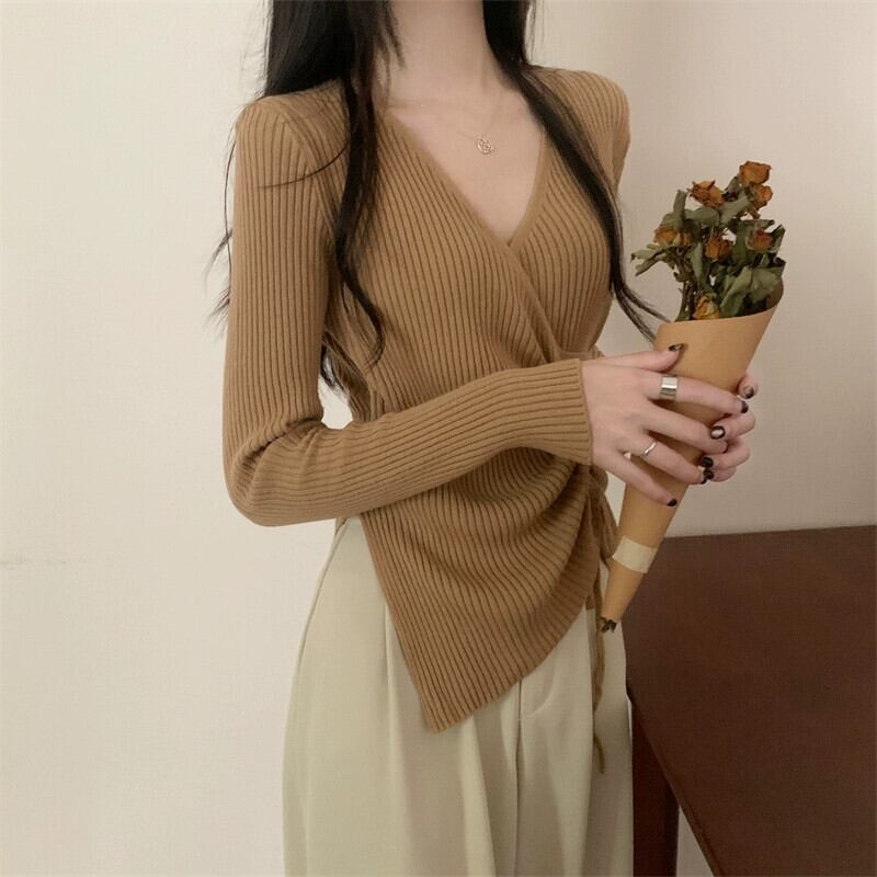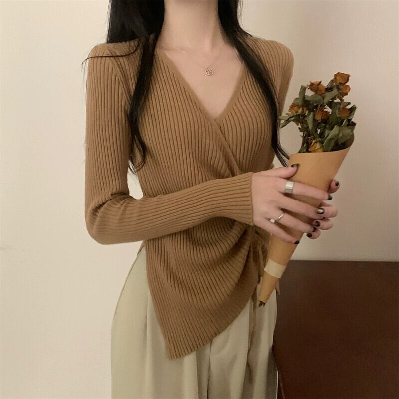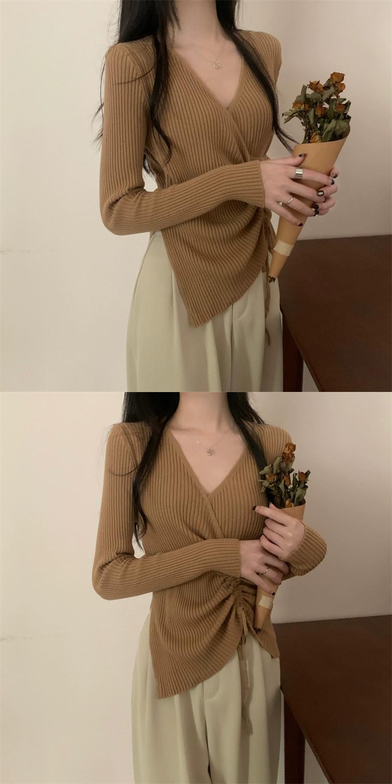 秋冬のクロス V ネック ニット ボトム シャツ レディース。ウエスタン スタイルとスリム フィットの内側に不規則なドローストリングの長袖トップが付いています。 ロング オータム 秋物 ウィンター 冬物 Vネック 7460043894422062 | framboise21