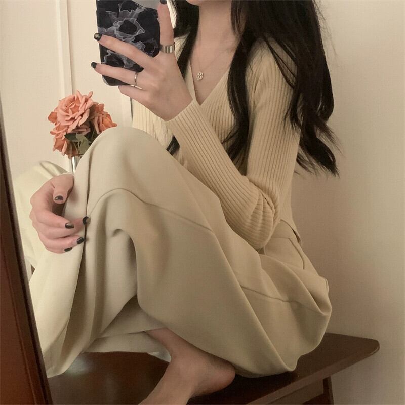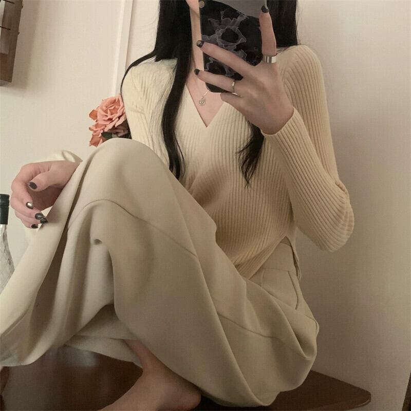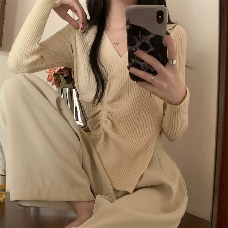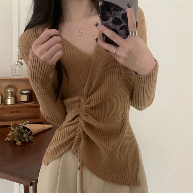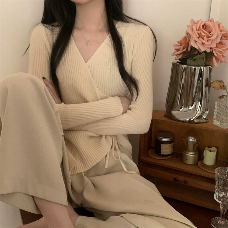 秋冬のクロス V ネック ニット ボトム シャツ レディース。ウエスタン スタイルとスリム フィットの内側に不規則なドローストリングの長袖トップが付いています。 ロング オータム 秋物 ウィンター 冬物 Vネック 7460043894422062 | framboise21