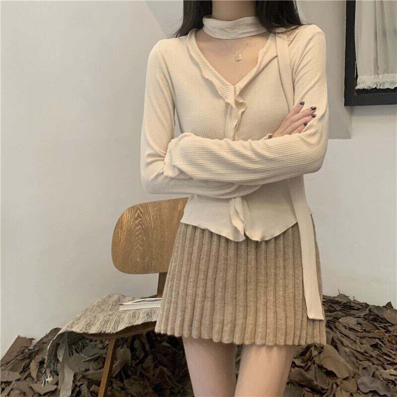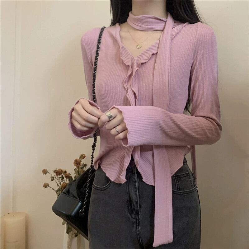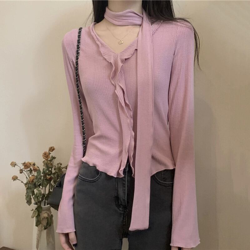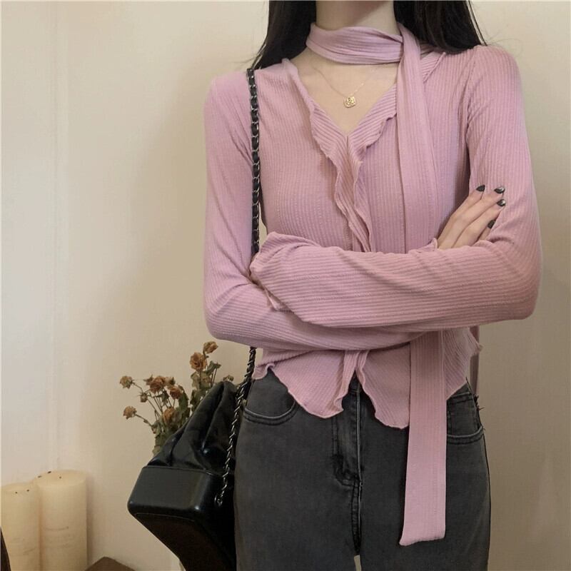 ホルターネックショート長袖トップス女性春と秋 2023 新しいファッションファッションスリム多用途真菌エッジ v ネック tシャツトレンディな ロング スプリング 春物 オータム 秋物 Vネック 7460055312709799 | framboise21