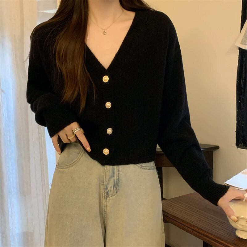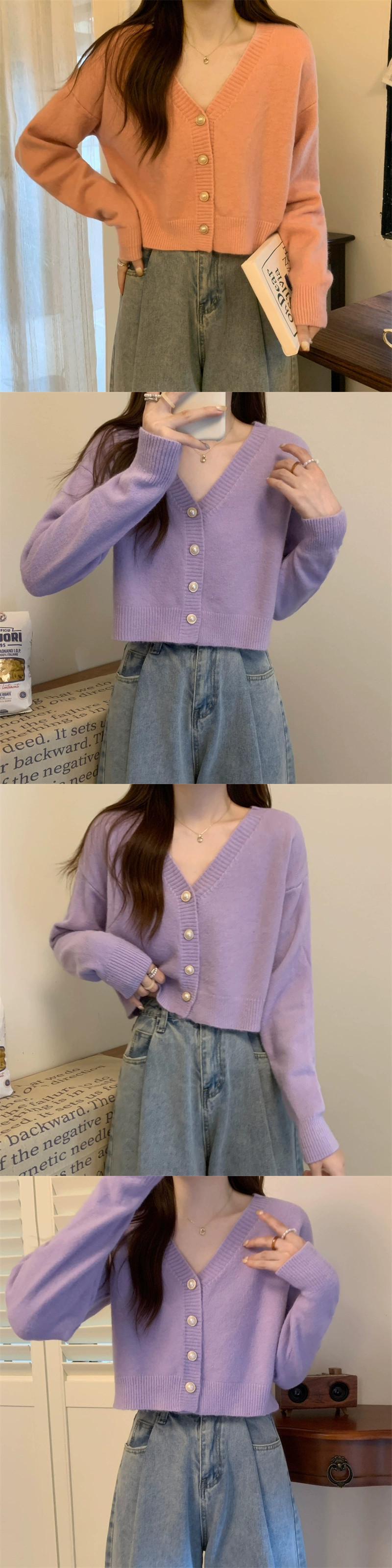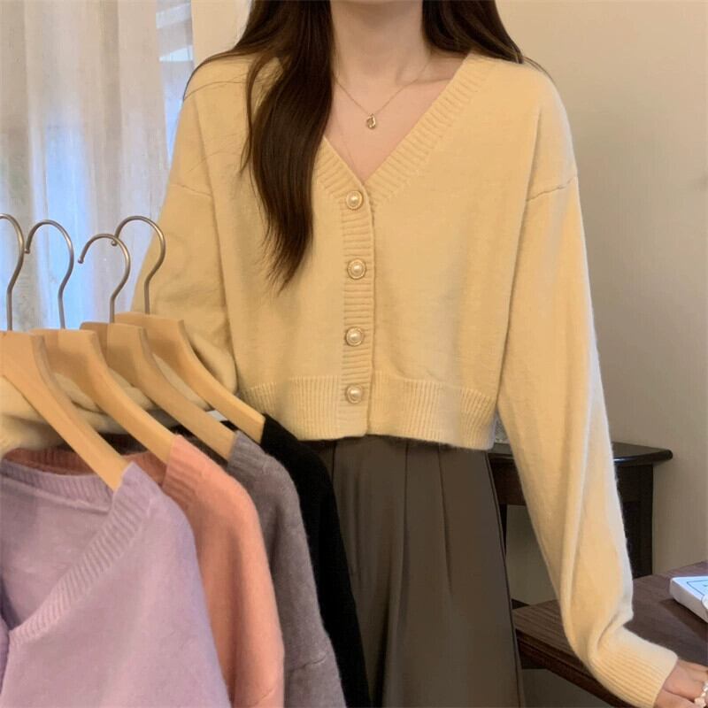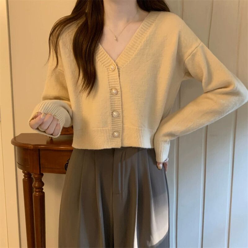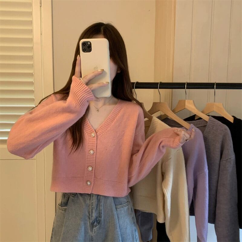 ピンクのショートカーディガンセータージャケット女性の秋と冬のフランスの優しいスタイルのルーズなアウターウェアvネック長袖ニットトップ ロング オータム 秋物 ウィンター 冬物 7460060636558970 | framboise21