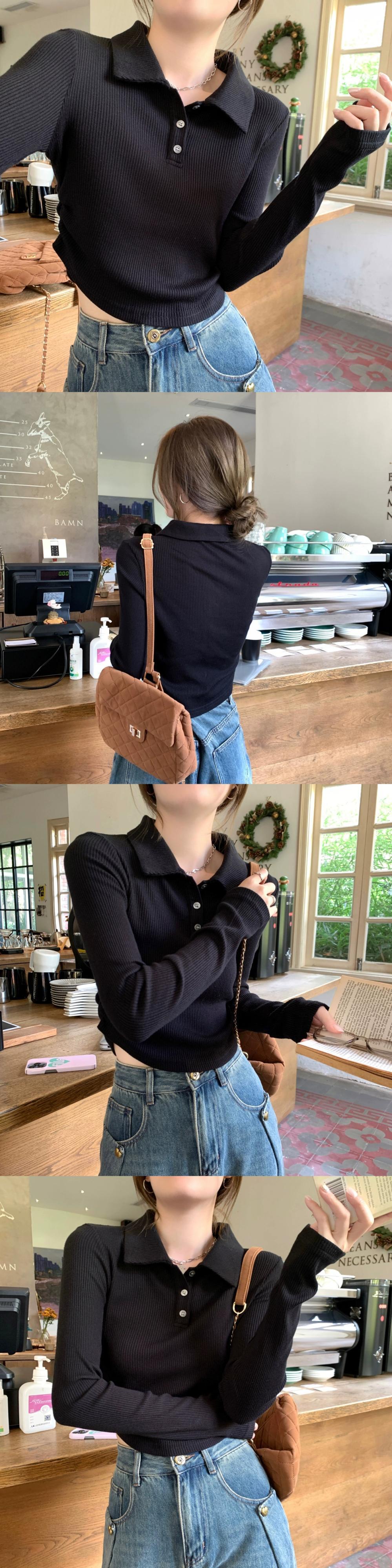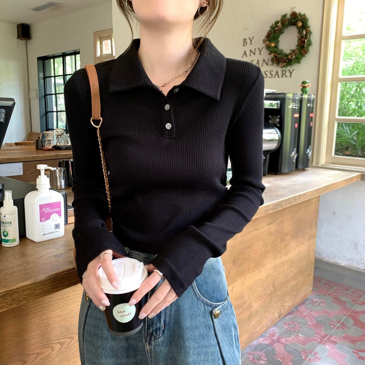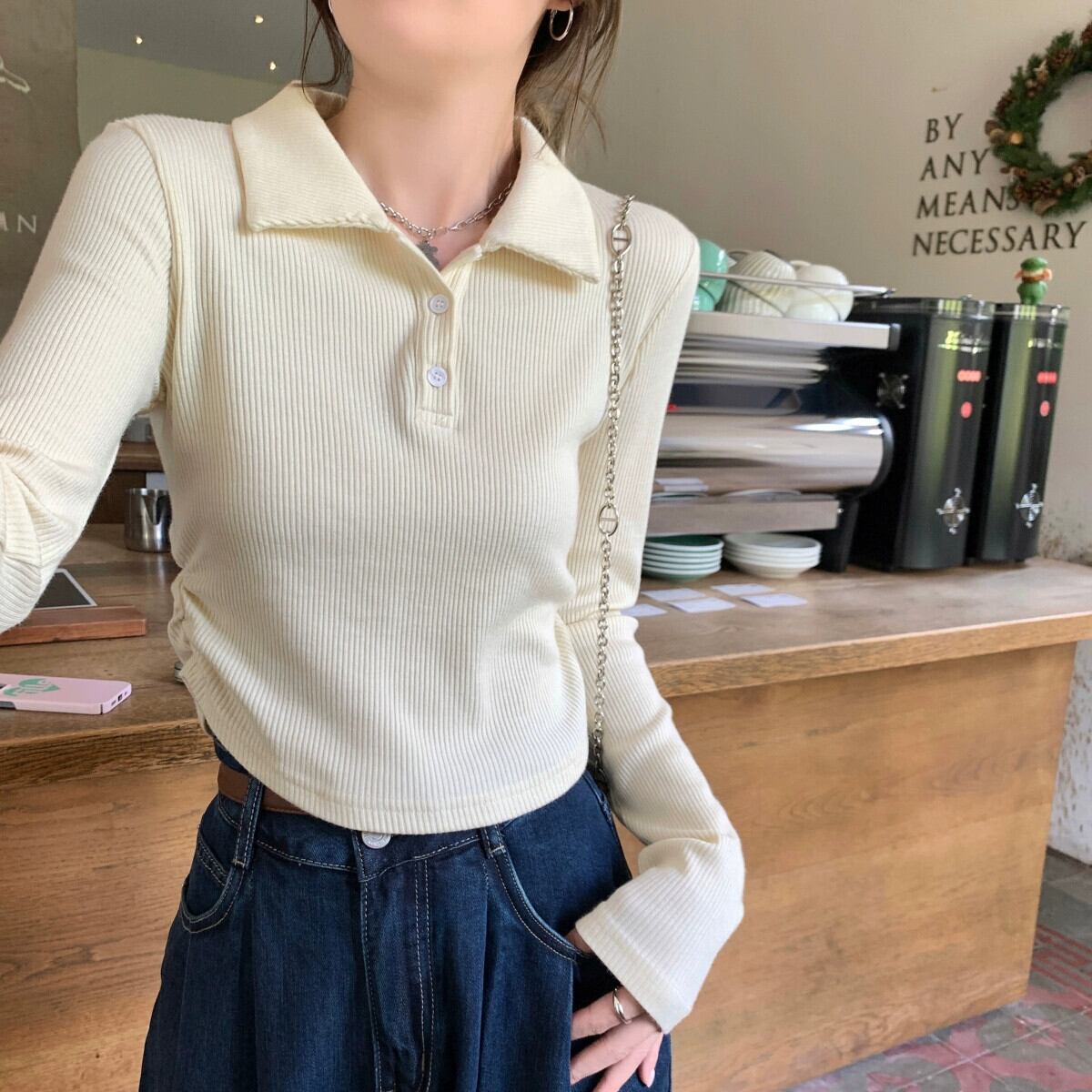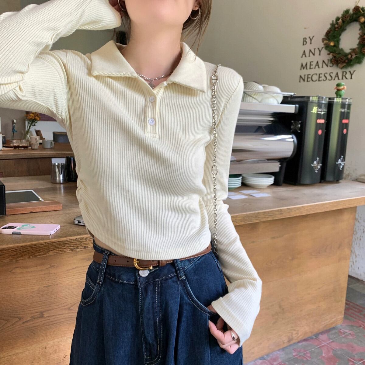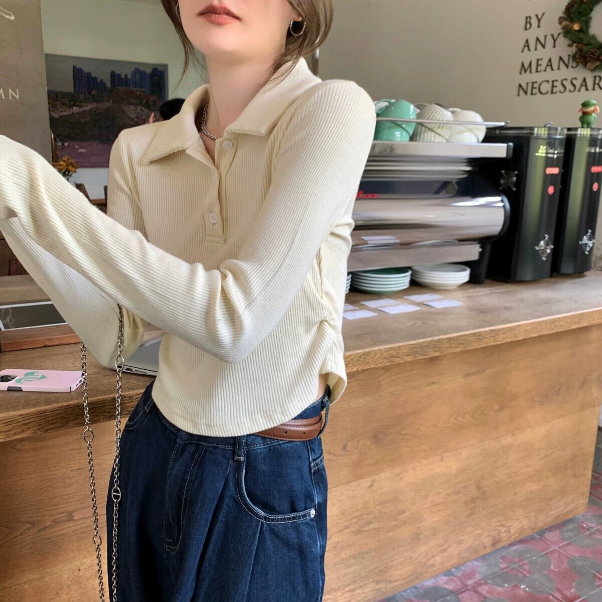 スタイリッシュでスリムフィットのインナーポロカラーボトムスTシャツを備えた、秋と冬の不規則なプリーツの短い長袖トップの女性。 ショート ロング オータム 秋物 ウィンター 冬物 7460011052725074 | framboise21