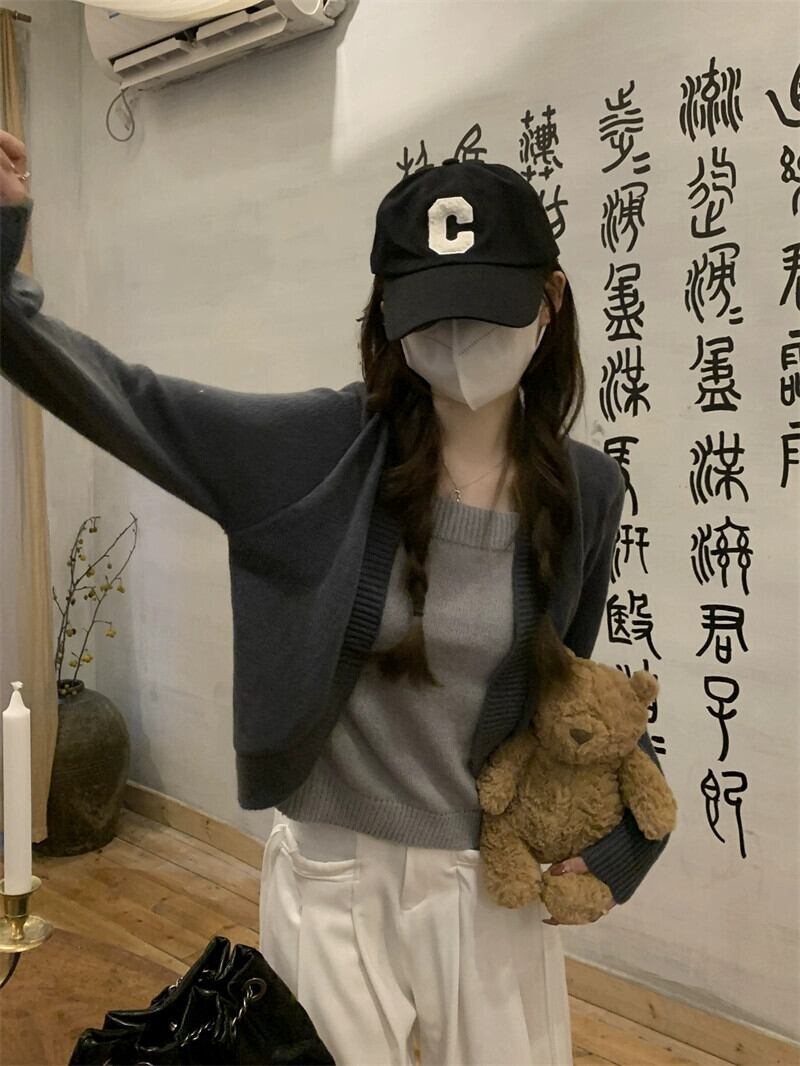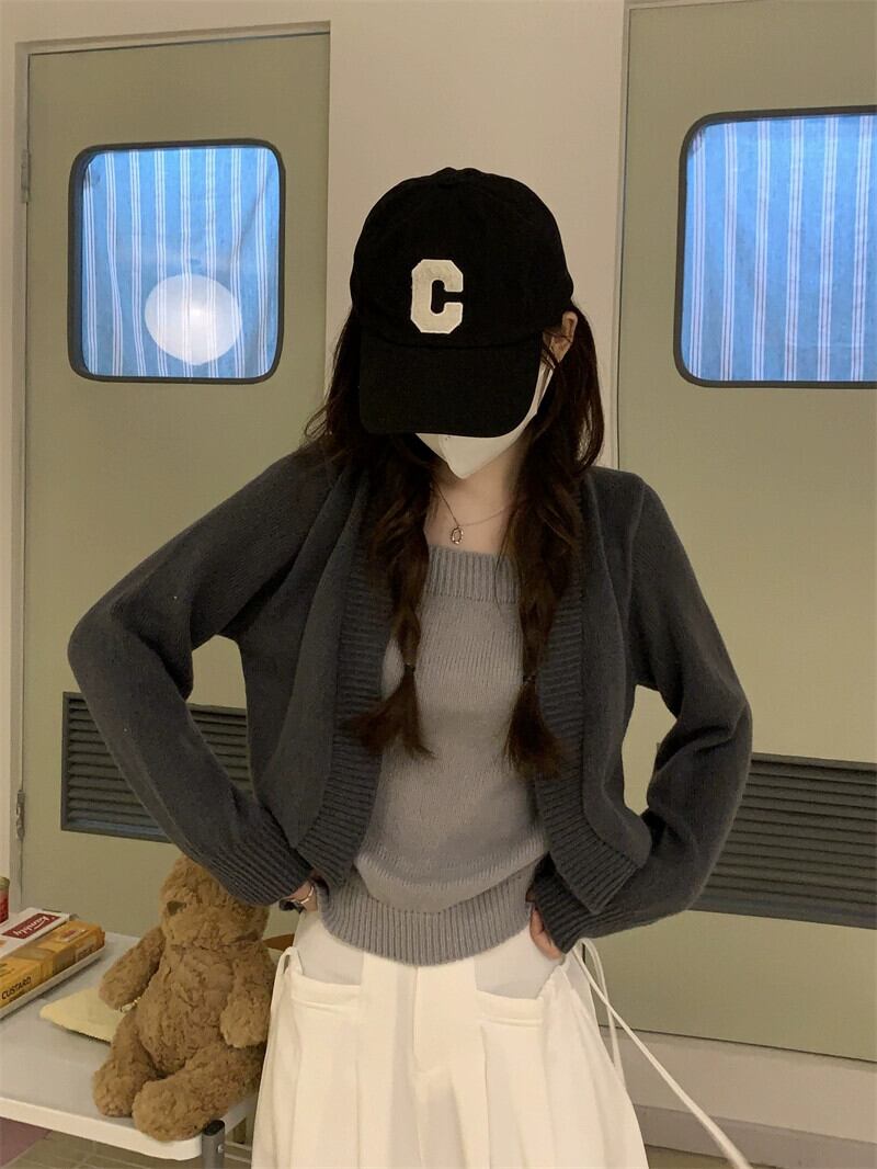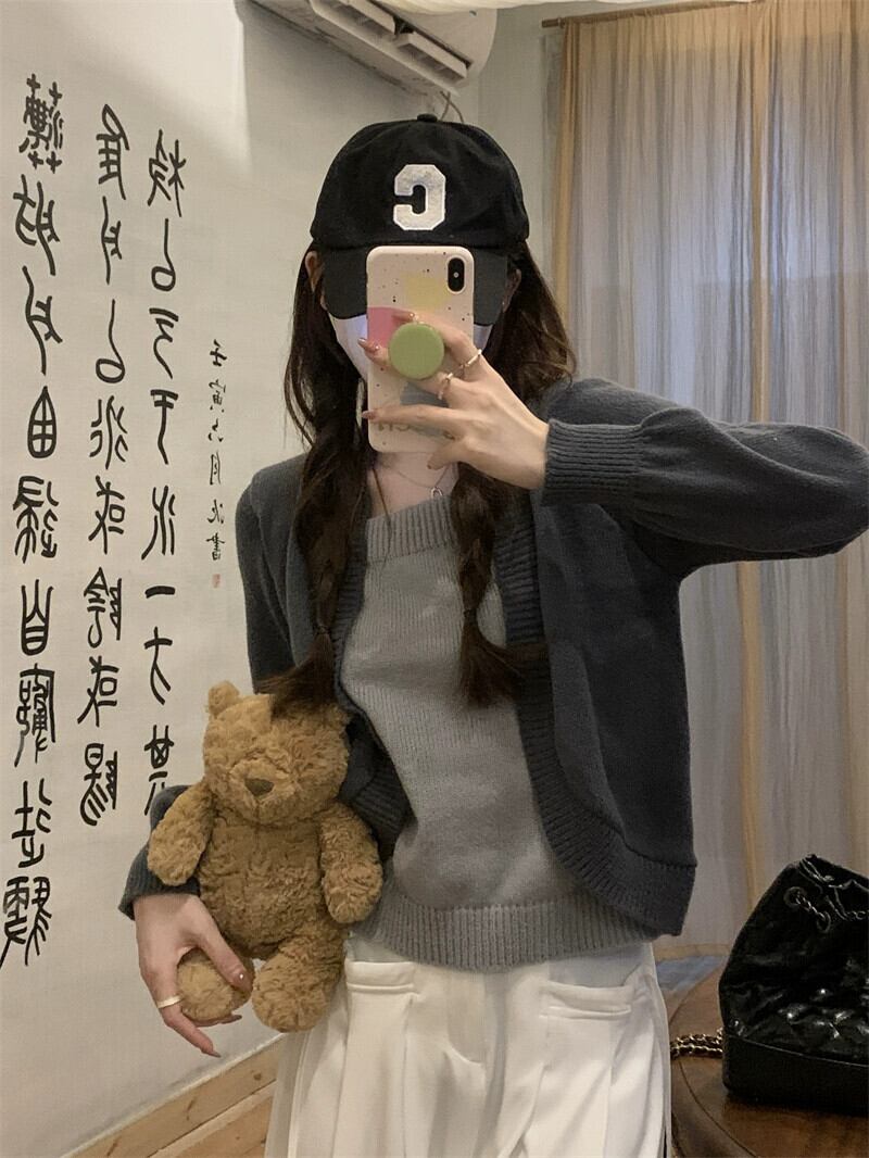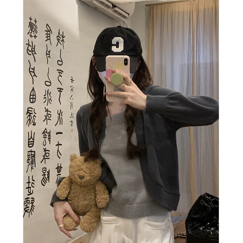 偽ツーピースニットセーター女性秋冬 2023 新しいルーズアウターウェアスリミングショートスクエアカラートップグレー オータム 秋物 ウィンター 冬物 スクウェア 7460046233955895 | framboise21