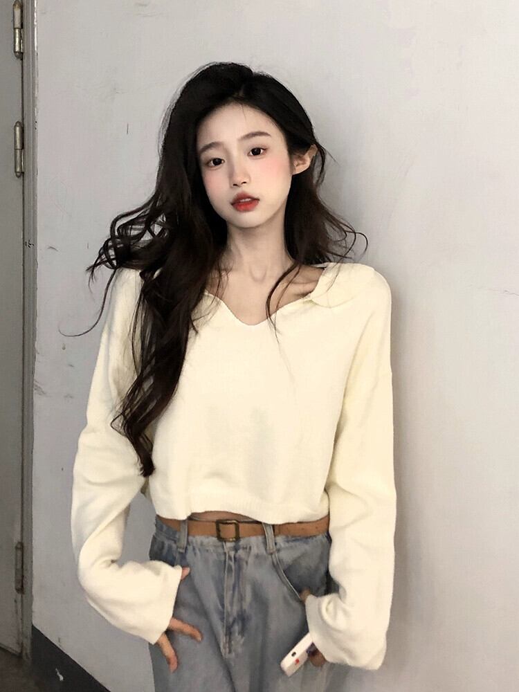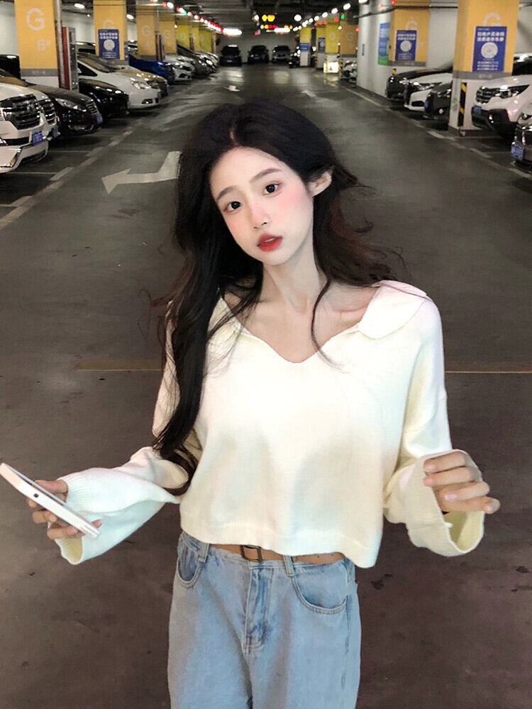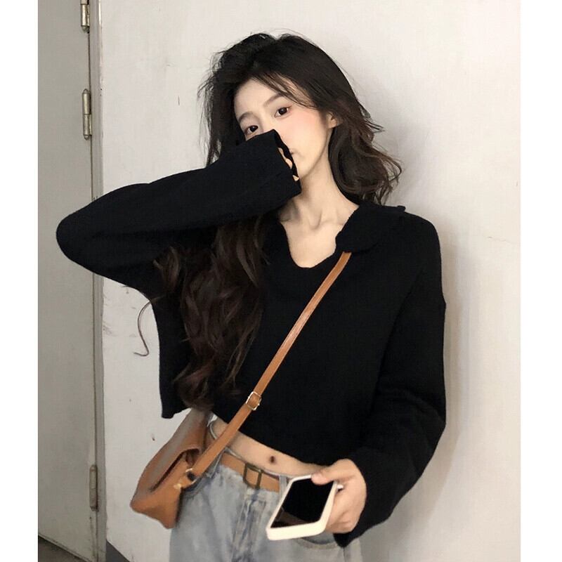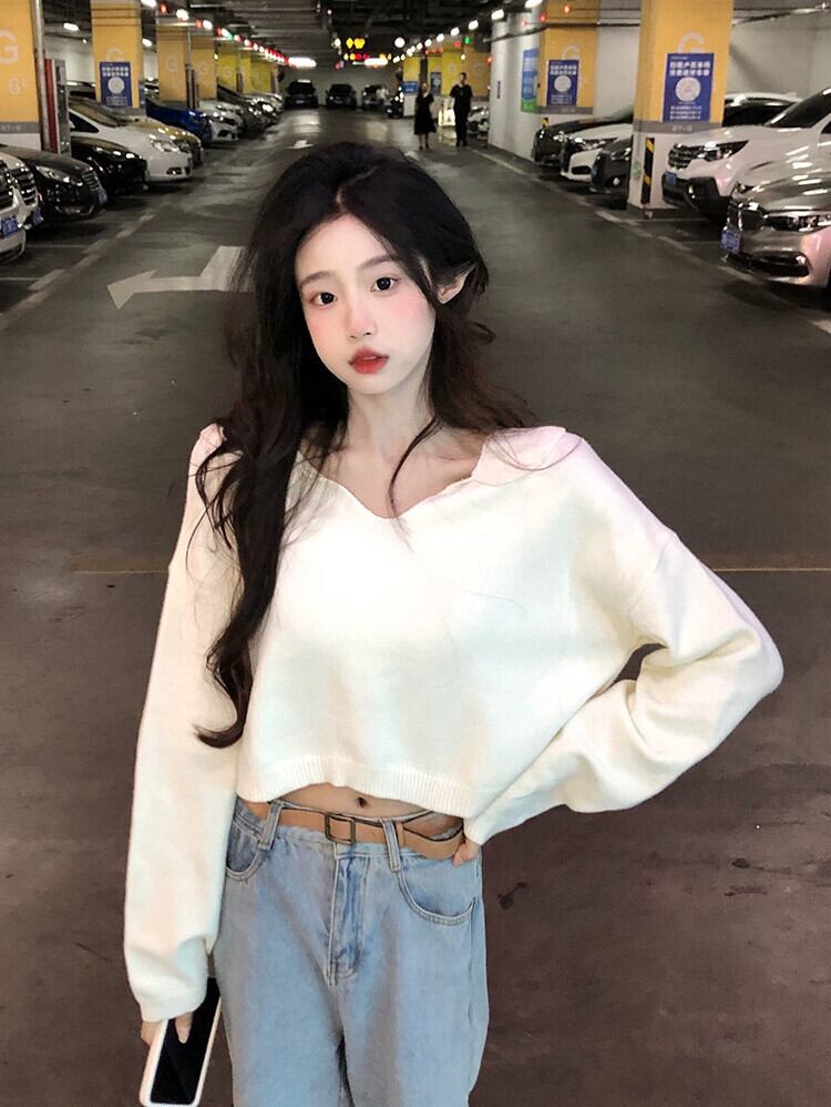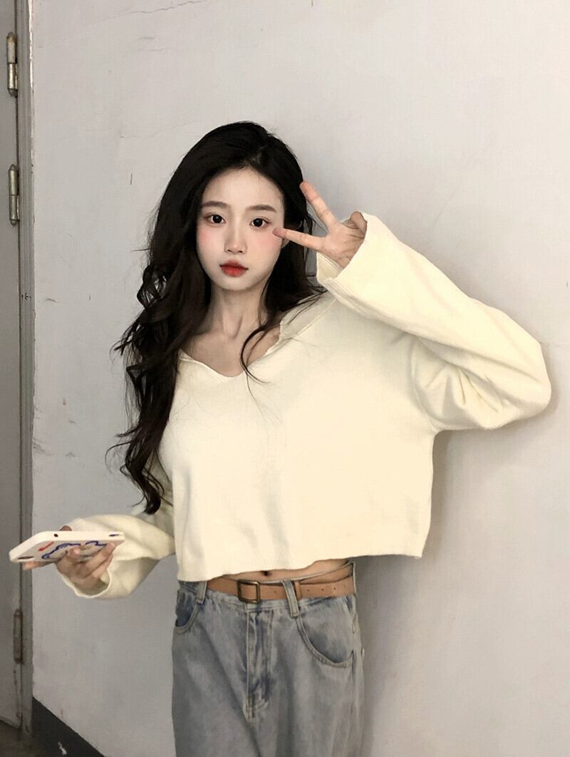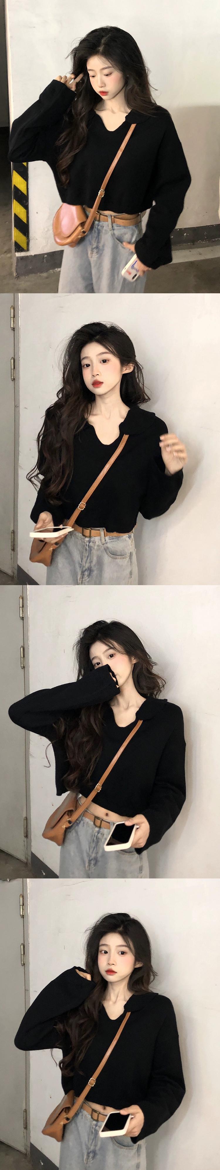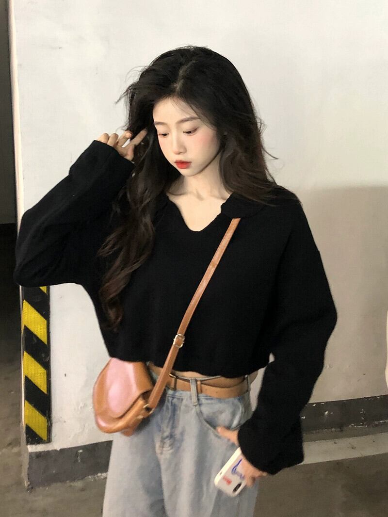 黒のショート V ネック セーター レディース、春と秋、怠惰なスタイル、ルーズなアウターウェア、スリムで多用途、長袖セーター リトルピープル ロング ブラック スプリング 春物 オータム 秋物 Vネック 7460093620147761 | framboise21