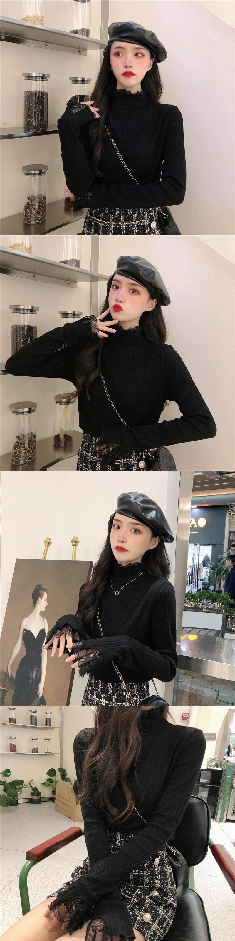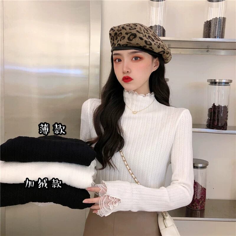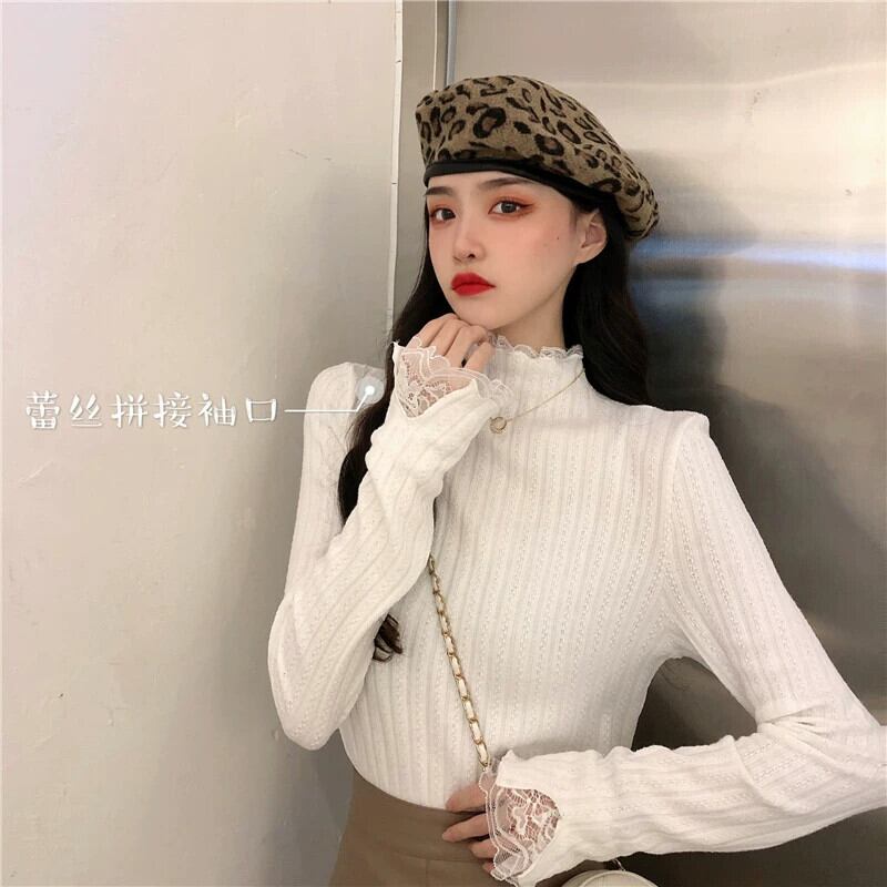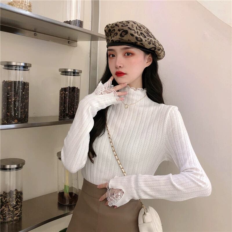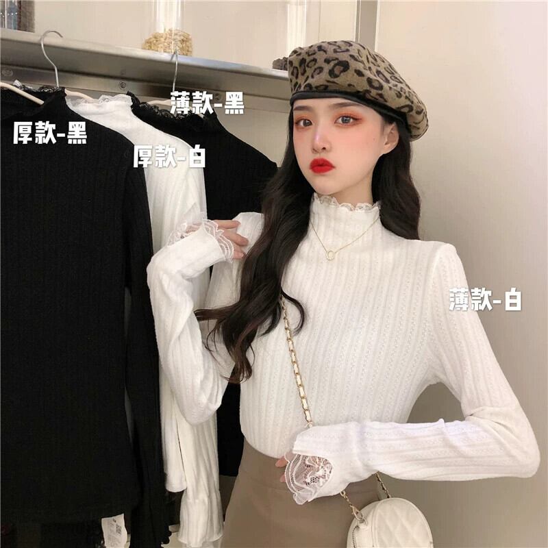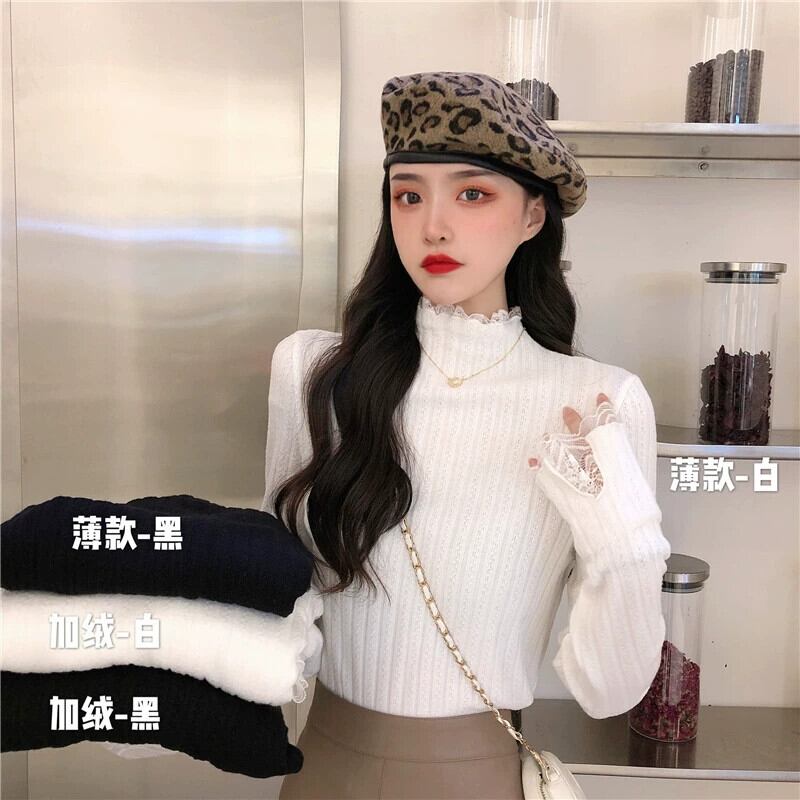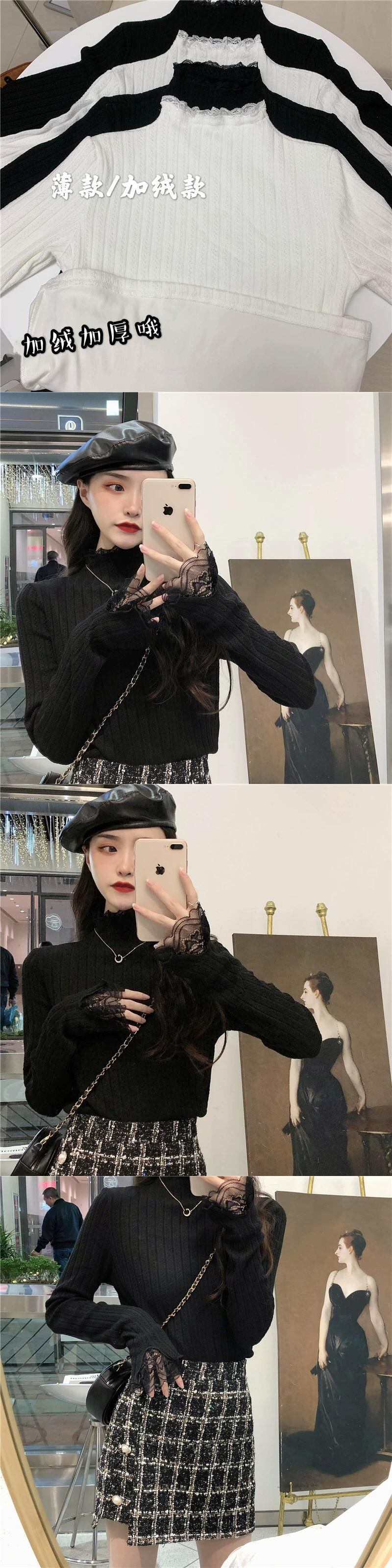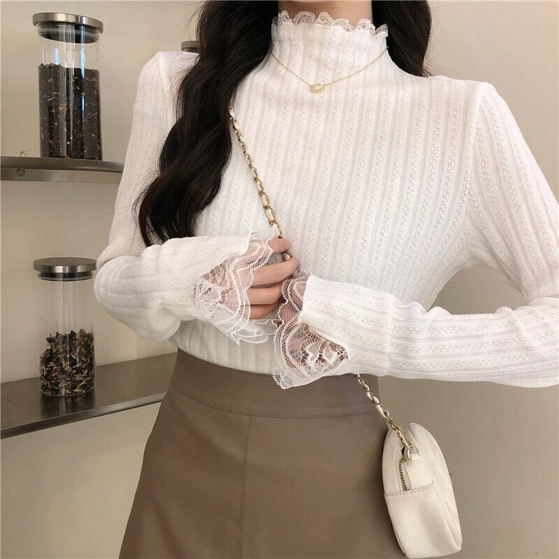 ベルベットと厚みのあるレースのハーフタートルカラーボトリングシャツ女性、秋と冬のファッショナブルでスリムフィット、長袖ニットセーター付き、白 ロング ホワイト オータム 秋物 ウィンター 冬物 7460082290956748 | framboise21